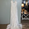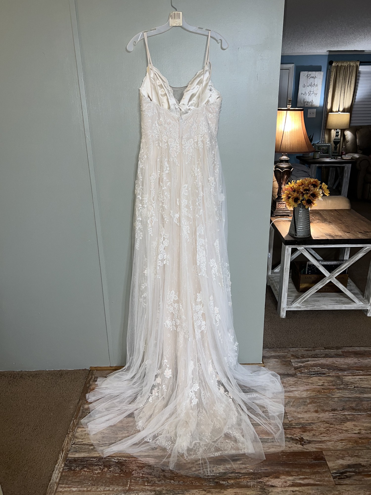 This is a beautiful Ivory/Champagne A-line dress that is appliquéd with pearl-centered blush flowers, beading, lace and tulle with a small train!