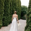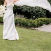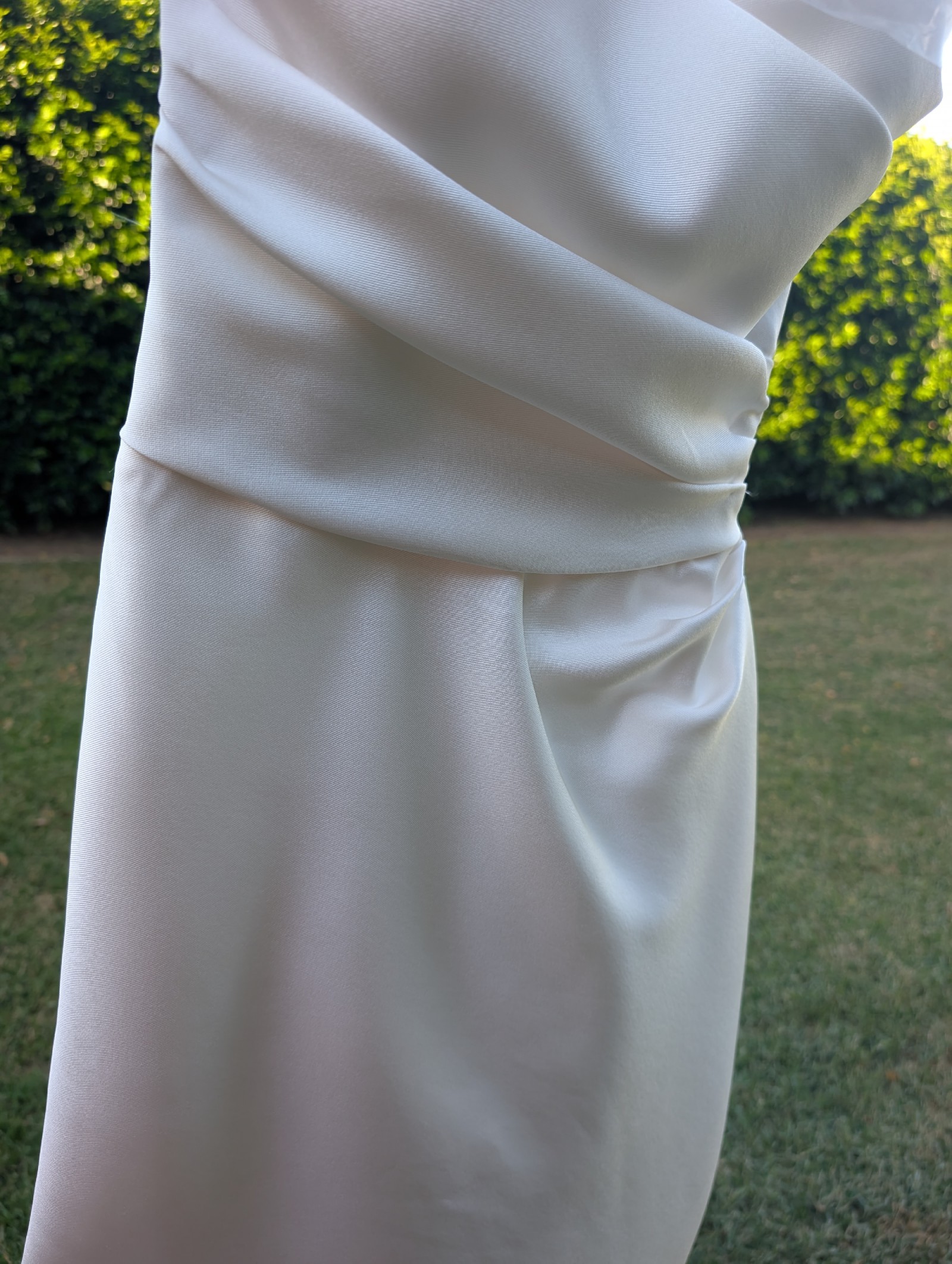 Super comfortable and classic design made of a gorgeous thick, ivory Mikado fabric. Fabric is cut on the bias, so the skirt moves beautifully when you walk. Fabric-covered buttons at the back are supported by internal clasps. The dress is lined and includes a ribbon bustle for your wrist. Professionally dry cleaned and spotless! Comes with original dust bag.
