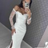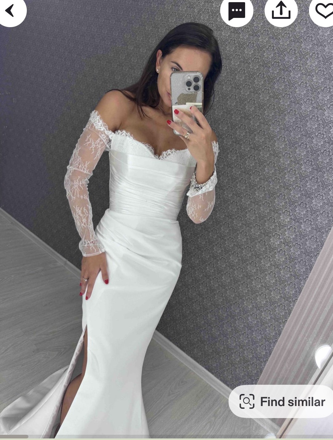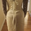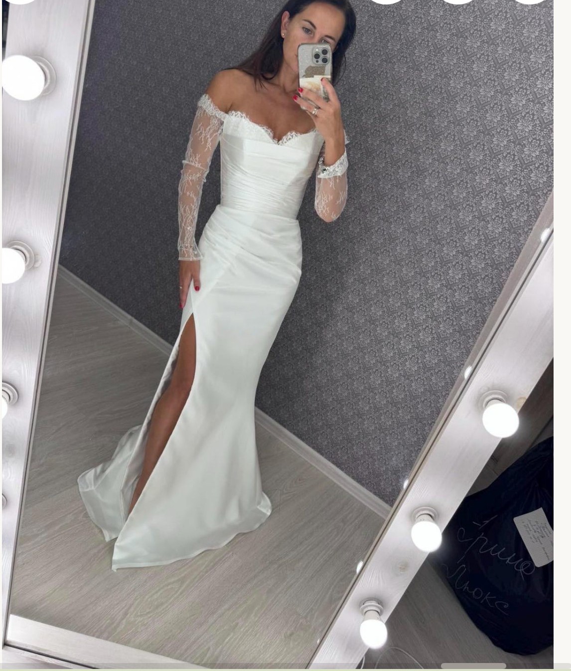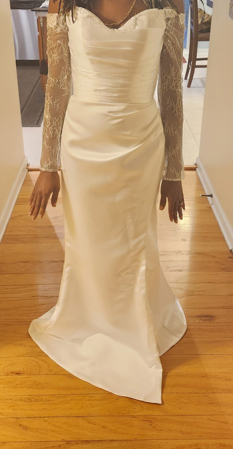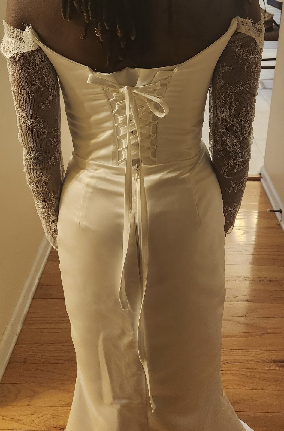 Ivory Satin Wedding Dress: Chantilly Lace Sleeves, Off-Shoulder Corset and slit. The color of the fabric is ivory satin and Chantilly lace.