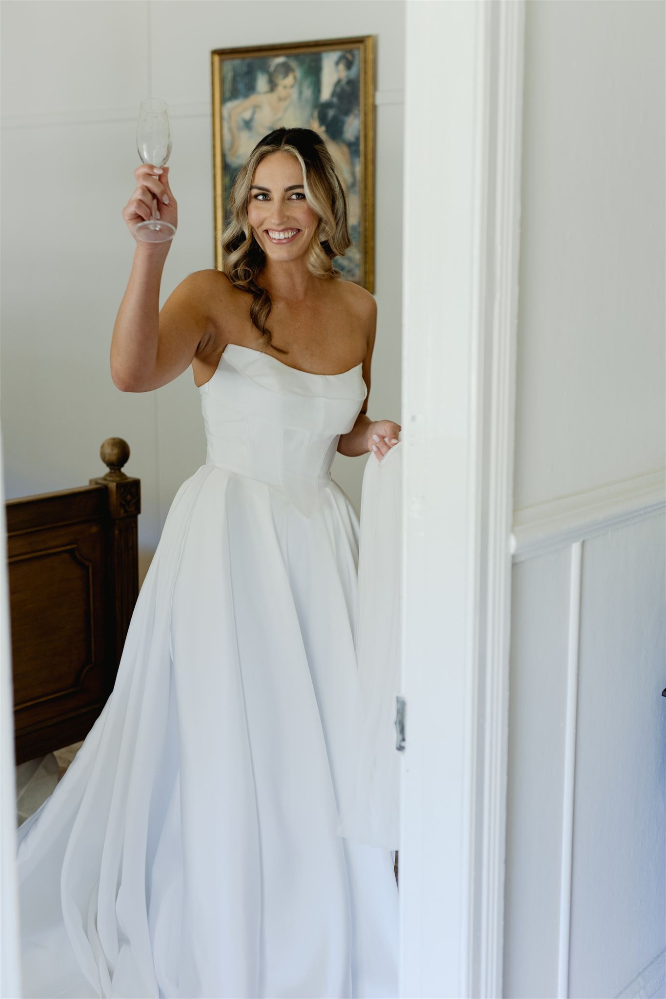 One of my favourite parts is the slit, it’s not too high, looks amazing in photos, and you can totally hide it when you’re standing still if you want a more classic vibe. The dress is floor length with a train that falls so nicely behind you, and when it’s bustled up it still looks gorgeous and really easy to move in.