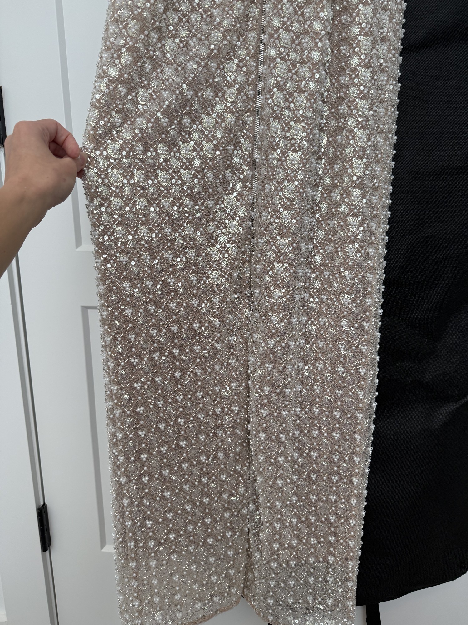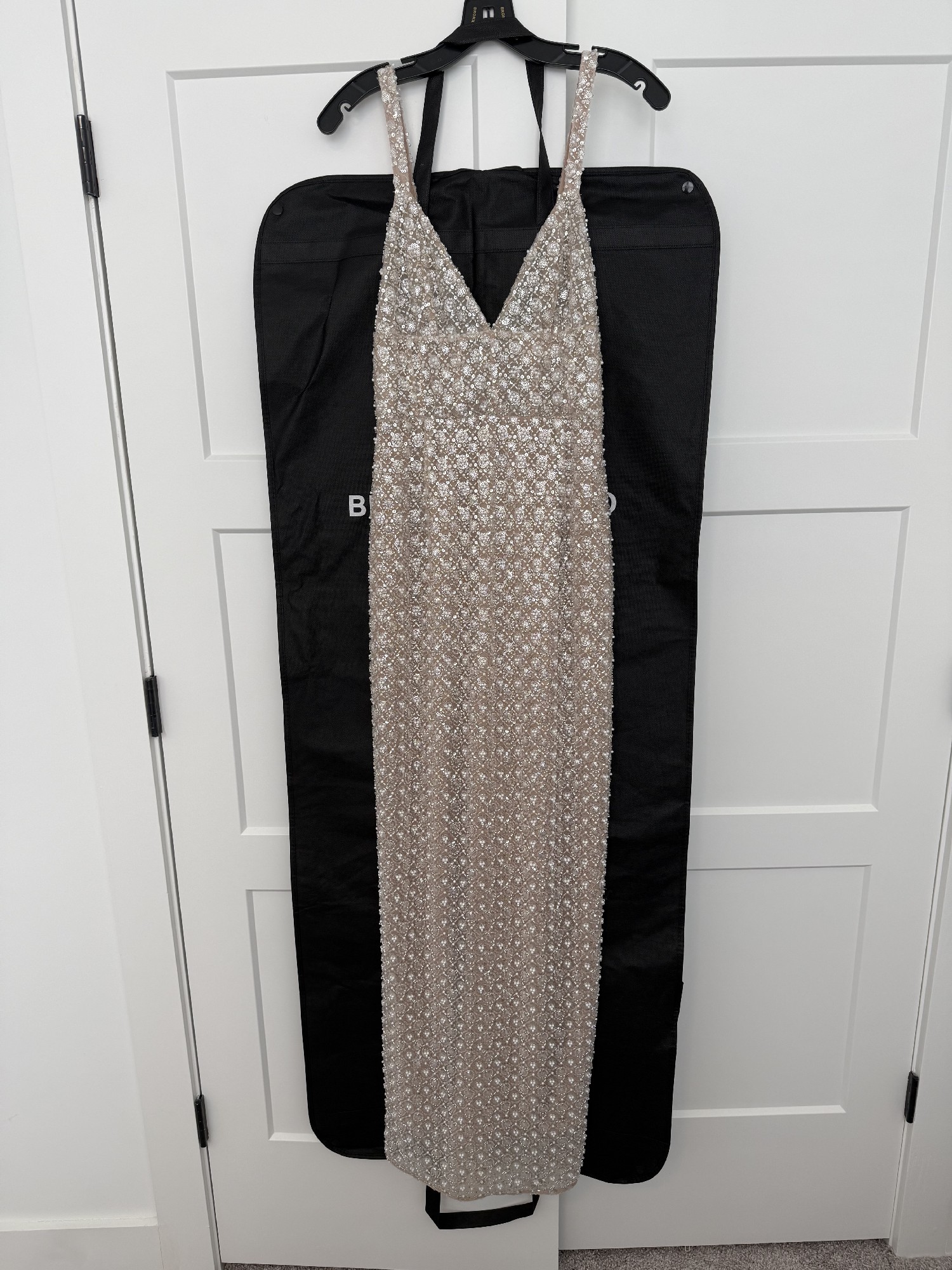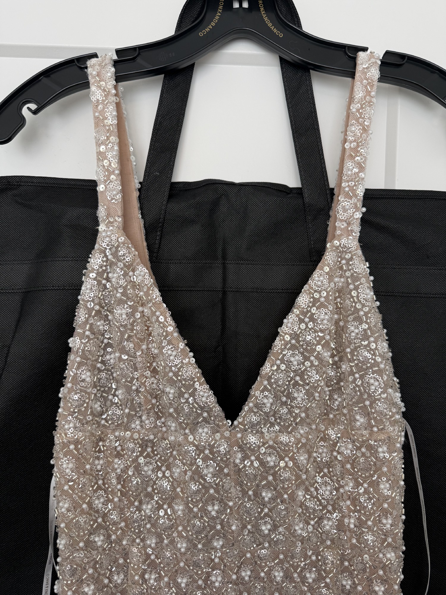 Bronx and Banco Allegra silver sequin maxi- size small. Worn once for my reception for a few hours and dry cleaned. In excellent condition - no flaws or defects. Sold out online. Straps are adjustable. Never altered