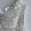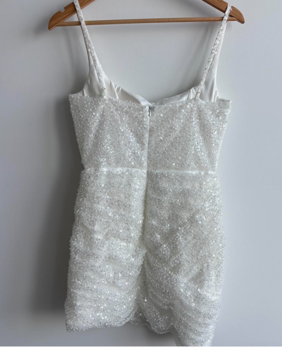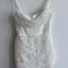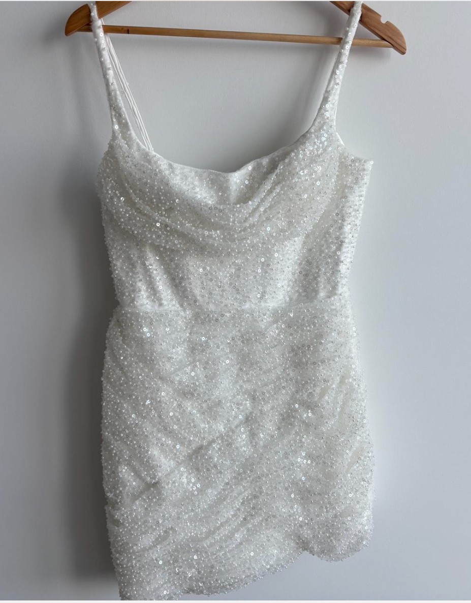 Featuring a scooped neckline with a delicate drape over a boned bodice, in the popular mini length.