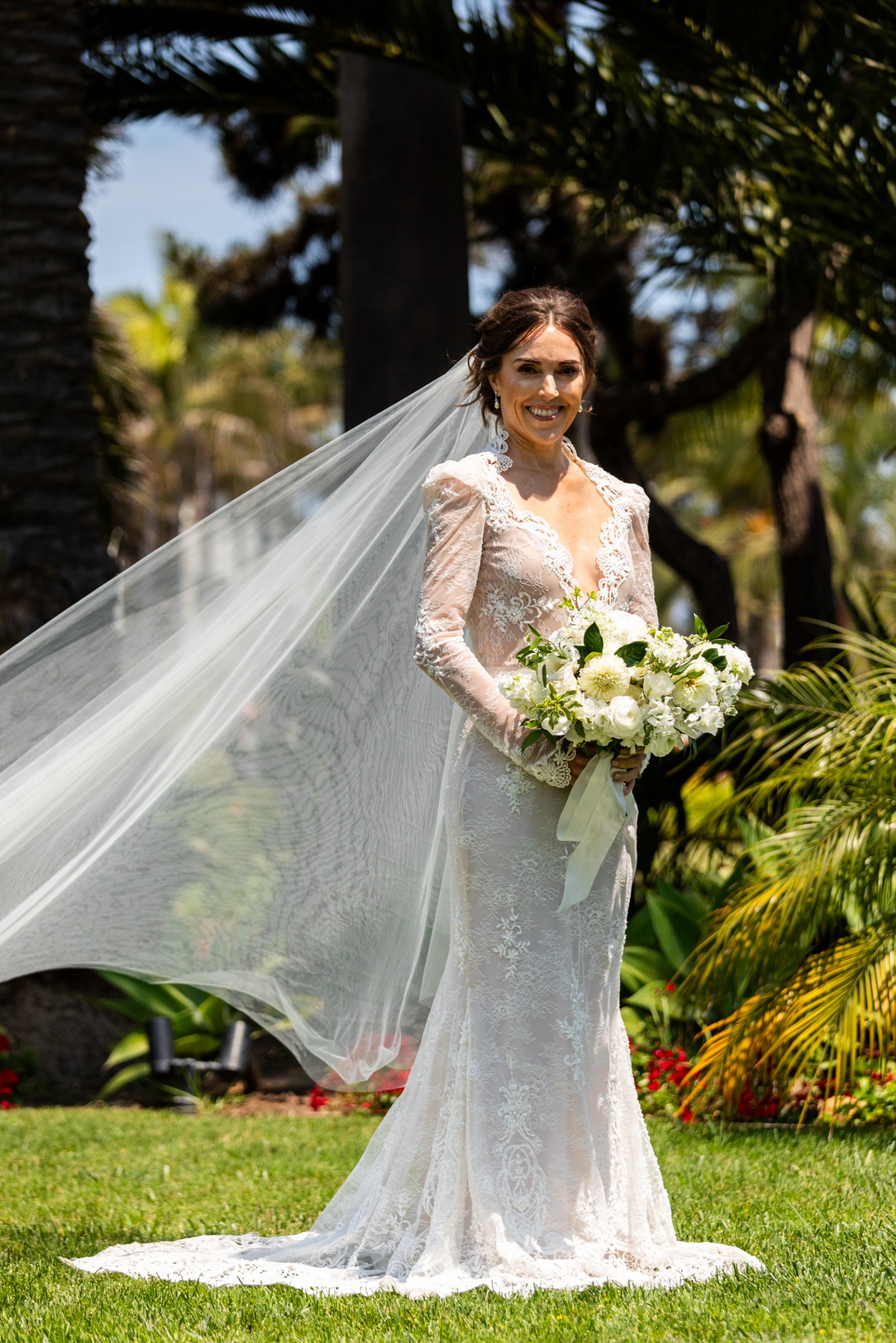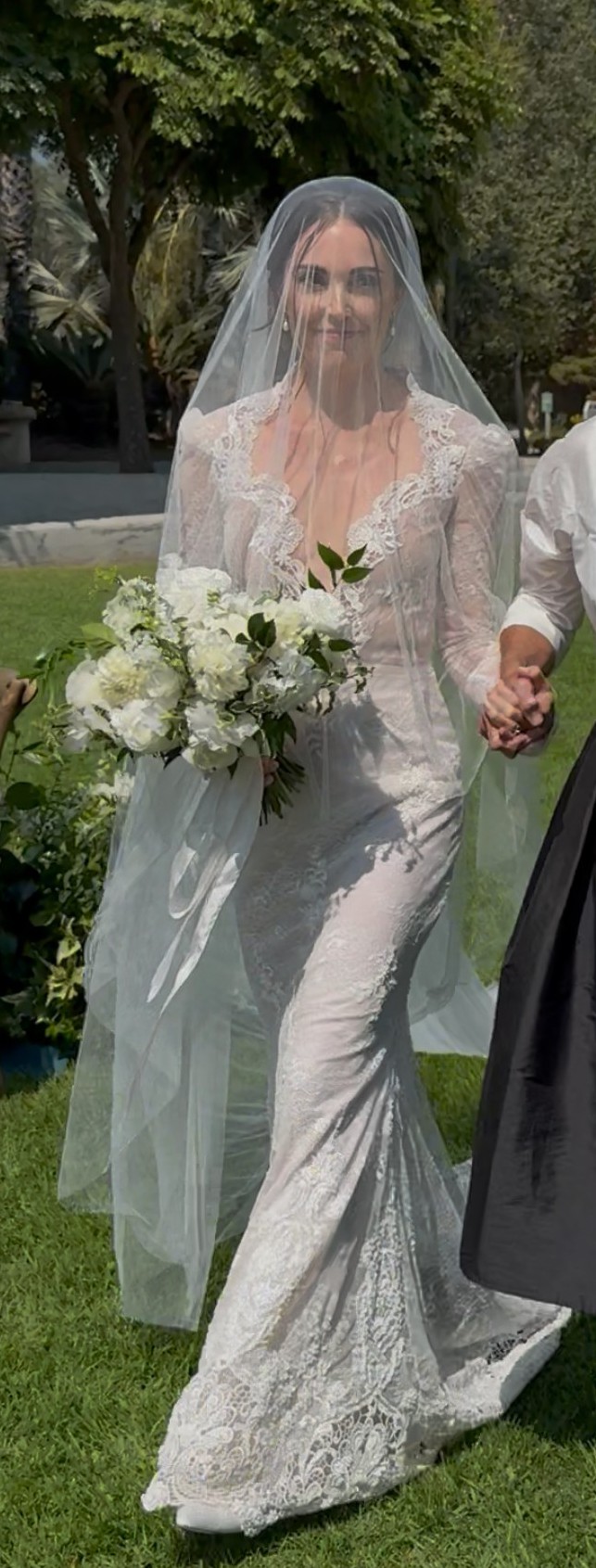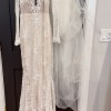 The dress comes with a Sara Gabriel "Stephanie" veil, cathedral-length, featuring a soft, folded mantilla-style top. Made from Sara Gabriel’s signature tulle in pale ivory, it measures 120 inches (and the blusher measures 40 inches). I wore this veil once for my wedding ceremony. It’s in excellent condition with no tears, snags, or discoloration.