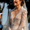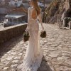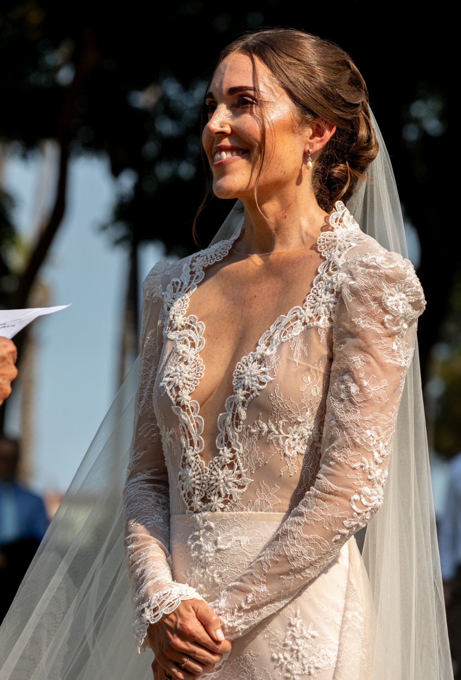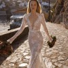 This is the Nami gown by Liz Martinez: an ethereal, romantic lace dress with a plunging V-neckline, long sleeves, and delicate appliqué detailing throughout. The silhouette is a fitted fit-and-flare that flows into a soft, graceful train.