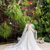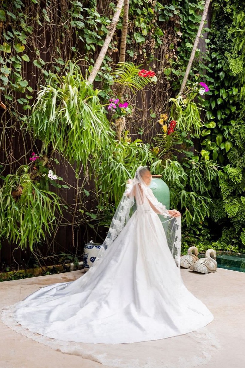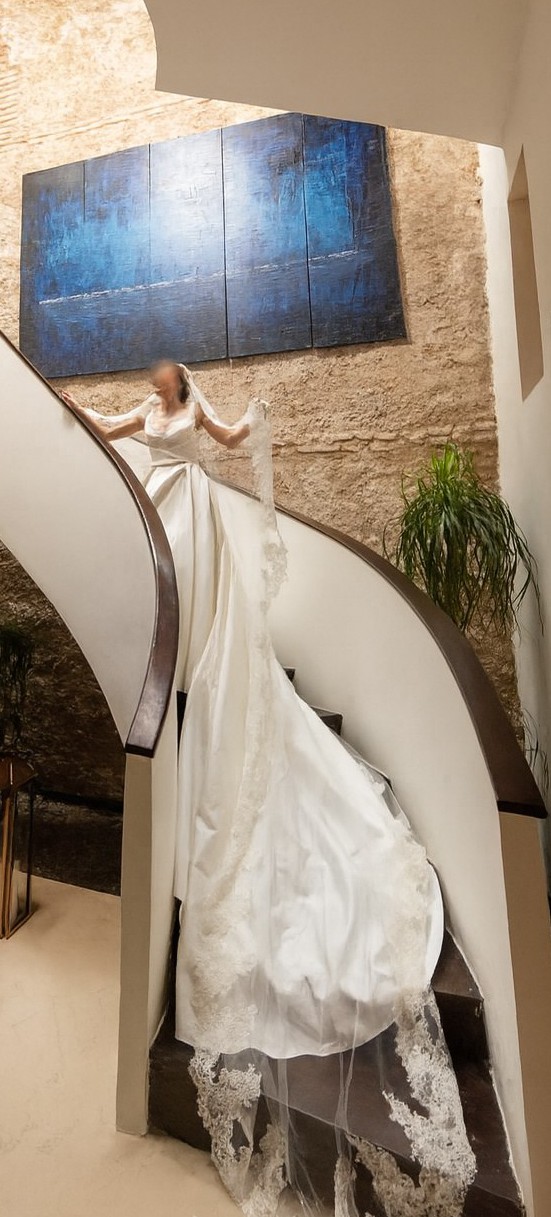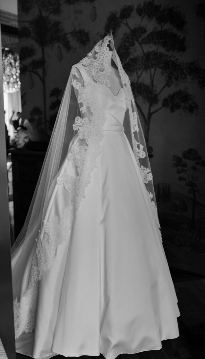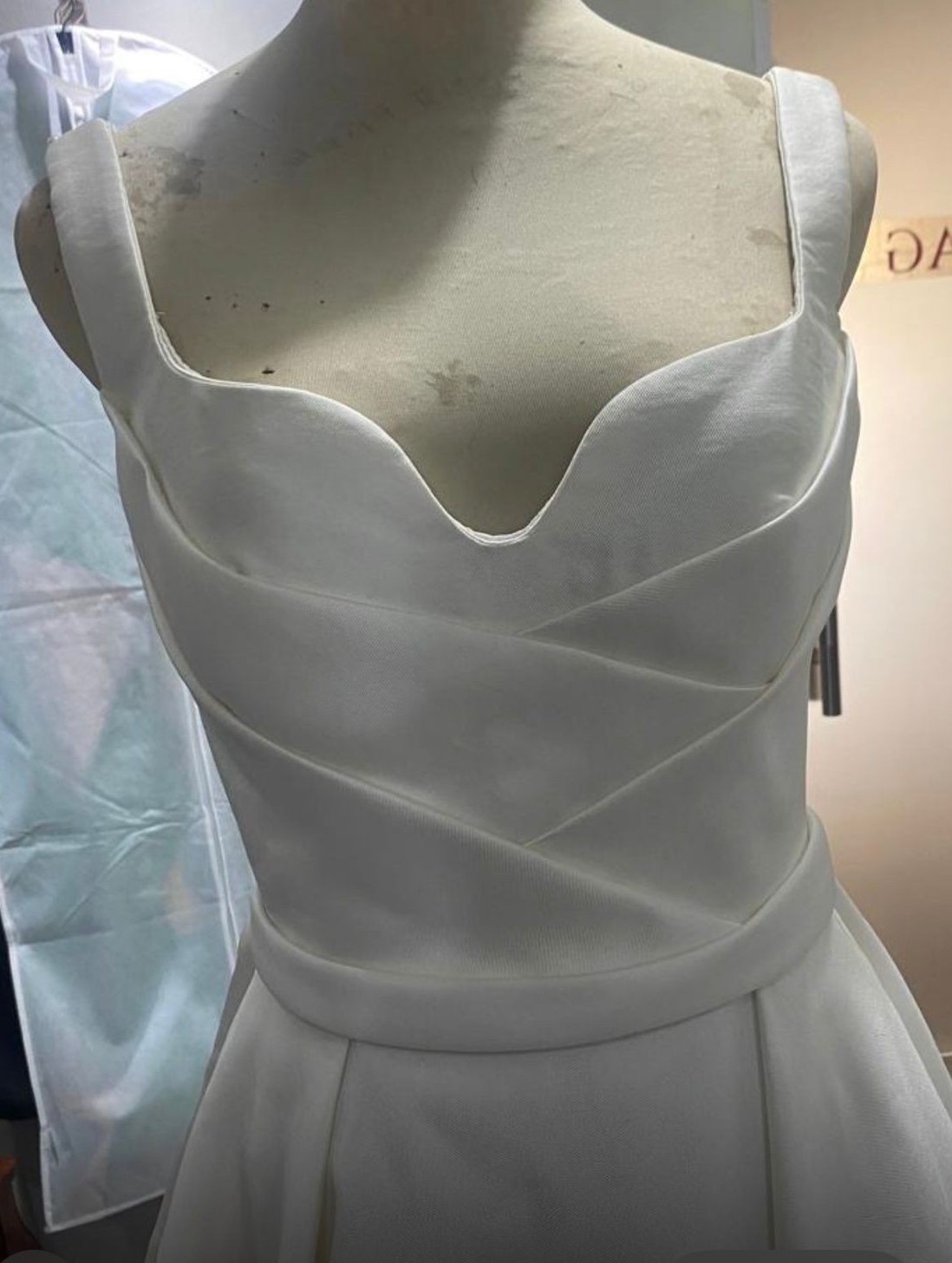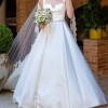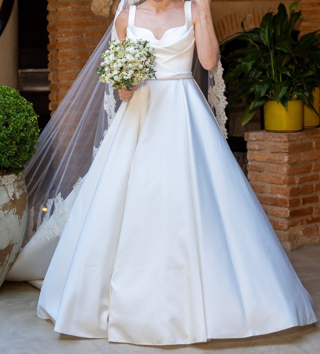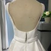 Elegant ivory mikado ballgown by Elie Saab, purchased in 2024. The bodice has wide straps, a soft sweetheart neckline, and diagonal pleating that cinches the waist, leading into a full A line skirt with a long train and buttons down the back. The hem and shoulder straps were professionally altered for length and the dress was tailored to approximately a US 4 (bust 33 in, waist 28 in, hips 41 in). Worn once for the wedding and kept in excellent condition.