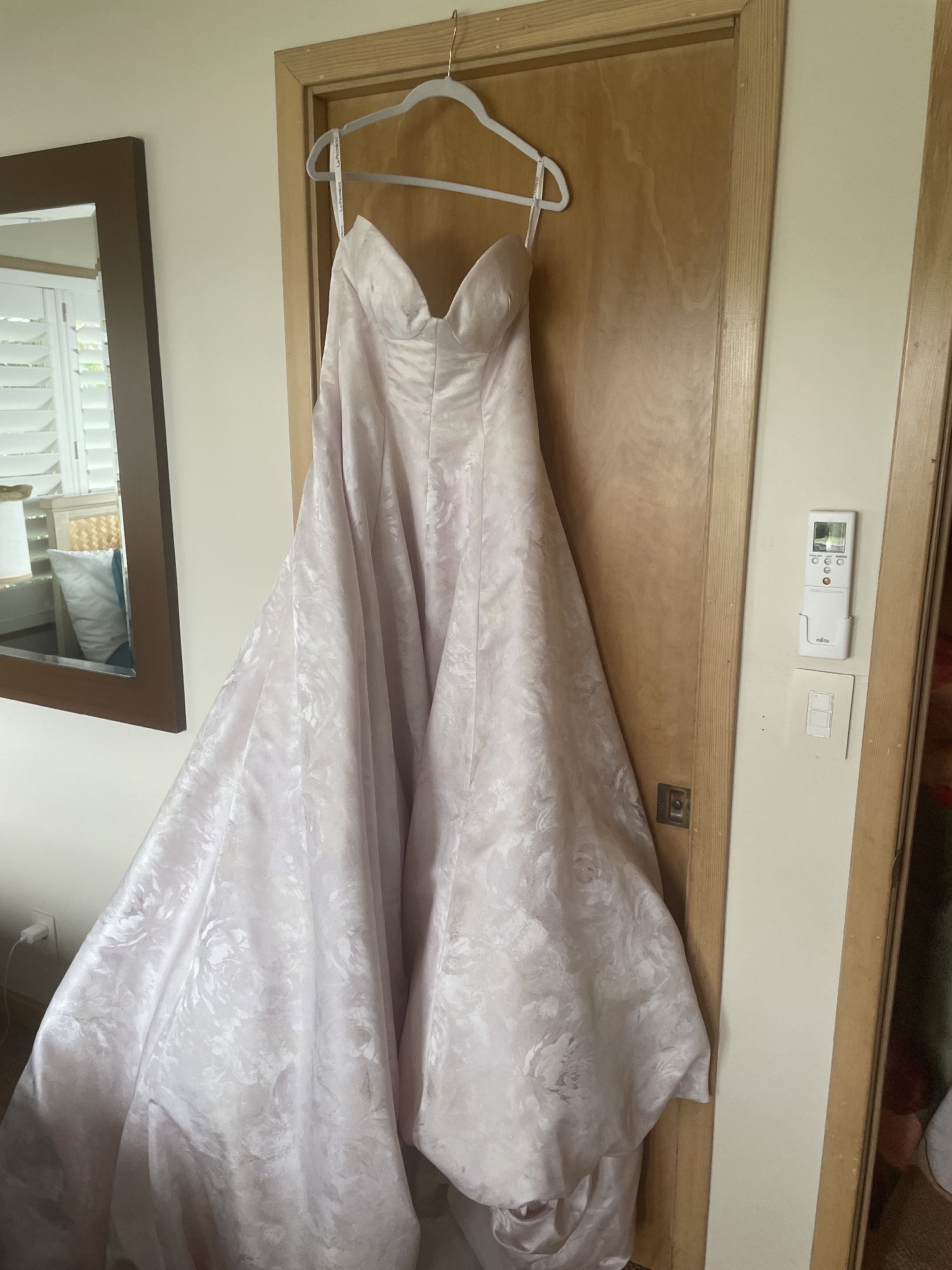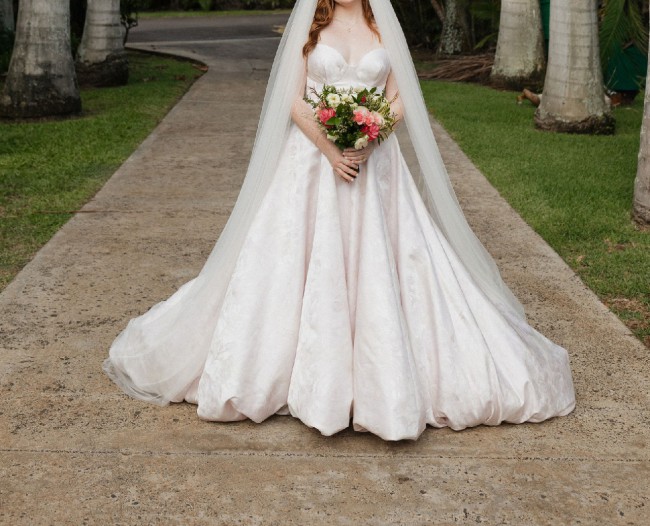 Selling my beautiful La Premiere Abony gown, a softly colored jacquard strapless ballgown with a bubble hem in a very light blush pink. It has a romantic, soft sheen and looks stunning in photos and in person.