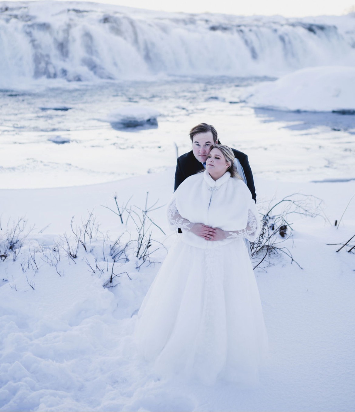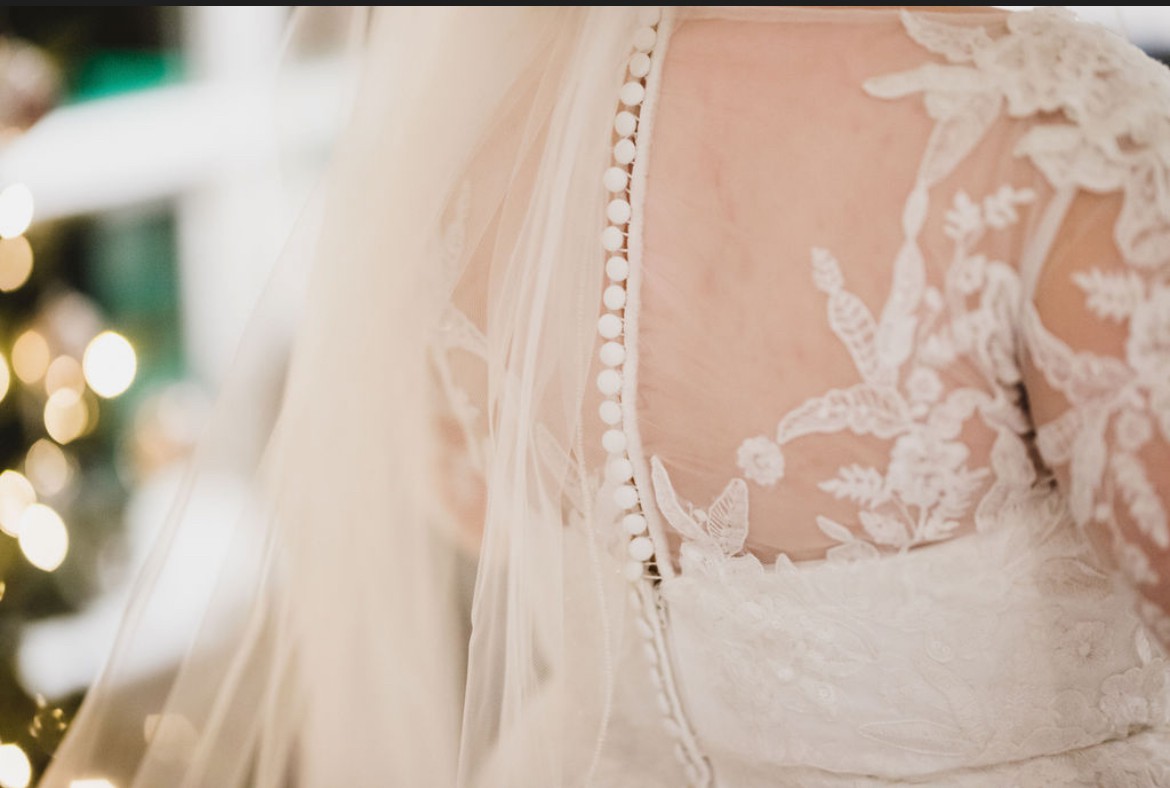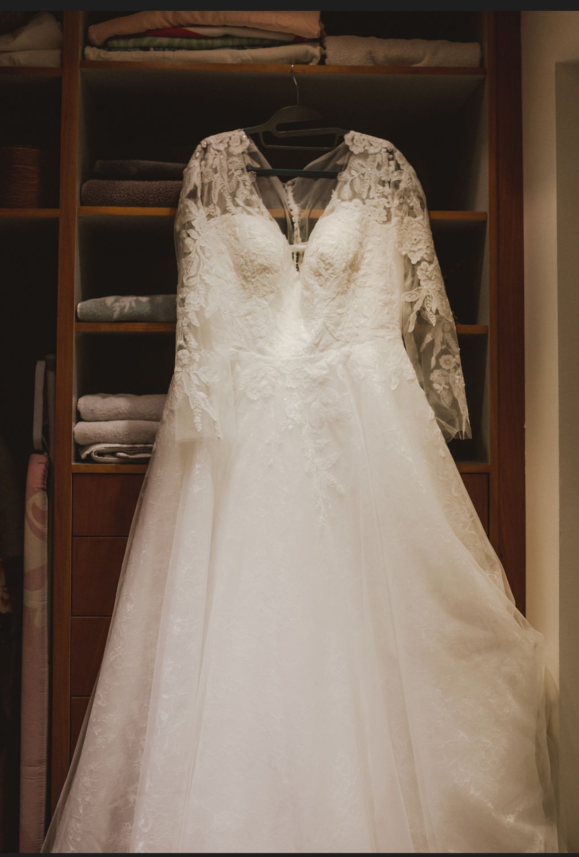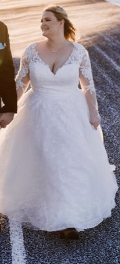 Perfect for a winter bride with long lace sleeves, featuring beautiful buttons along the back and wrists. This dress was originally purchased for a 2020 wedding. Due to the pandemic, the wedding was moved to December 2022, and was unbelievably magical. Paired with a faux-fur shawl, this multi-layered dress kept me warm in the frigid Iceland winter - despite it being the coldest day in Iceland since World War 1! As I part with this dress, it holds countless memories of love and joy. I can guarantee that it will be as magical for you as it was for me. Let it be part of your love story, and create your own unforgettable moments in this gorgeous gown. I hope it finds a bride who will cherish it as much as I have.