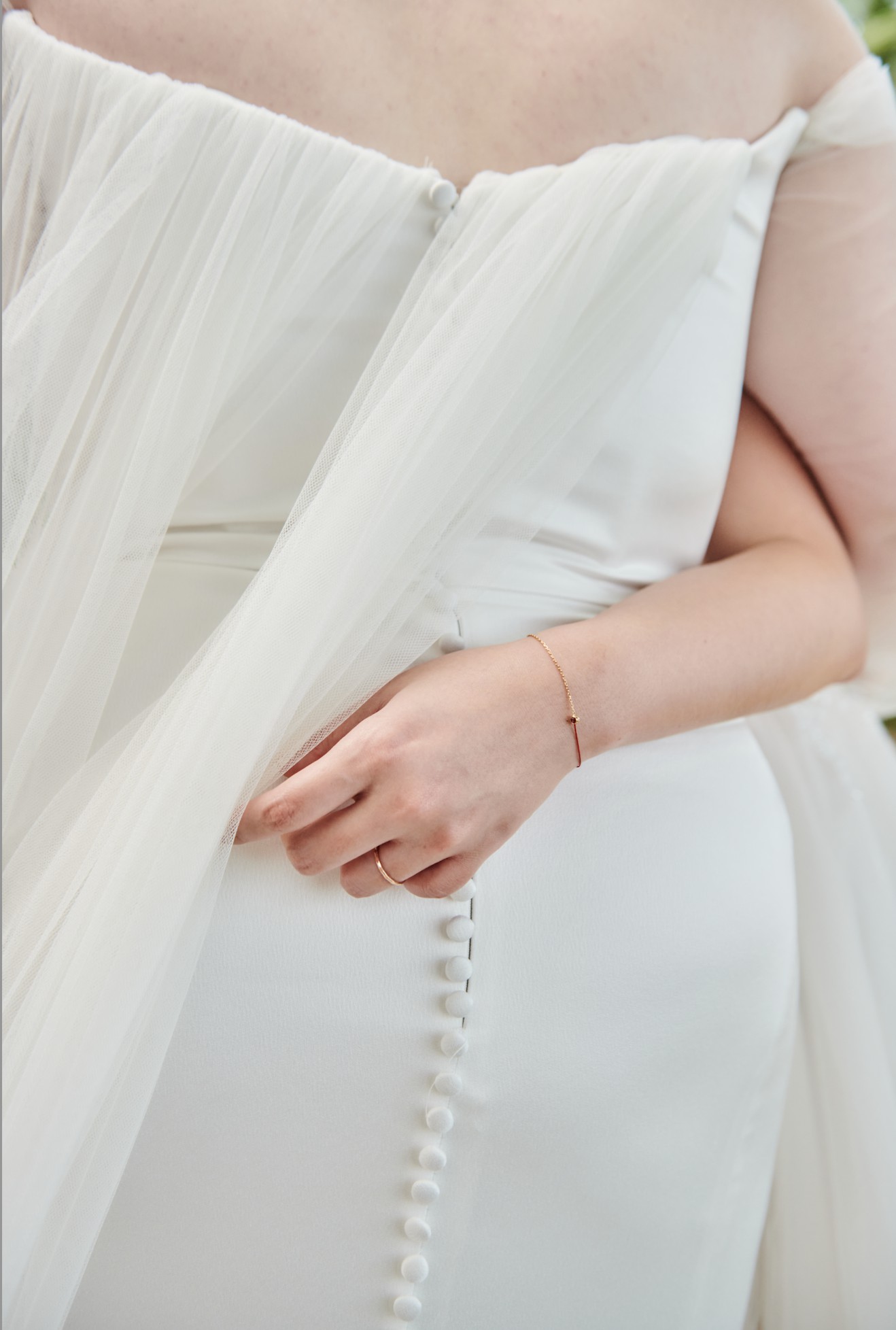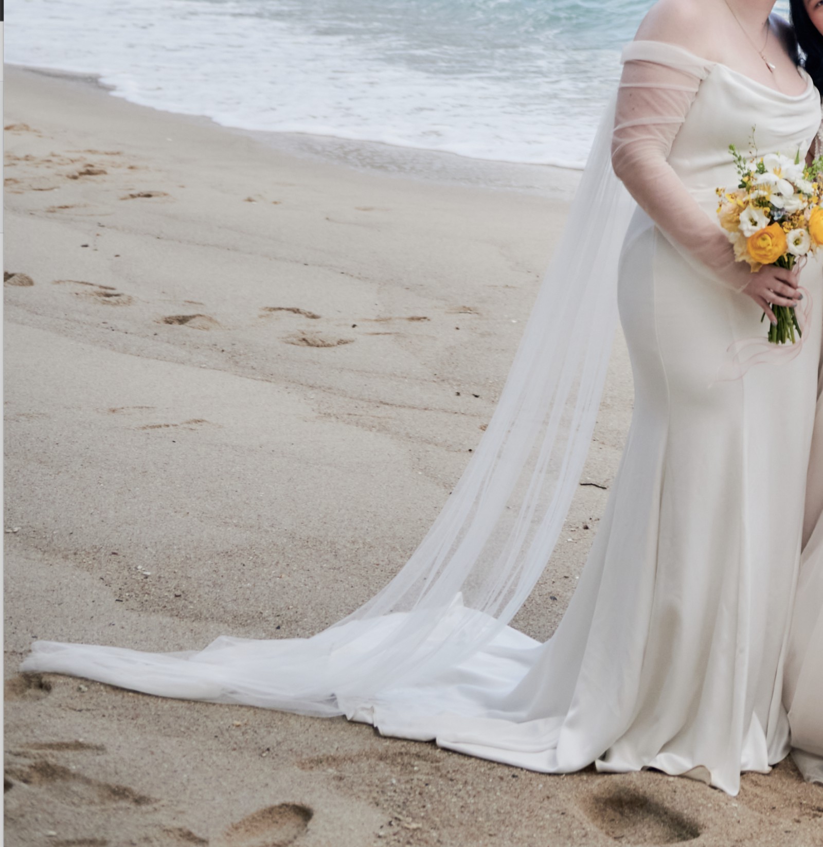 Draped off the shoulder long tulle sleeves
