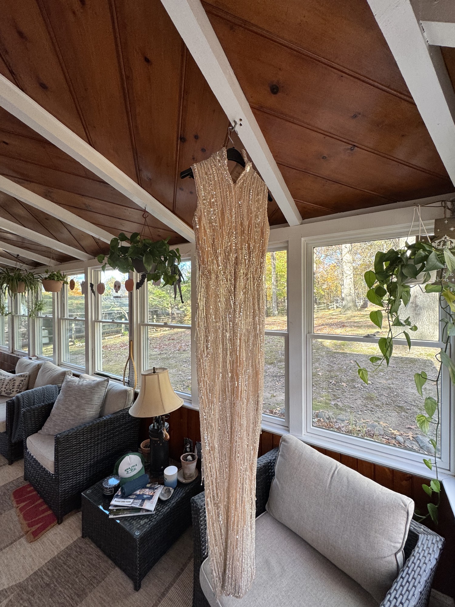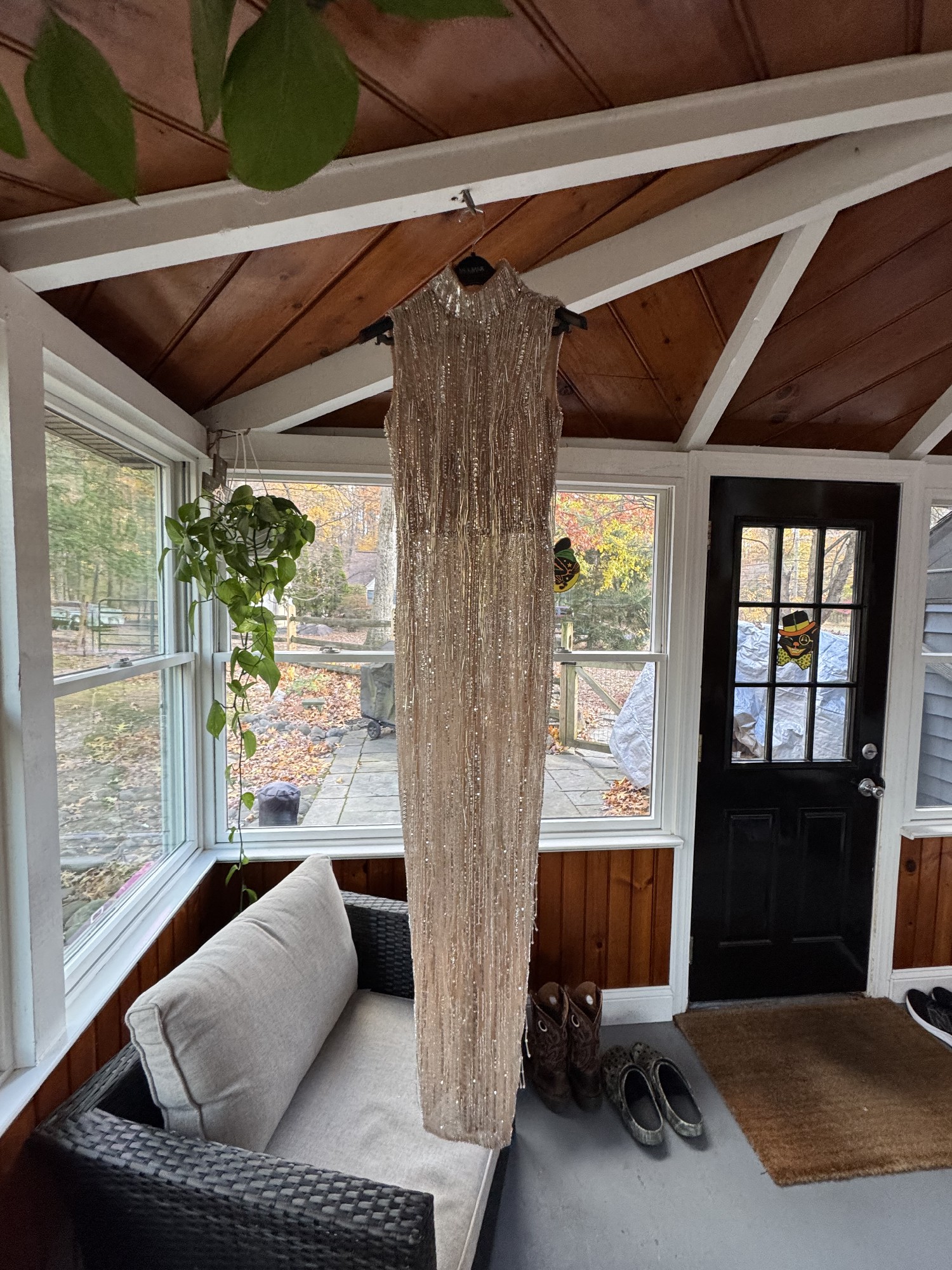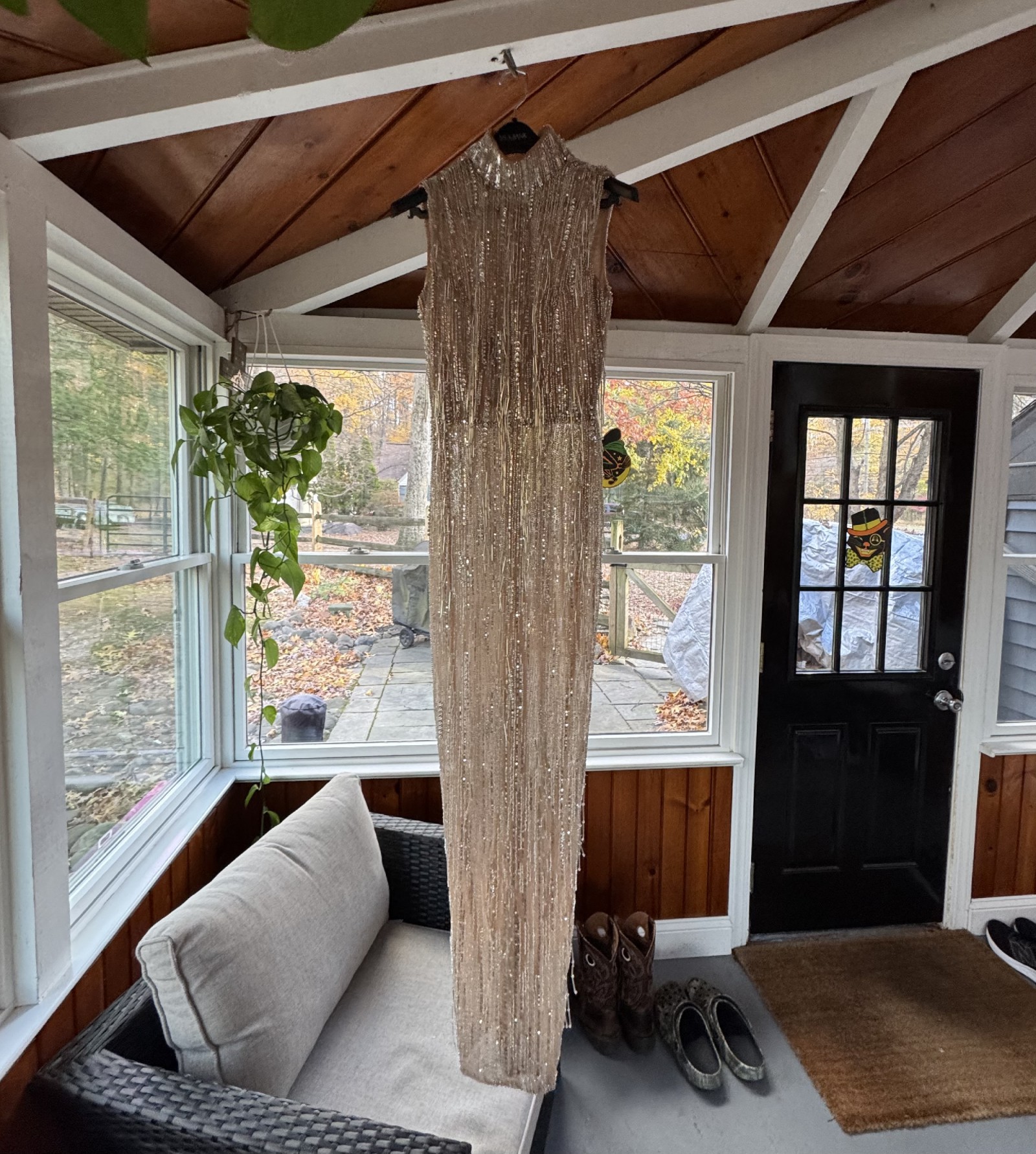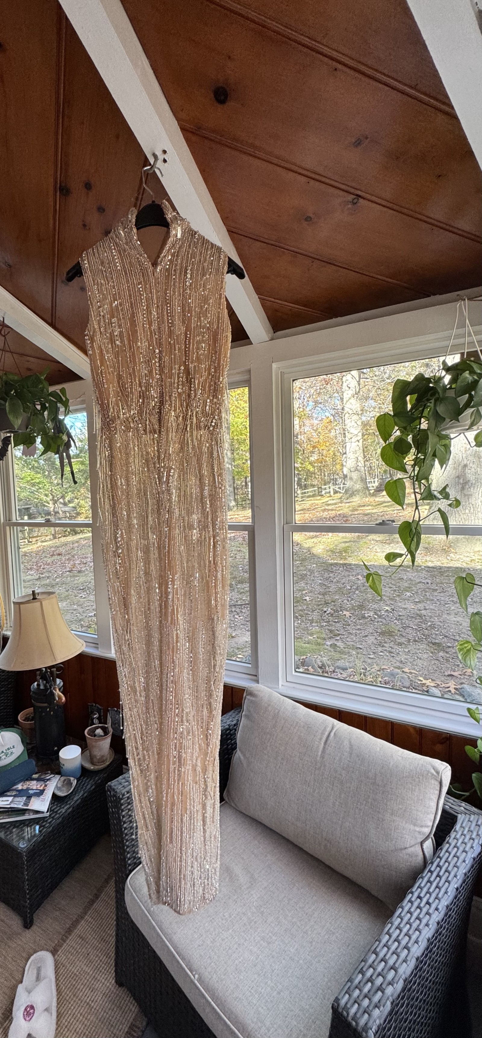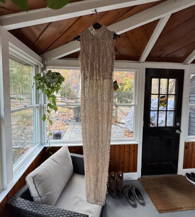 This is a high neck sleeveless design, nude sheer base with silver sequins. It has cascading beaded fringe for movement. The style of the dress is called the celeste fringe dress on Albina Dyla. It was incredibly beautiful when I wore it as my second dress for my wedding. I got so many compliments on it. I now would like to sell it to another bride that can feel special on her wedding day.