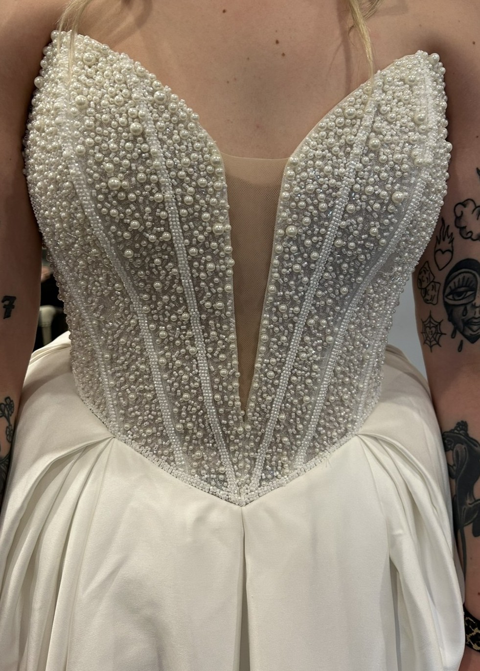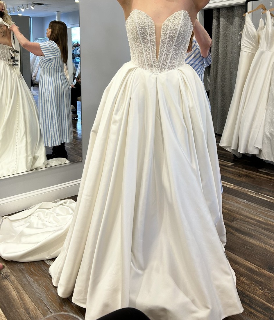 This stunning Maggie Sottero Tina dress made my wedding day a dream come true. The moment I slipped into this exquisite ballgown, I felt transformed. The beautiful ivory fabric drapes effortlessly, while the strapless curve neckline highlights the figure in just the right way. Designed with attention to detail, it features delicate beading and pearls that shimmer with a soft glow, capturing the light beautifully.