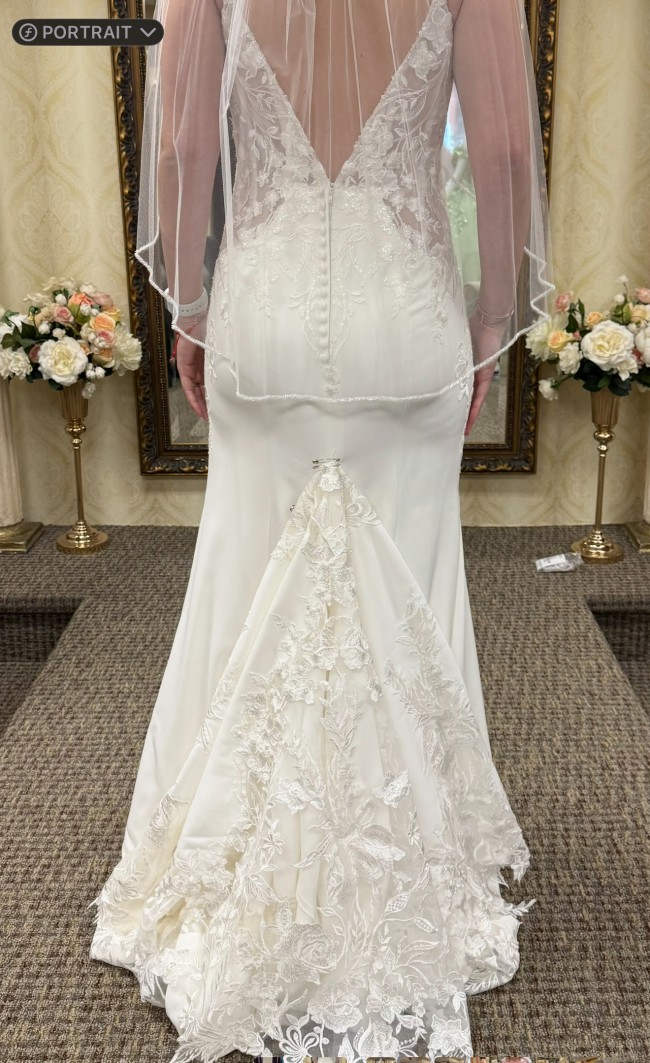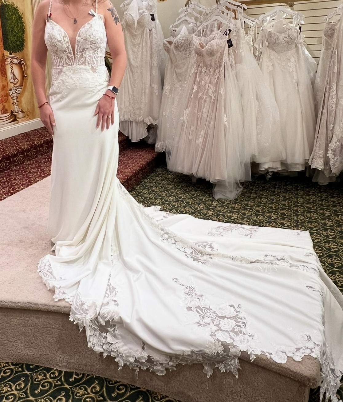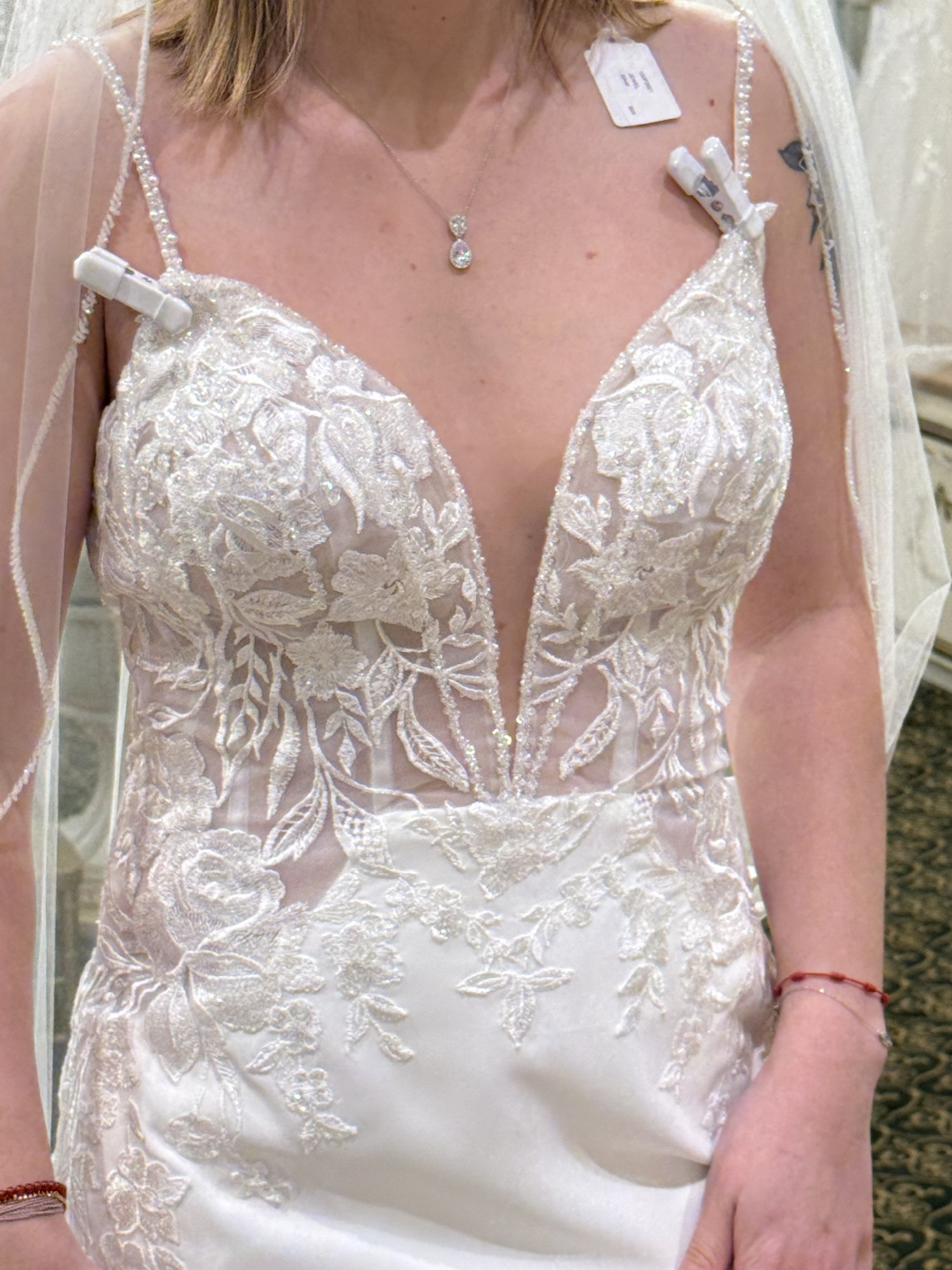 This is a brand new, never worn wedding dress. It was altered to add a Bussell and chest adjustments. It comes with a never worn veil.