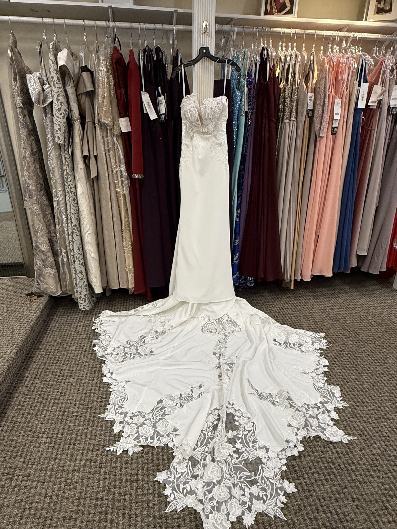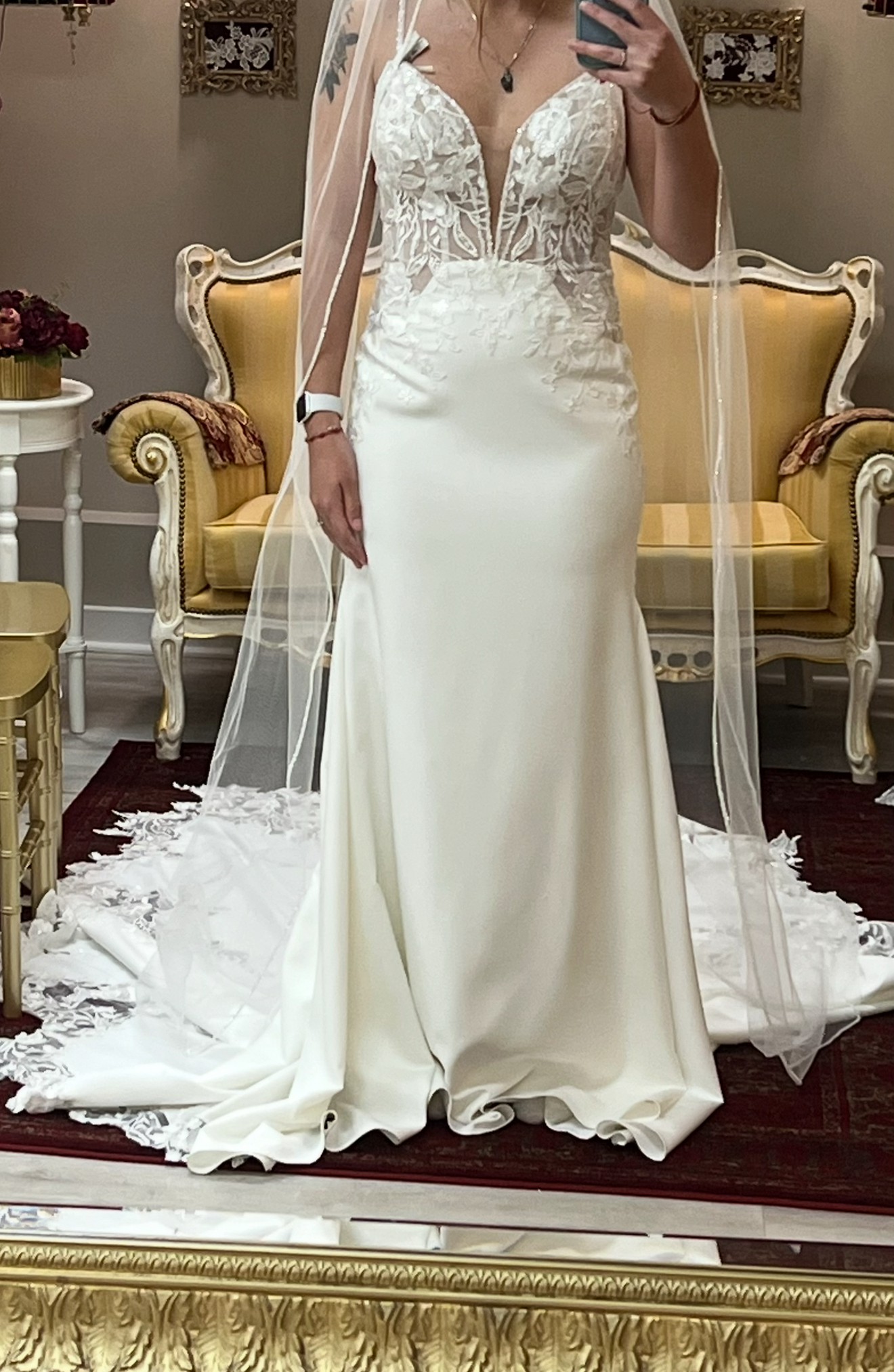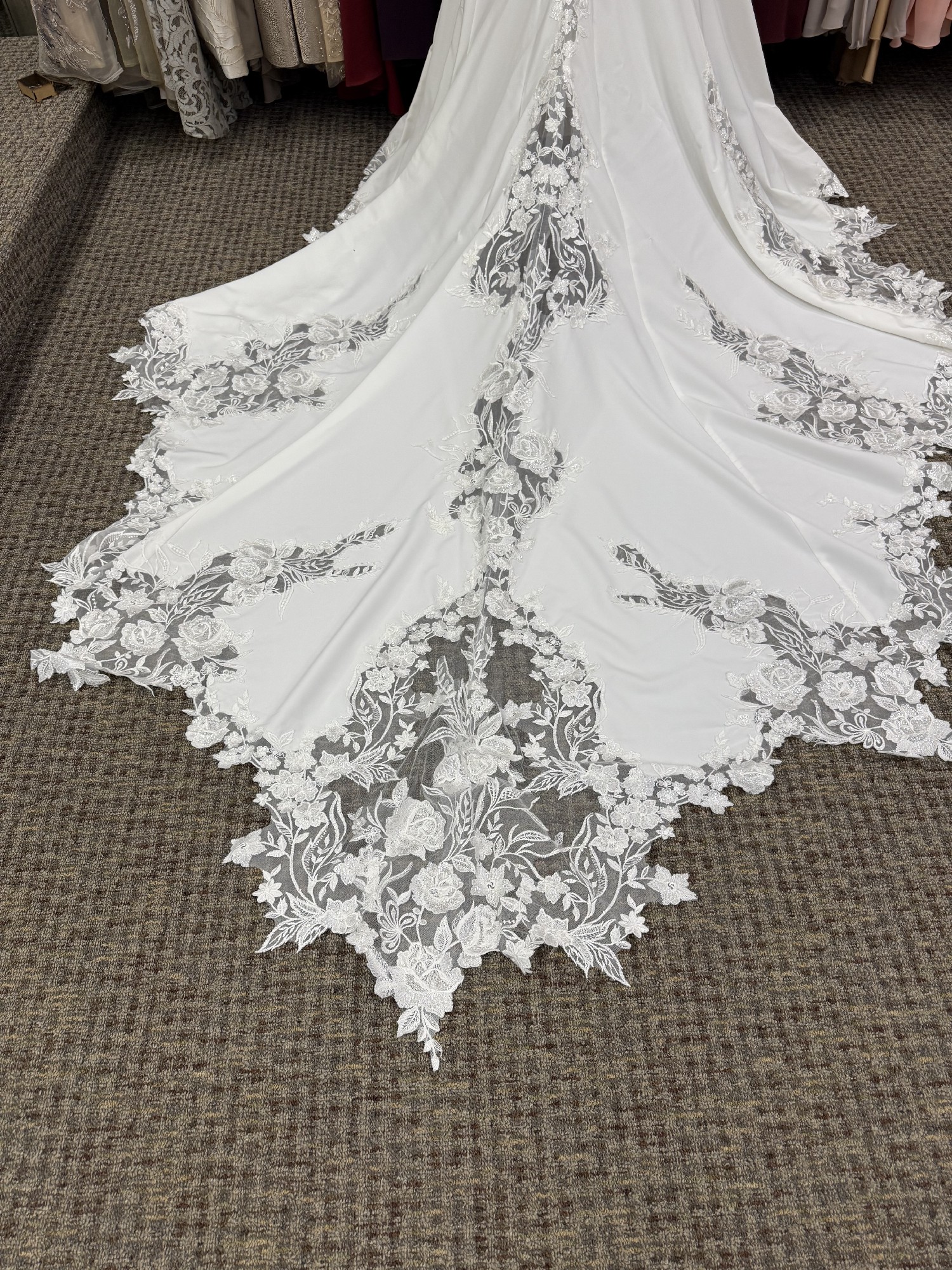 This is a brand new, never worn wedding dress. It was altered to add a Bussell and chest adjustments. It comes with a never worn veil.