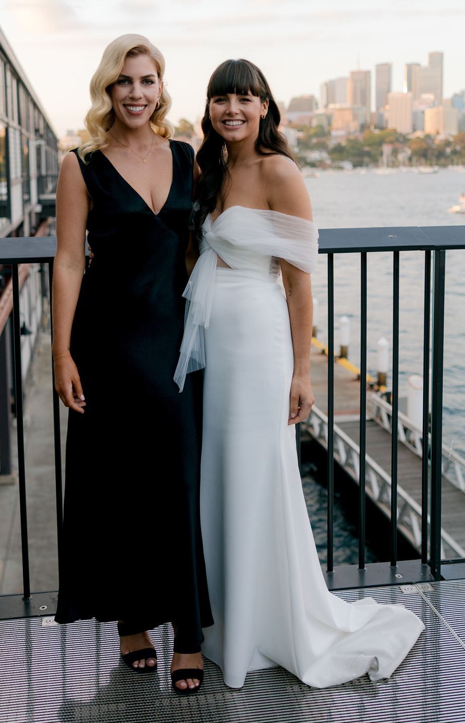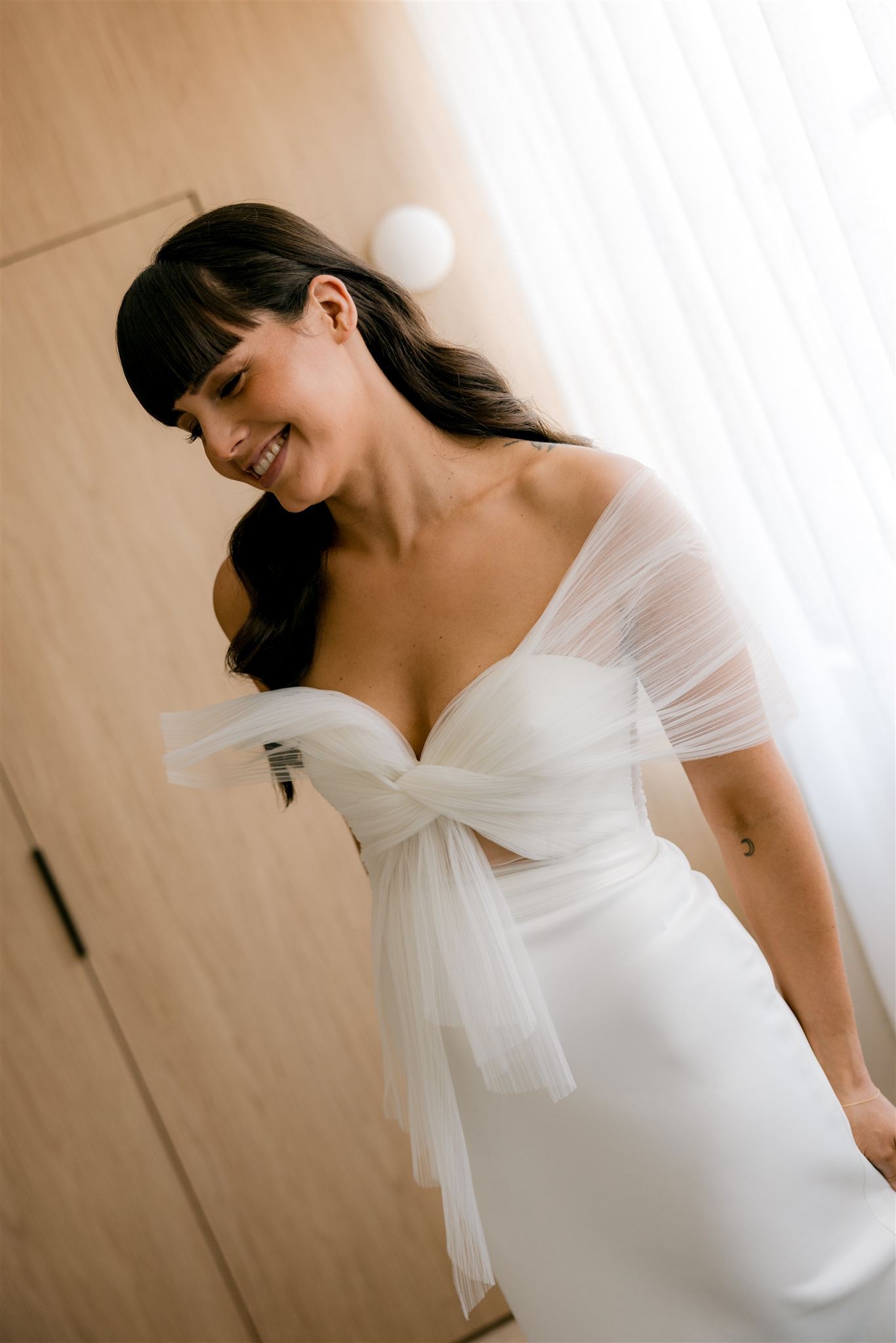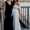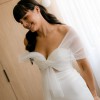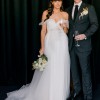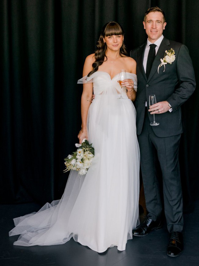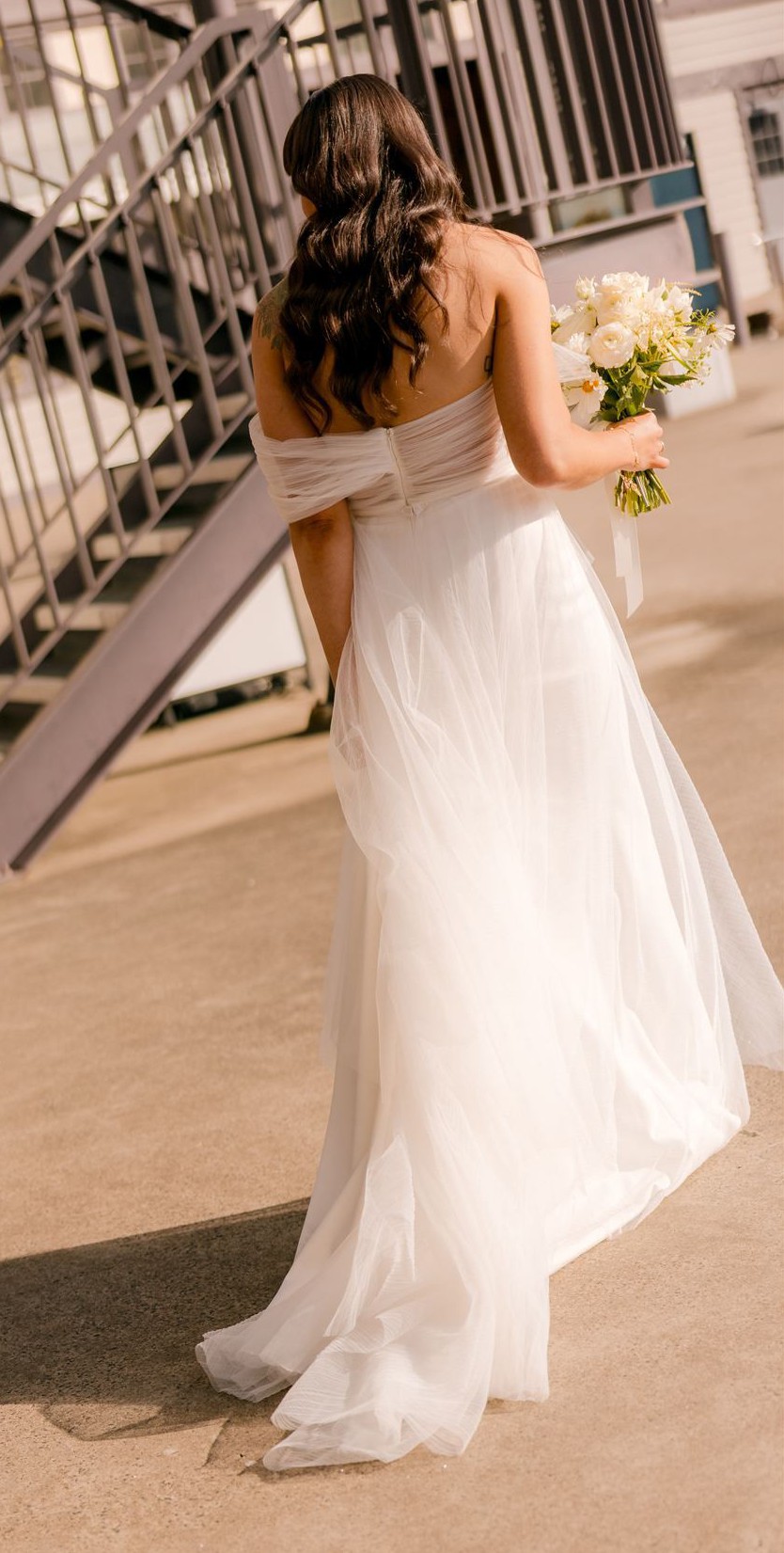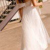 Sweet heart floor length dress with a tulle asymmetrical sleeve detail. Also has a tulle overskirt that I had a dressmaker make removable. The main dress has a small train and the skirt is made from a soft crepe material. It was very comfortable and light to wear. I wore the dress + overskirt for our ceremony and removed the overskirt for the reception.