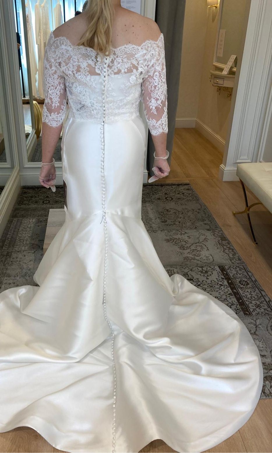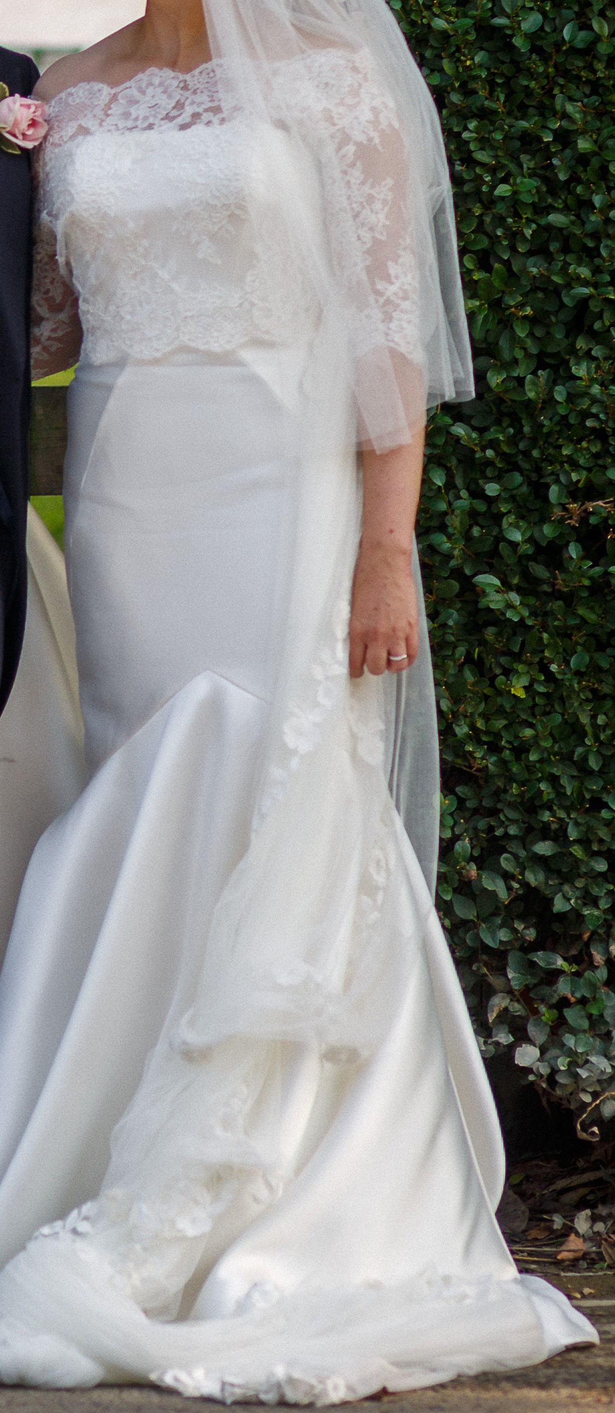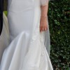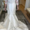 Beautiful and flattering mikado Pronovias Oberon wedding dress. Used once on wedding day and then professionally dry cleaned and stored in box to be kept safe and clean. It is a strapless dress but comes with lace cover up, which can be removed, providing two looks for versatility. It is a fit and flare style dress which holds you in in all the right places to give an hourglass shape.