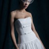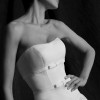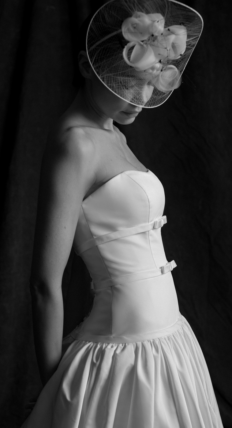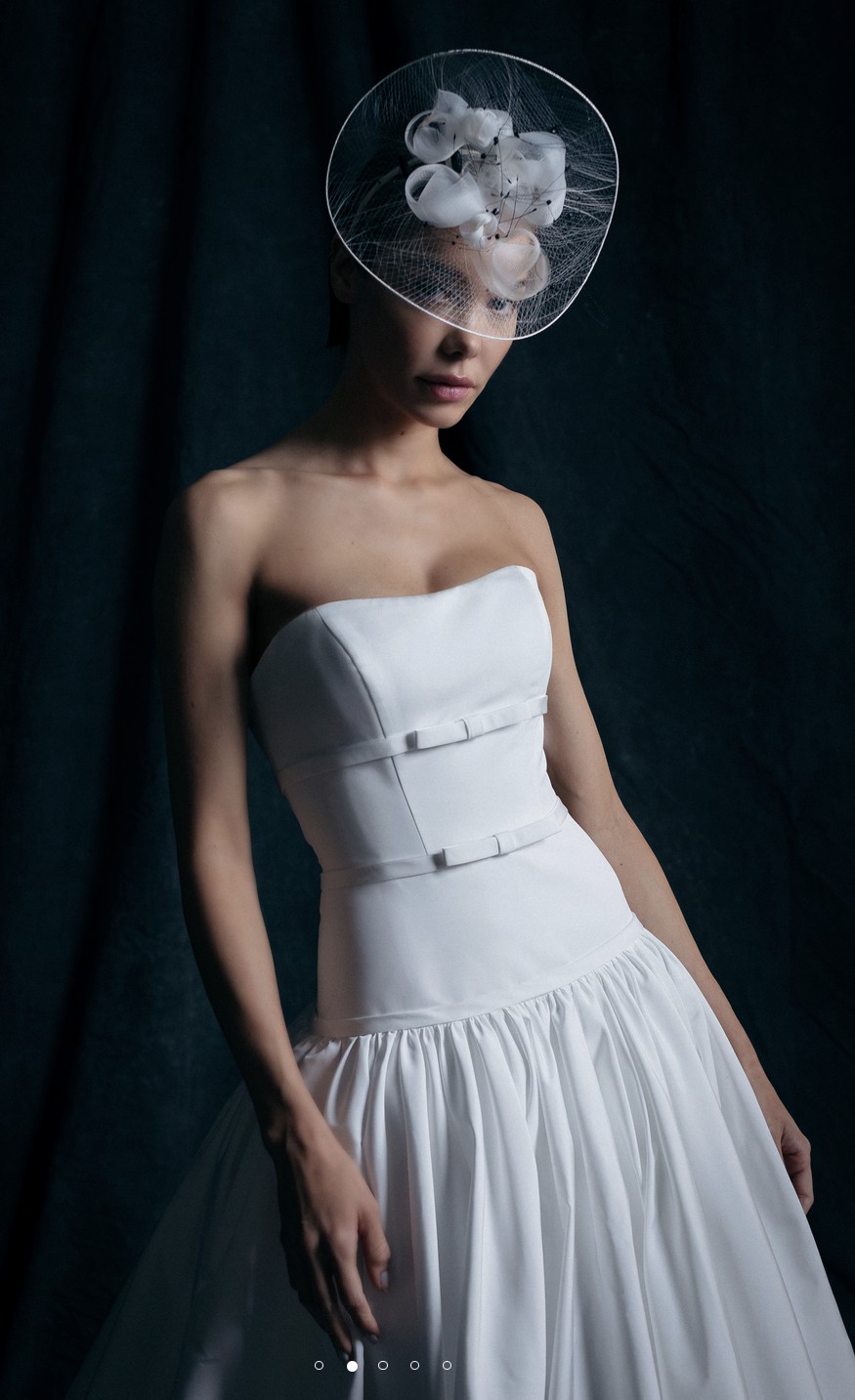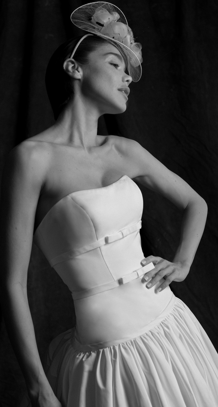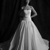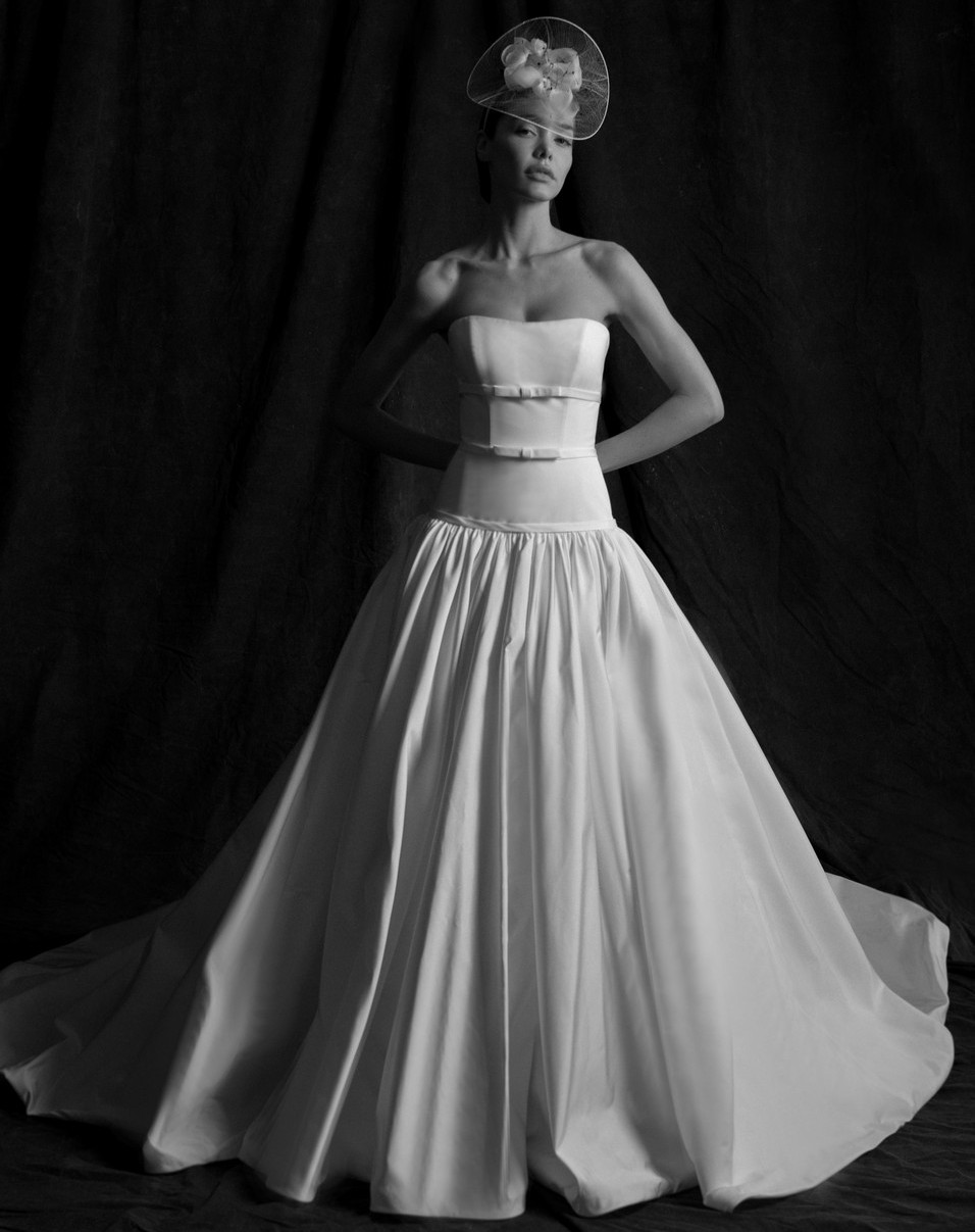 Faille strapless ball gown with elongated torso. Full gathered skirt with Cathedral length train. More photos and videos available upon request.