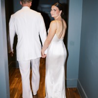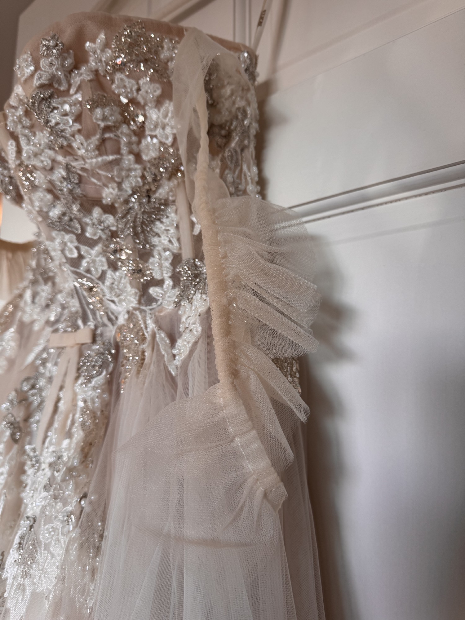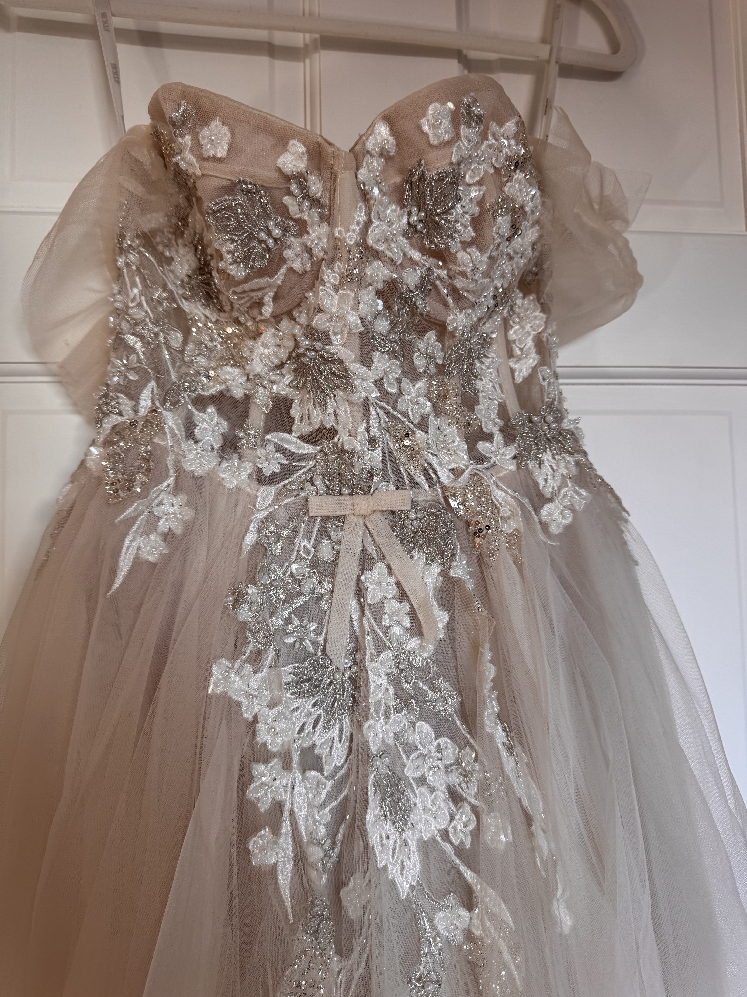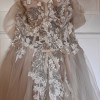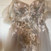 Embellished with intricate beading and delicate embroidery, the dress sparkles with every movement, adding an element of sophistication to your special day. A striking high slit not only enhances the gown's allure but also allows for ease of movement, making it perfect for dancing the night away. The playful bows add a touch of whimsy, creating a look that is both chic and unforgettable.