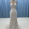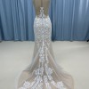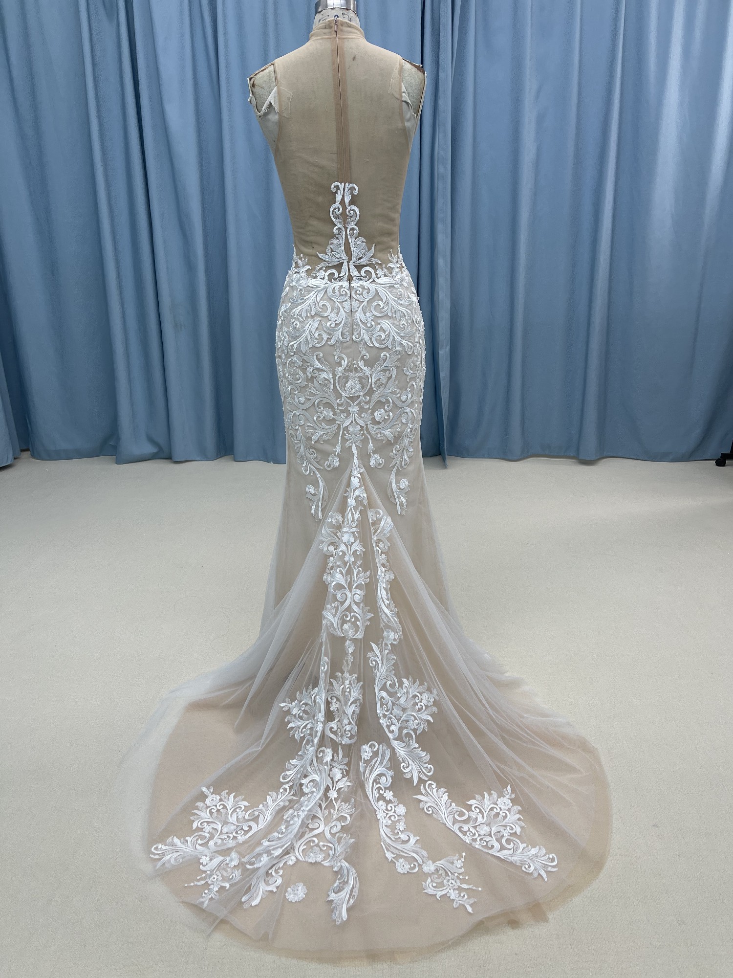 This style #C2024-YG-FS939 was originally made by Texas dress designer DARIUS CORDELL. The sheer illusion neck embroidered wedding gown is ready to be shipped today in a size 2/4. Customizations to the design are only possible from the original designer.