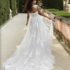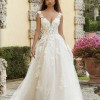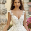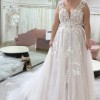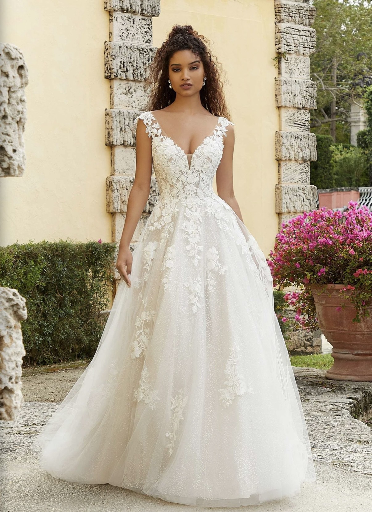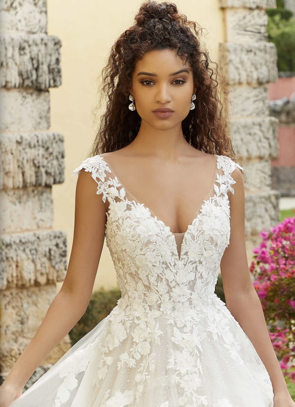 Our Fiorenza wedding dress is fit for a modern day fairytale. The sparkle tulle ball gown glitters from every angle with added crystal beaded details. The v-neck bodice features beautiful three-dimensional floral lace appliqués that cascade down the gown. Dainty cap sleeves lead way to a stunning keyhole back and textured chapel train. Color is Ivory/Almond/Honey.