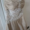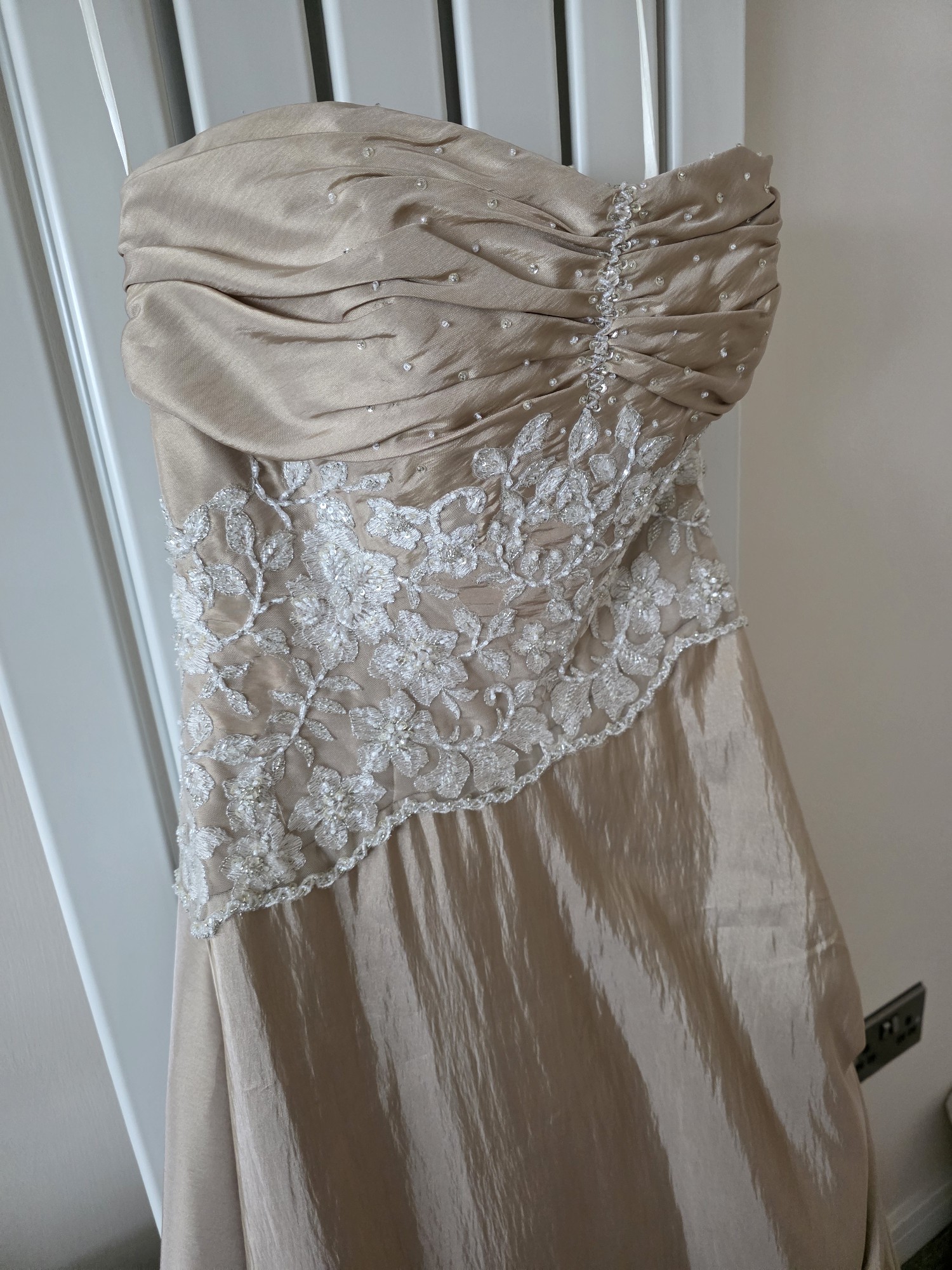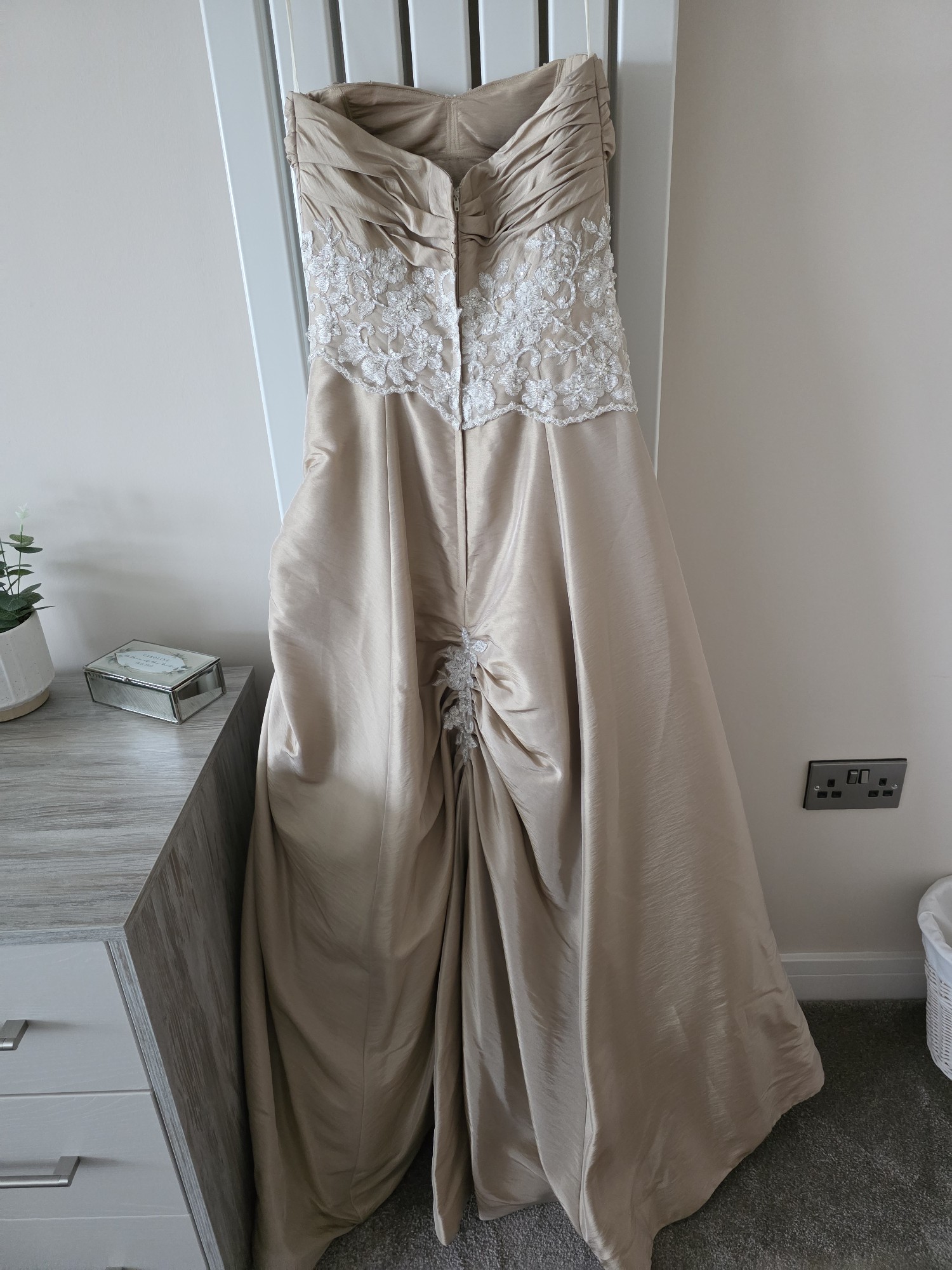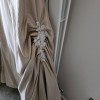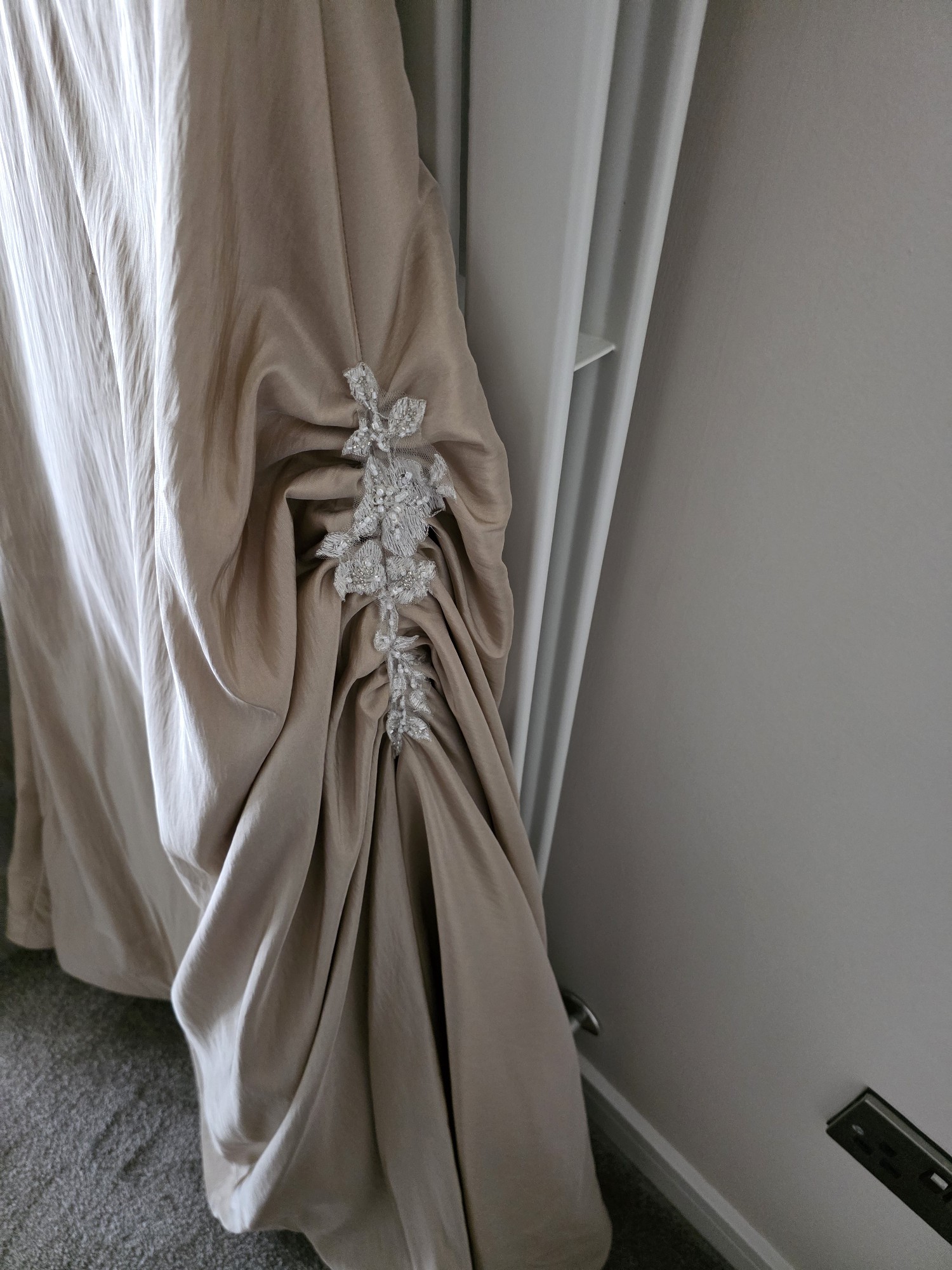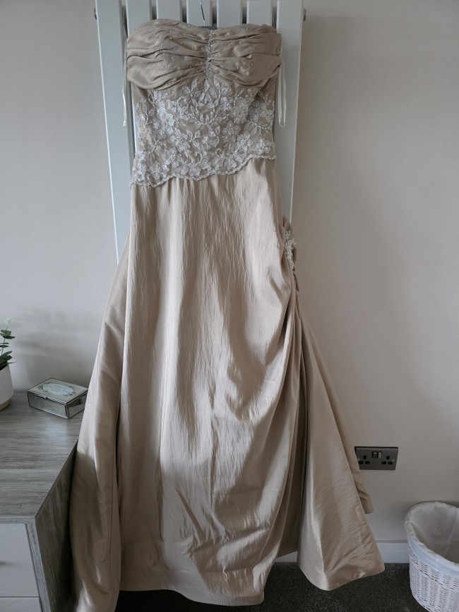 Colour is latte (like a milky coffee). It's like a taffeta material and hangs beautifully. Very flattering shape (fitted to top of hips then drapes). Not overly heavy to wear.