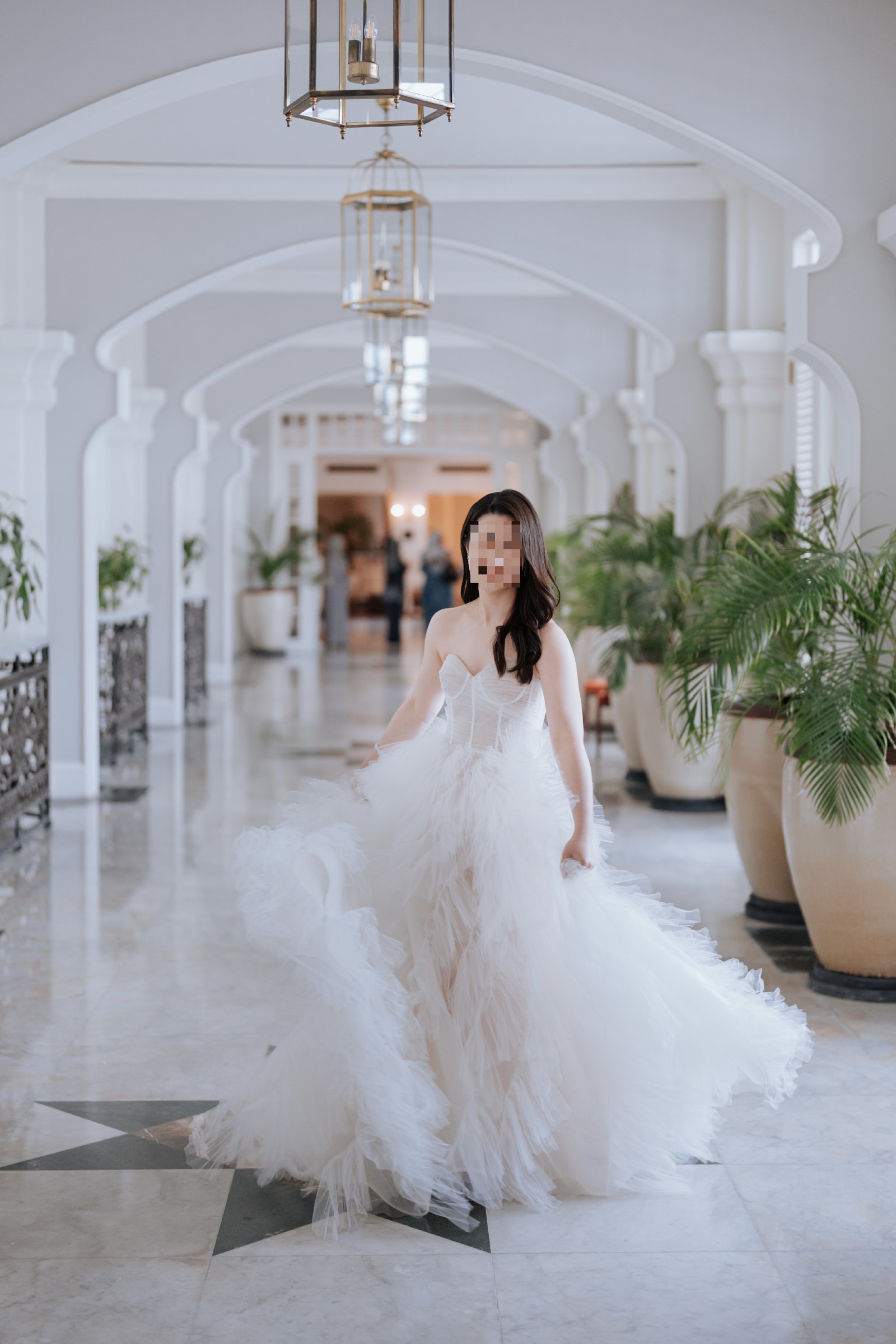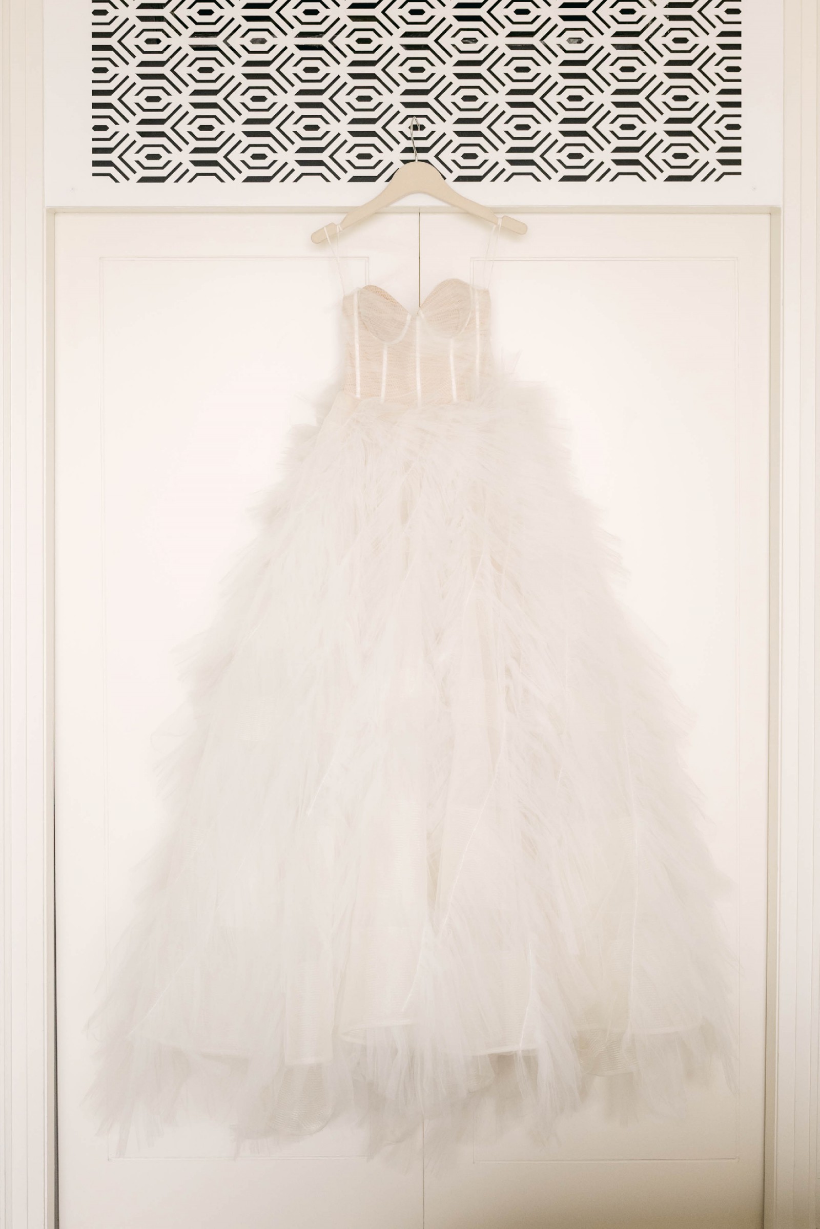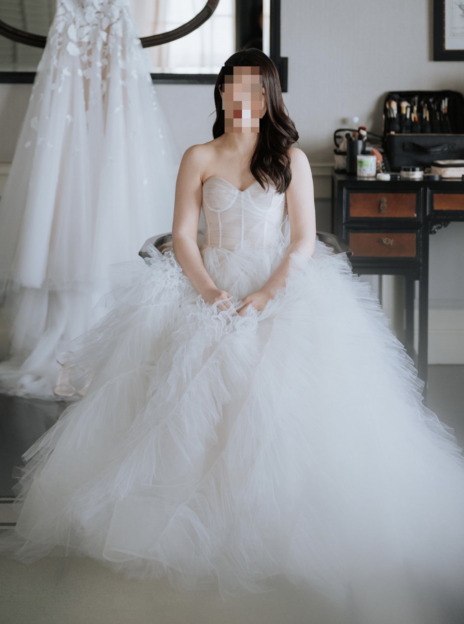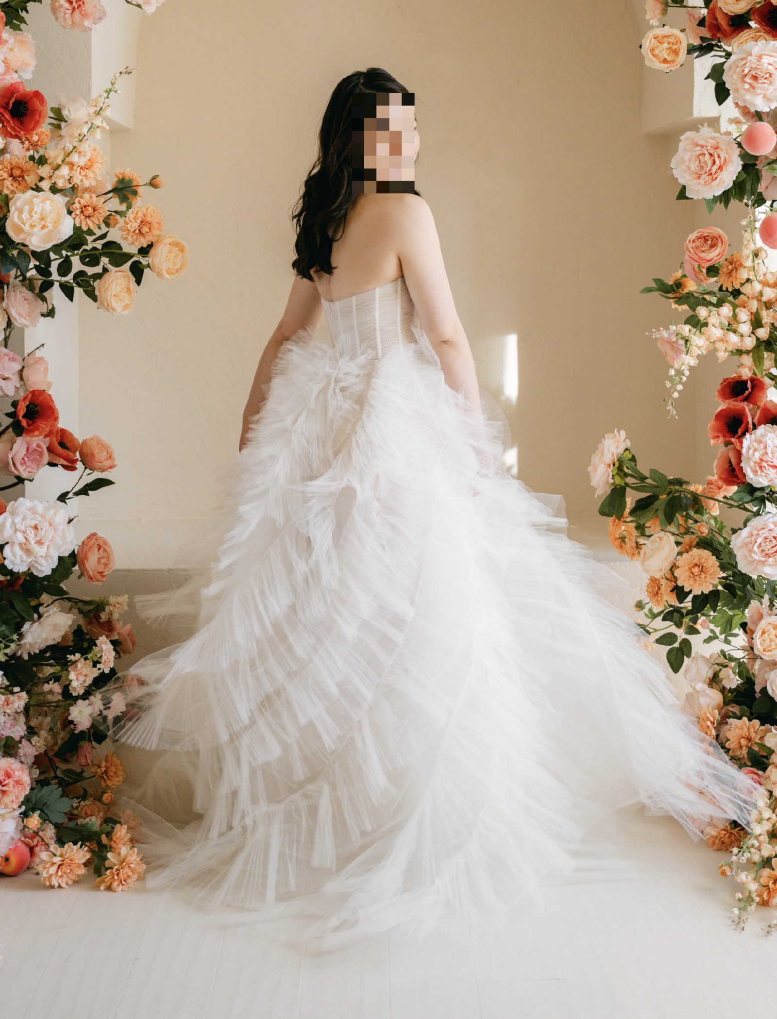 This Oscar de la Renta S23 rose tulle gown is the embodiment of elegance and romance, perfect for the bride who dreams of a fairytale wedding. I fell in love with the delicate ruffles that adorn the intricate layers of soft tulle, creating an ethereal look that beautifully flows as you walk down the aisle. The sweetheart neckline enhances the silhouette and adds a touch of classic femininity, while the A-line design flatters every figure, ensuring you feel your absolute best on your special day.