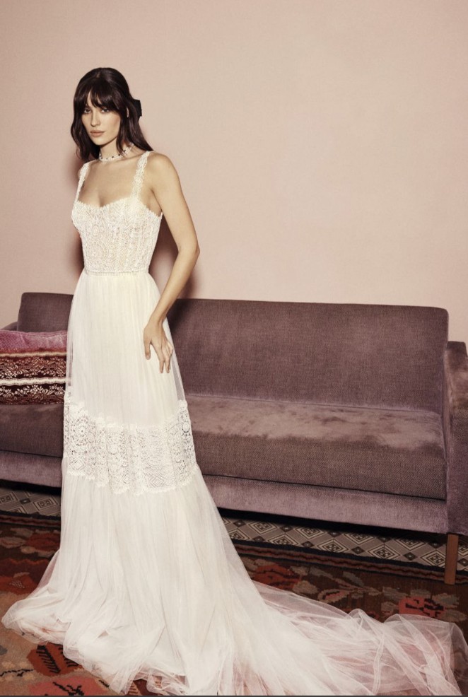 Sheer embroidered boho lace fabric A-line gown with flowy tulle skirt and pearl buttons along back bodice