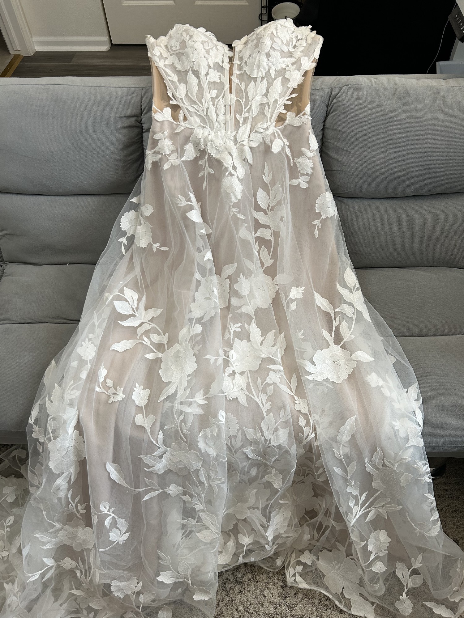 - Minor water marks or signs of wear on blush satin under layer, not noticeable when wearing dress (message to request photos for condition)