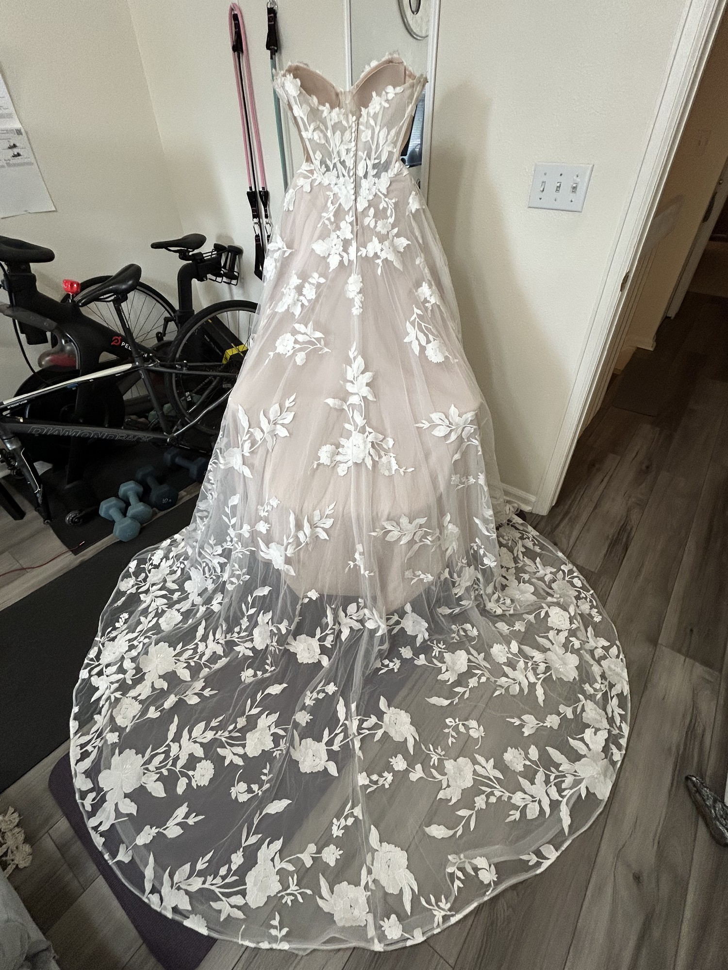This dress has been worn once. It has not been dry cleaned but is gently used and in great condition. Detachable sleeves not included.