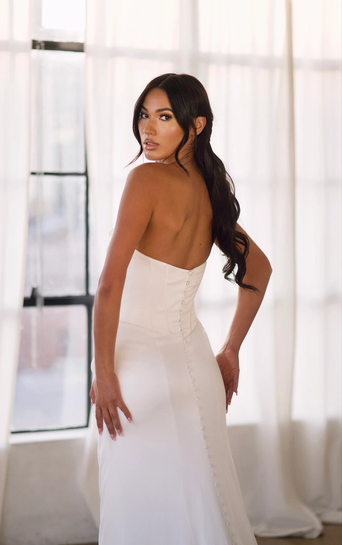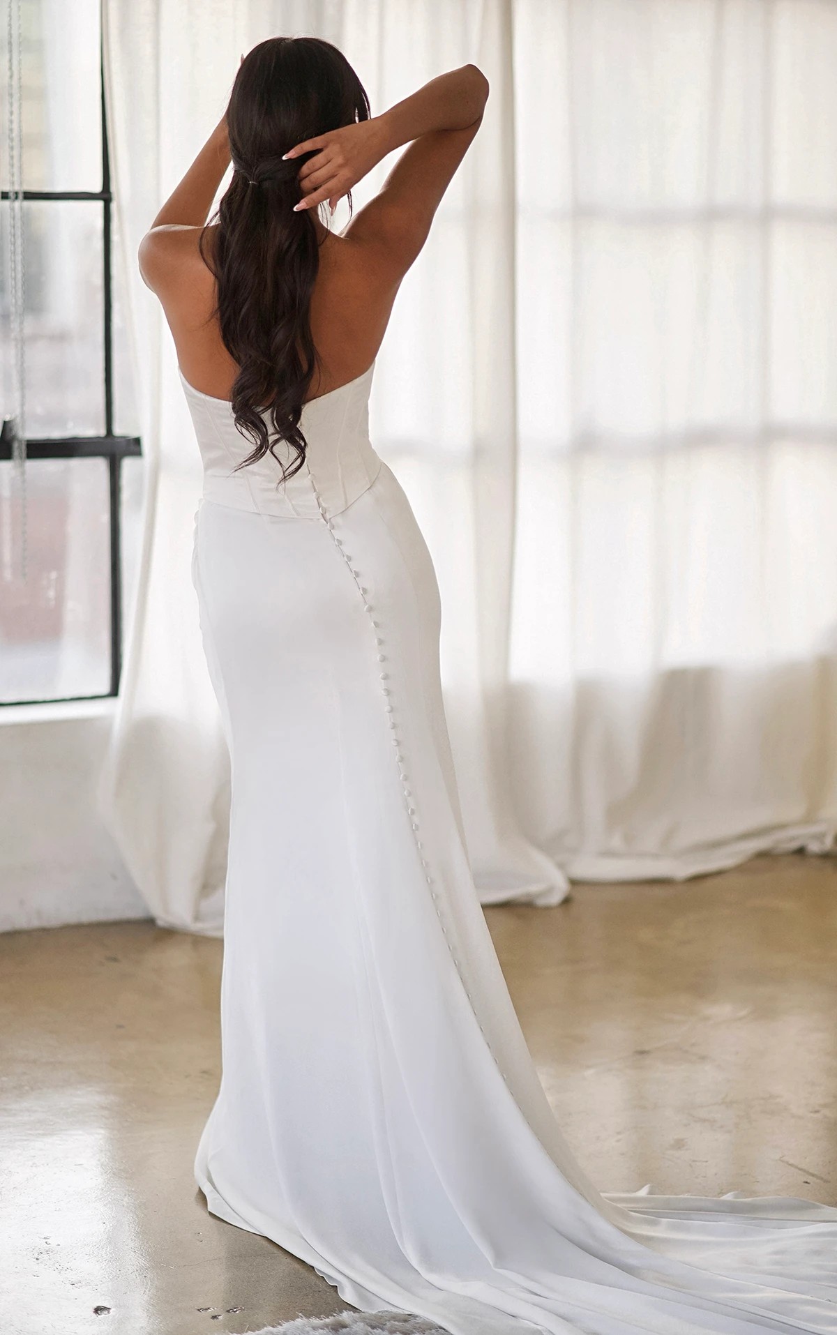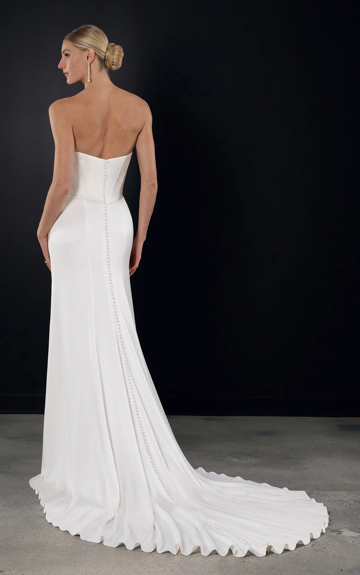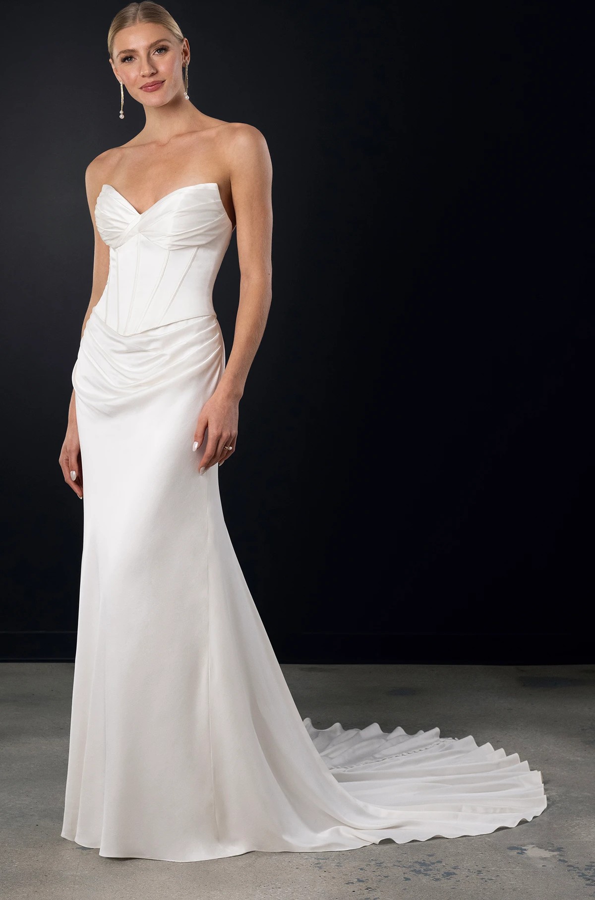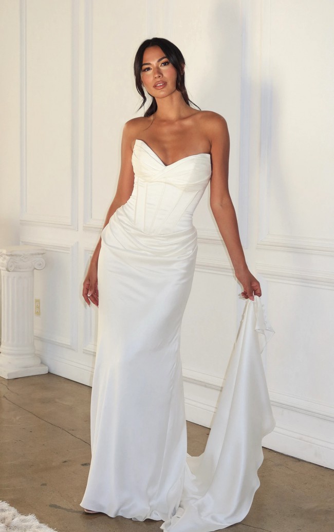 Brand New with tags. Contemporary strapless satin column bridal gown. The strapless sweetheart top receives an architectural twist with draped accents enhancing the structured corset bodice. Luxurious high-gloss satin shapes the couture-fitted top and flows into a smooth column skirt that elegantly contours the body. Crisp, sophisticated lines create a sleek and seductive silhouette, with fabric-covered buttons cascading down the back into a gentle, sweeping train. The dress is brand new with tags in perfect condition & comes with protective dust bag. I purchased the dress for my ceremony however changed my mind so didn’t end up wearing it.