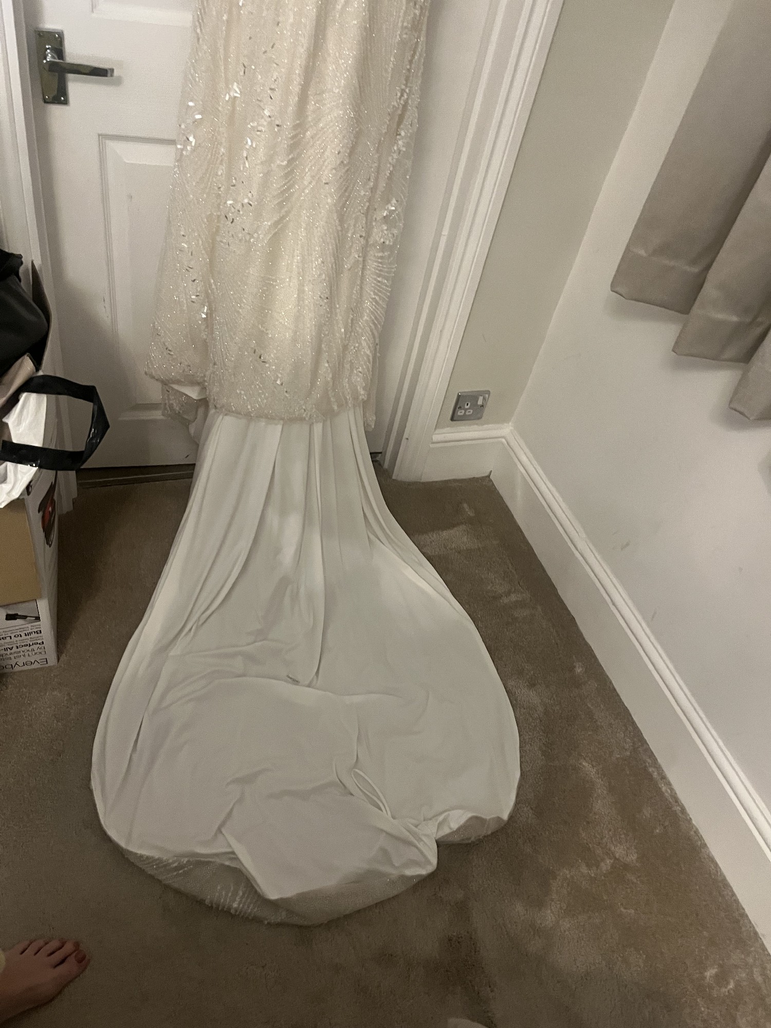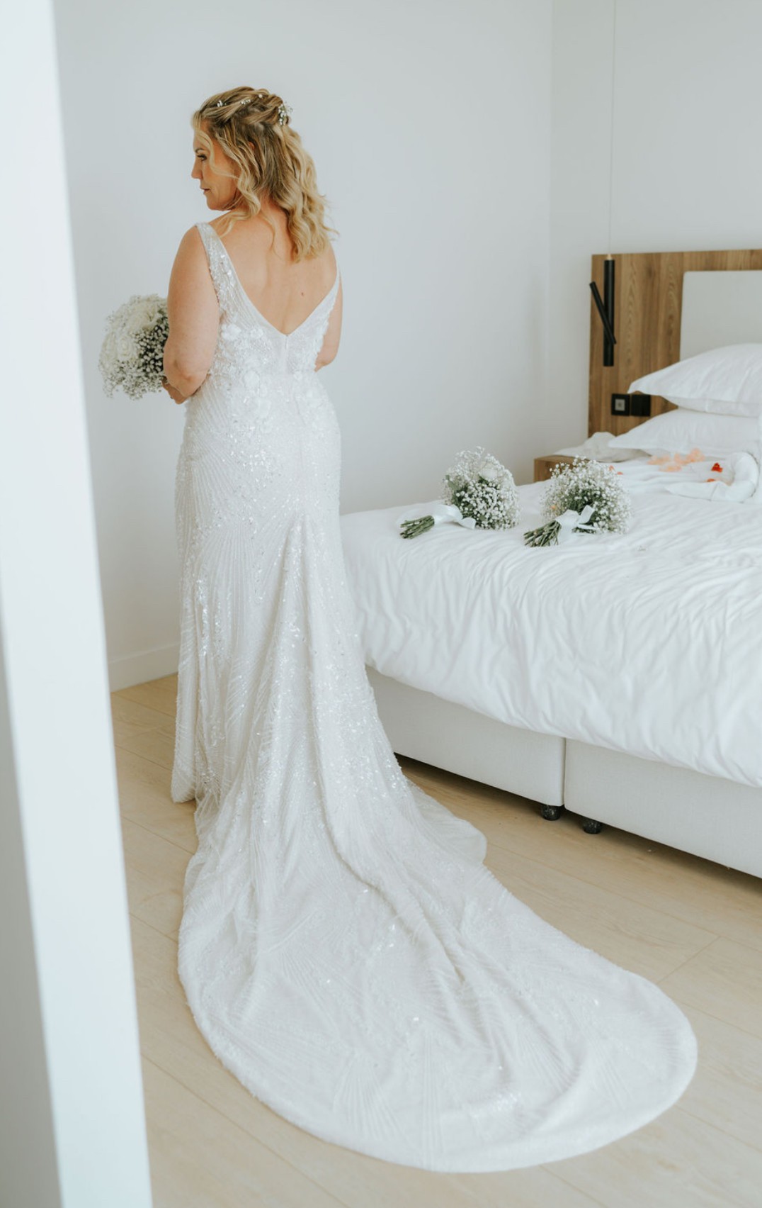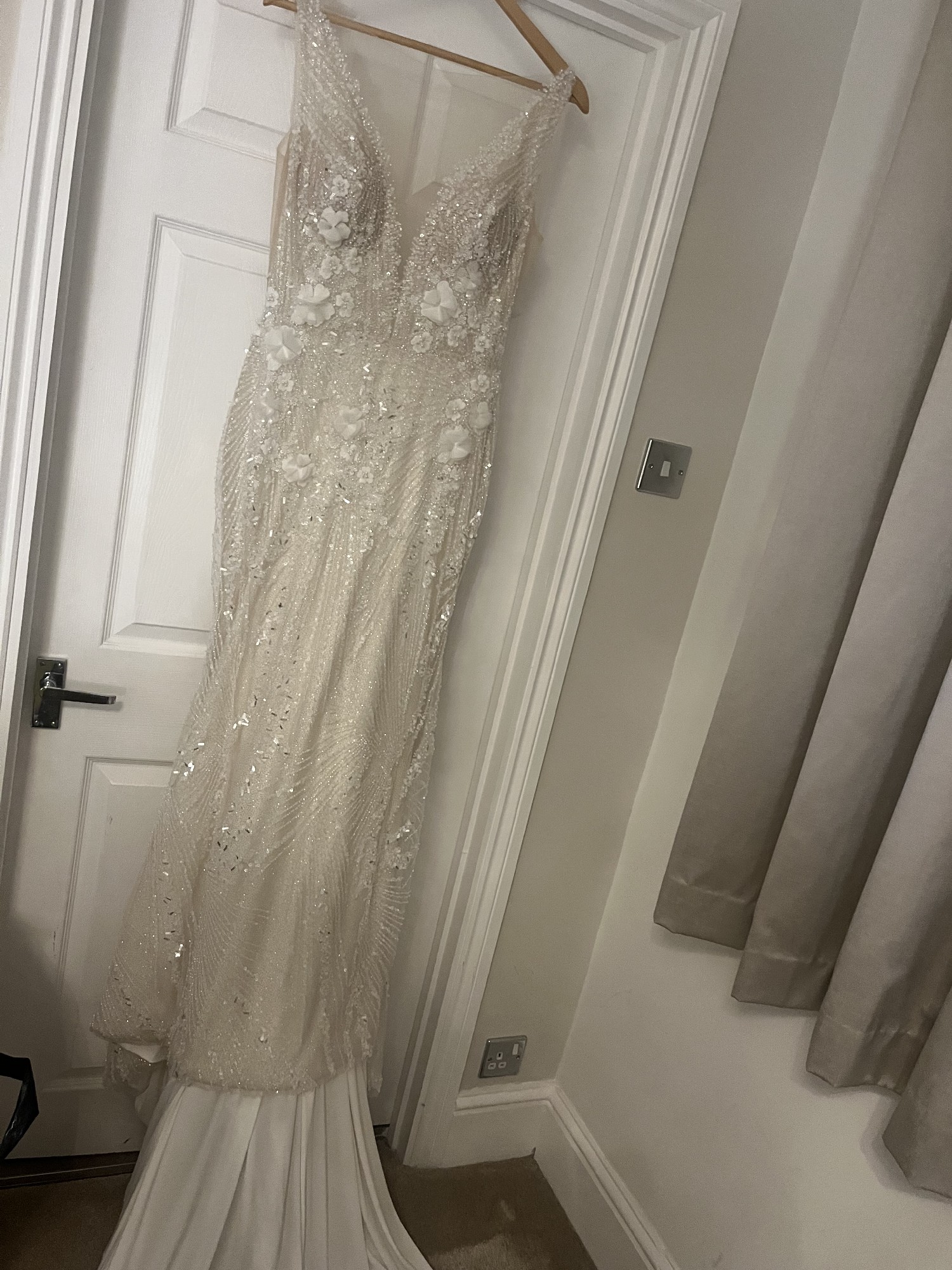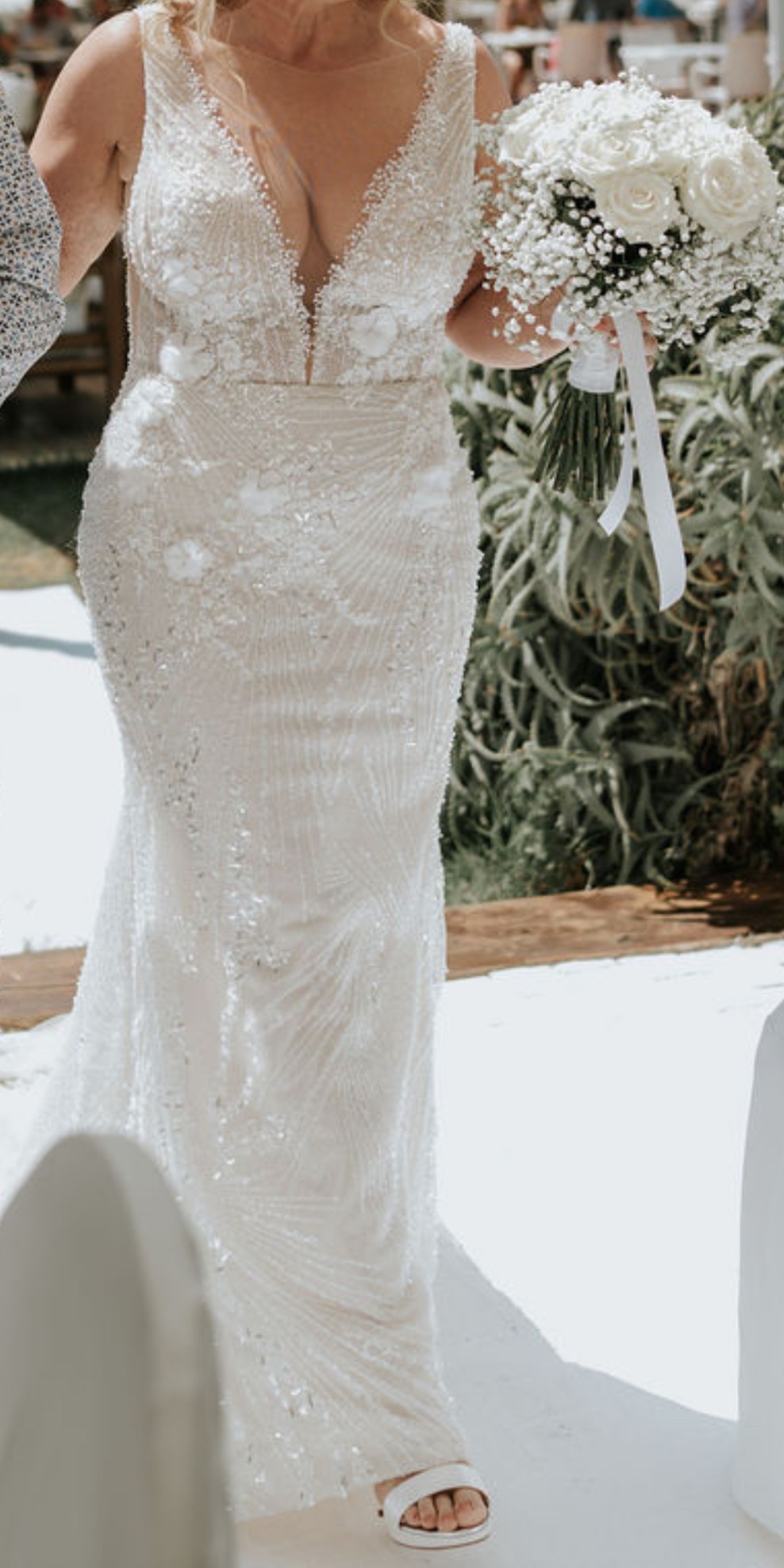 One of my favorite features is the backless design, which not only enhanced the elegance of the gown but also made me feel so confident and beautiful. The way it hugs the body gracefully showcases curves while remaining effortlessly chic. I loved how it made me feel like a fairy tale princess, and I hope to pass on this feeling to another bride-to-be.