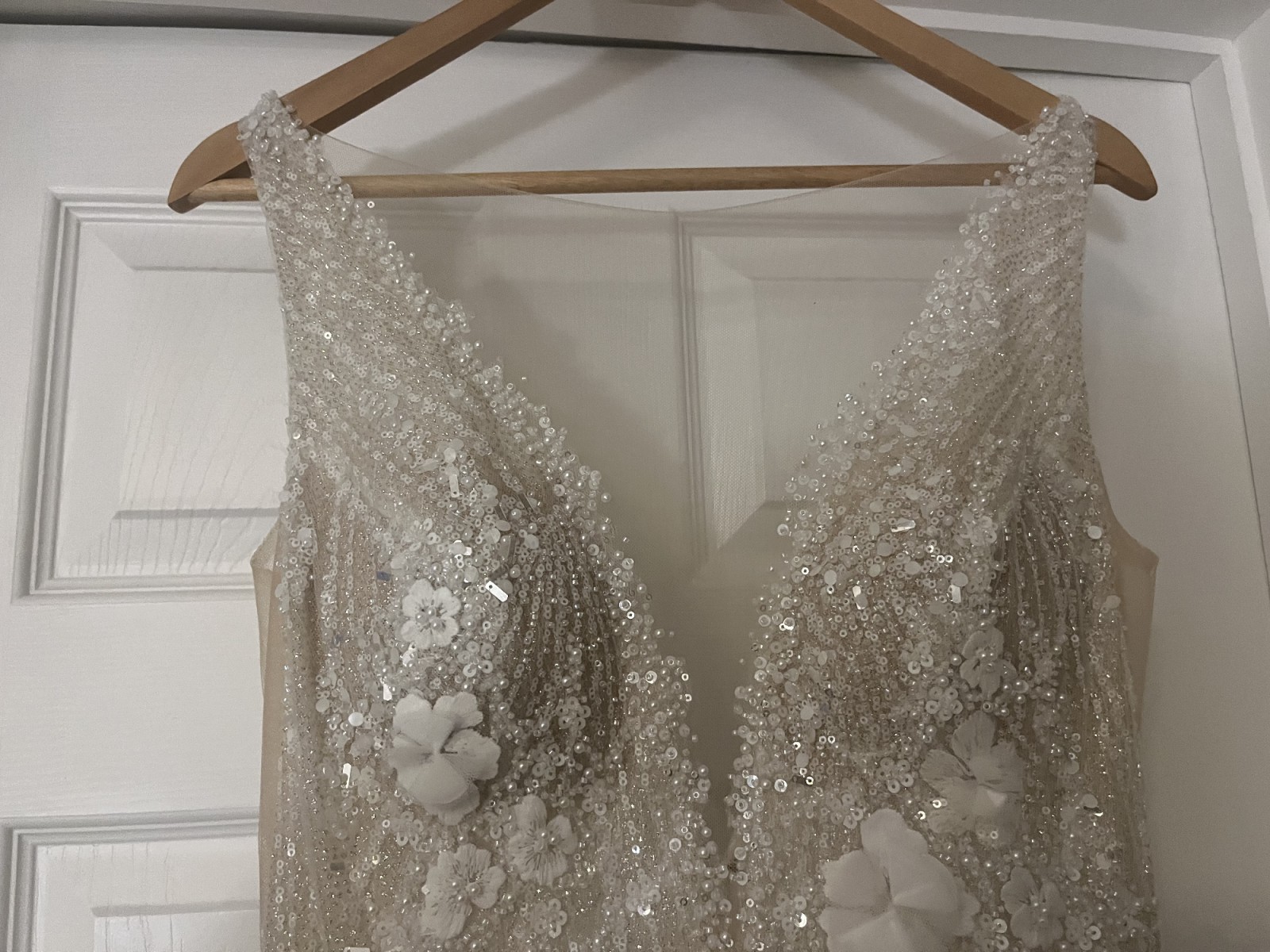 This Paradise gown has been a true embodiment of my dream wedding. Designed by the incredibly talented Eva Lendel, this size 14 sheath dress is nothing short of breathtaking. As I walked down the aisle, the sheer neckline and delicate 3D flowers captivated everyone in attendance, while the intricate beading and crystals added a touch of sparkle that danced in the light, creating a magical atmosphere.