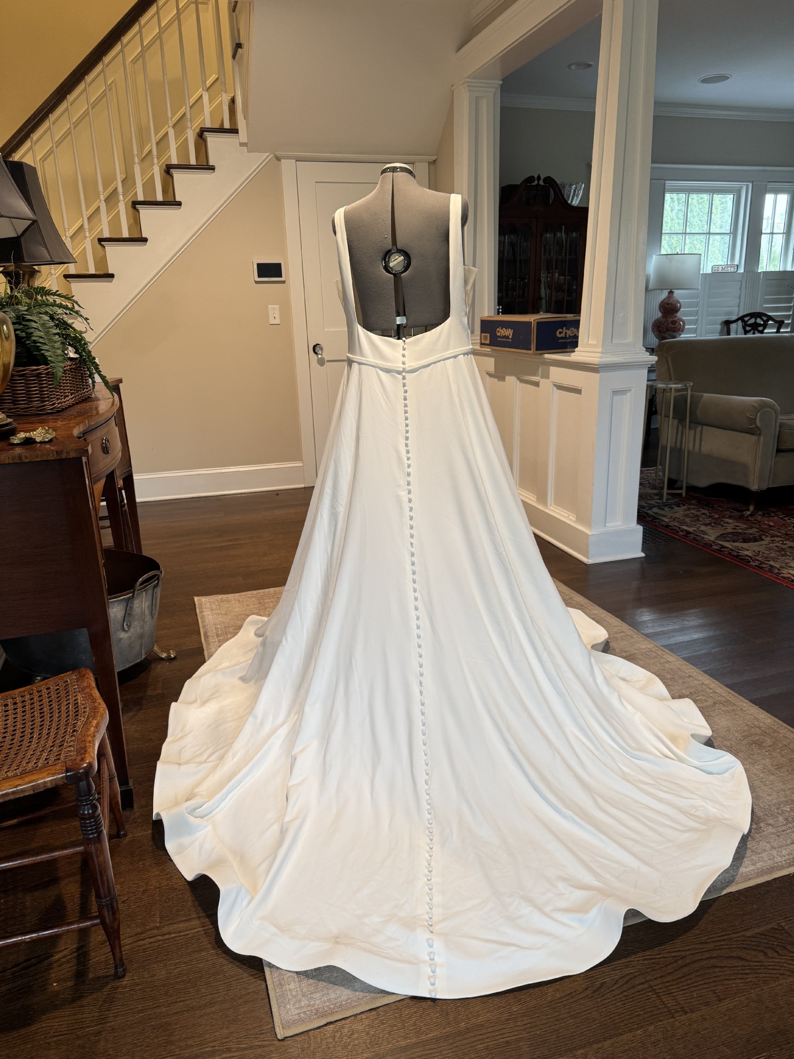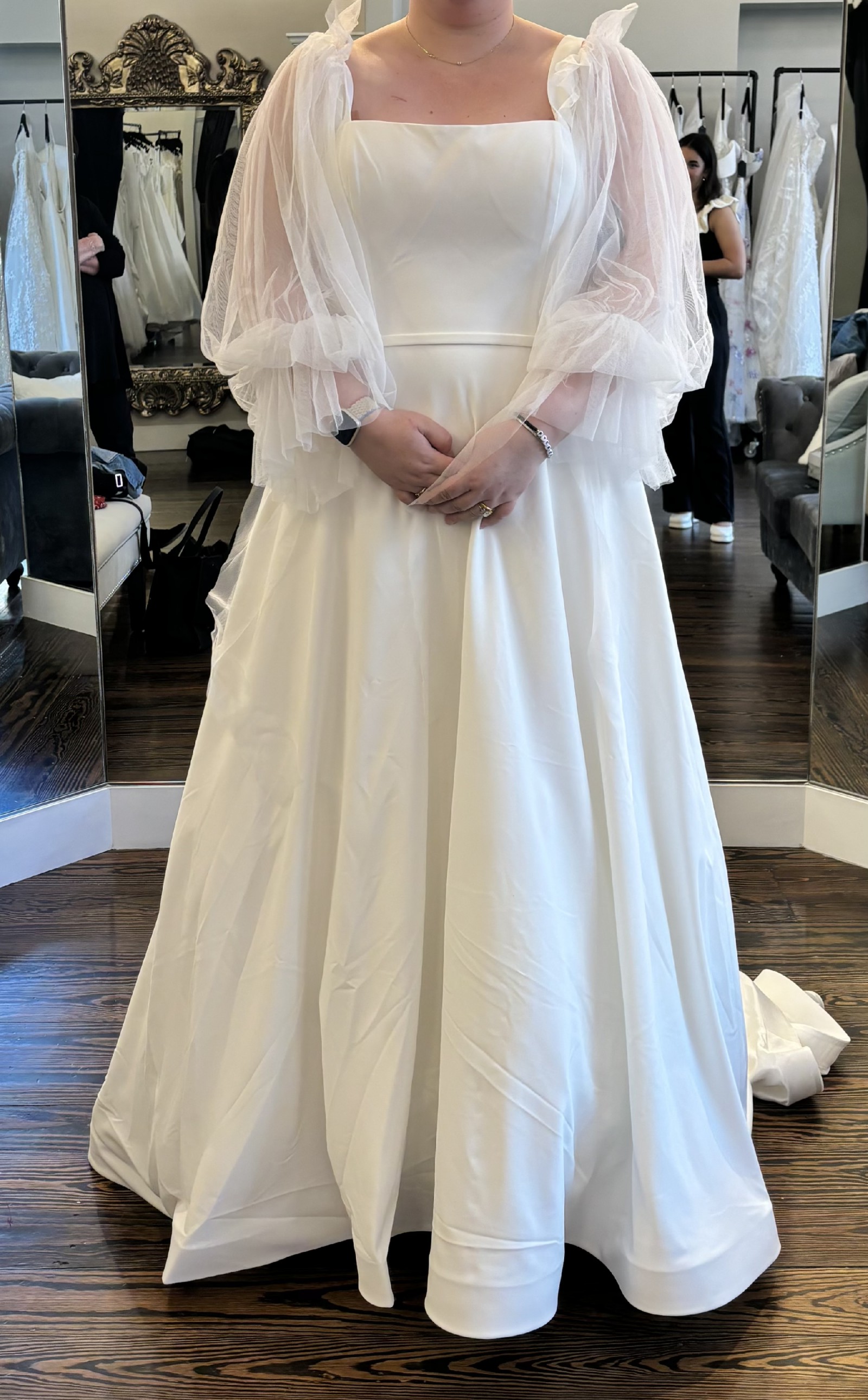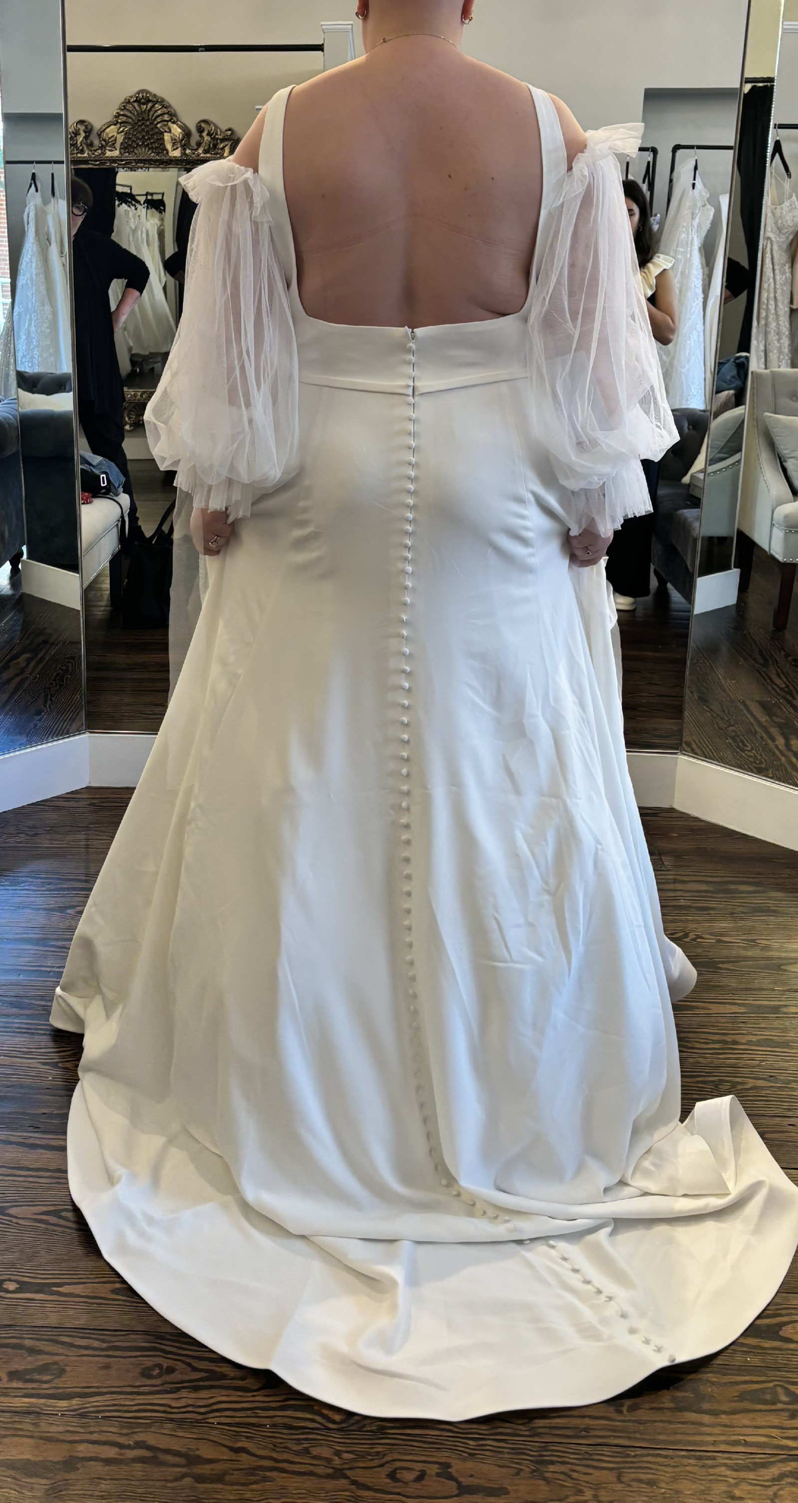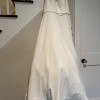 Never been worn in a wedding - only tried on. Beautiful custom A-Line gown with detachable chiffon sleeves. Mesh panels under arms. Bust fits a D cup. Button detailing down the back but zipper closure for easy on/off. Its never been altered so it is ready for the next bride. Some dog hair around edge of the skirt because I live with dogs but I am confident it will come off in dry clean.