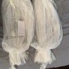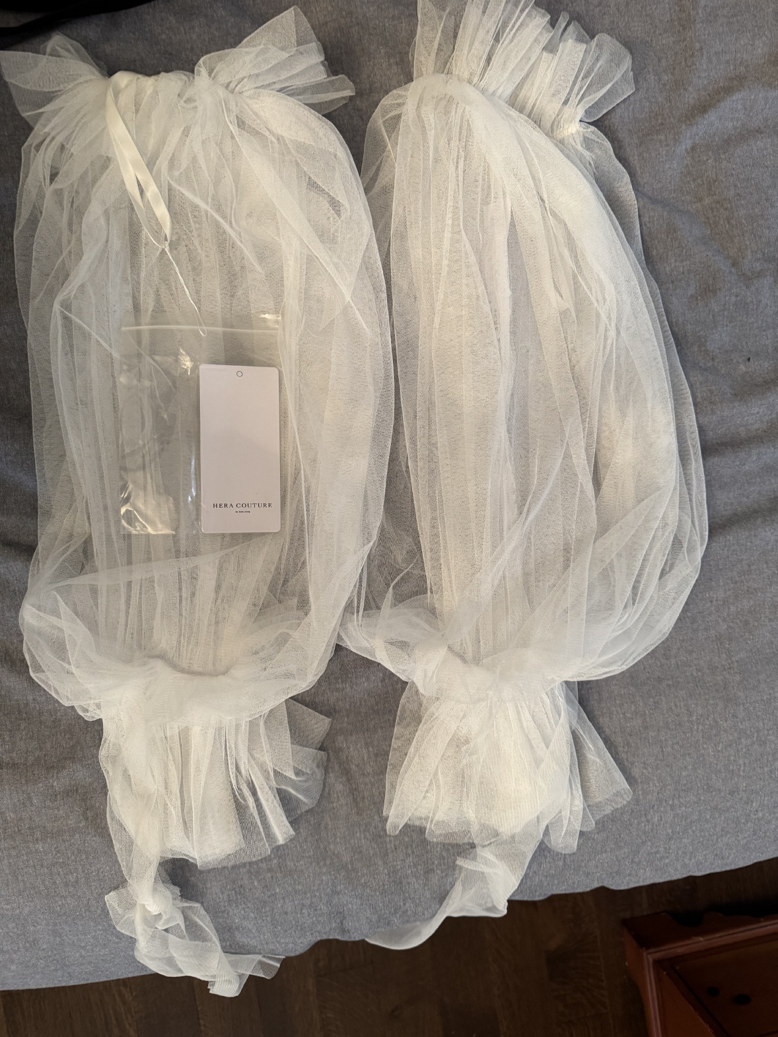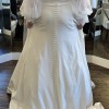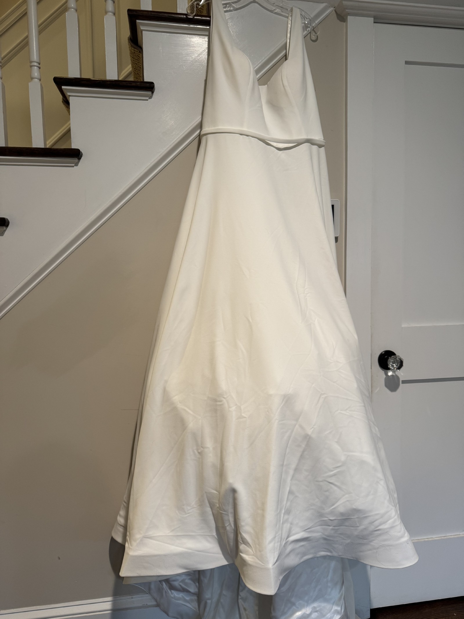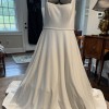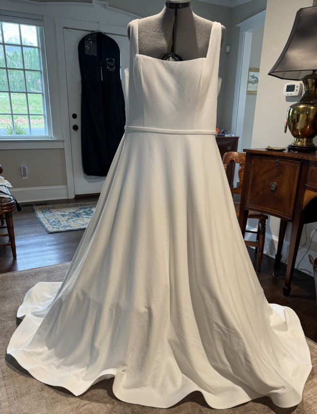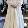 Never been worn in a wedding - only tried on. Beautiful custom A-Line gown with detachable chiffon sleeves. Mesh panels under arms. Bust fits a D cup. Button detailing down the back but zipper closure for easy on/off. Its never been altered so it is ready for the next bride. Some dog hair around edge of the skirt because I live with dogs but I am confident it will come off in dry clean.