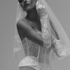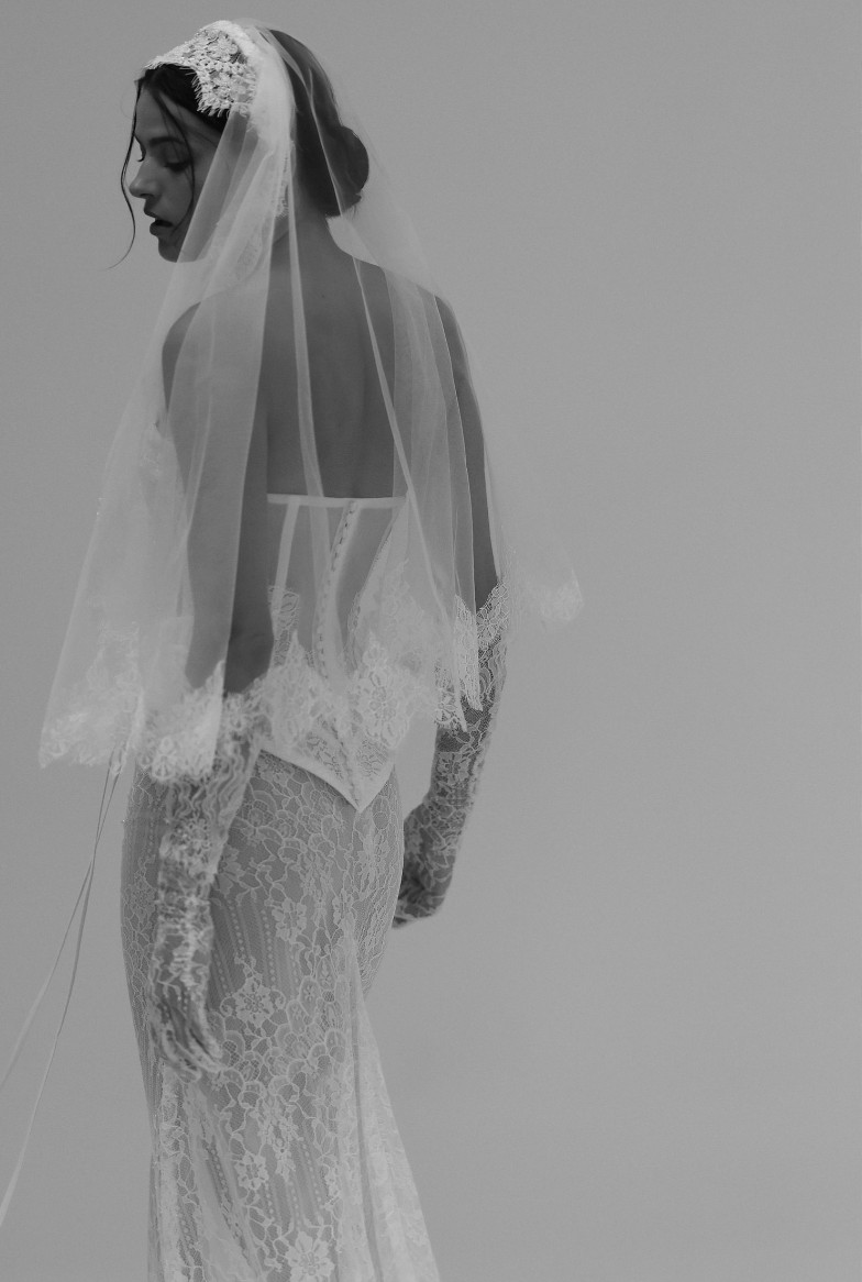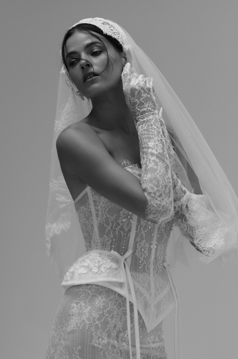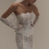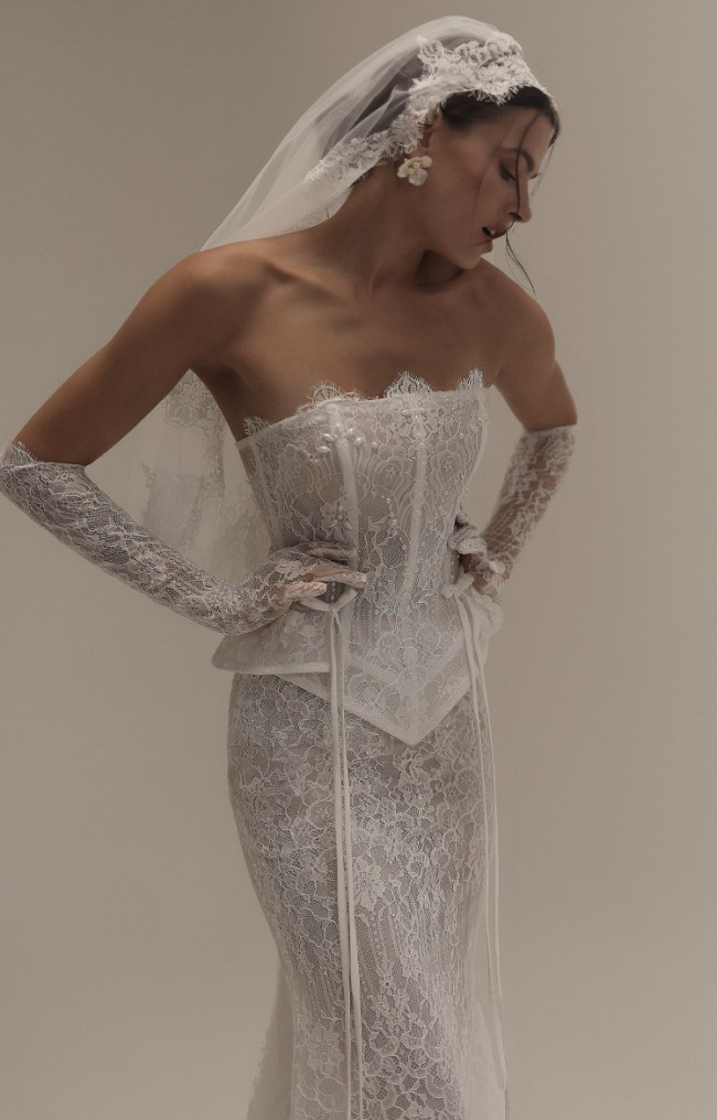 Showcasing vintage-inspired romance, this figure-hugging two-piece gown combines a strapless corset bodice with a fit-and-flare skirt. Exposed boning, delicate pearl beading, and a peplum detail complete with dainty bows contribute to the ensemble’s fashion-forward edge. Featuring a delicate lace design from head to toe, the expert craftsmanship ensures an impeccable fit.
