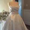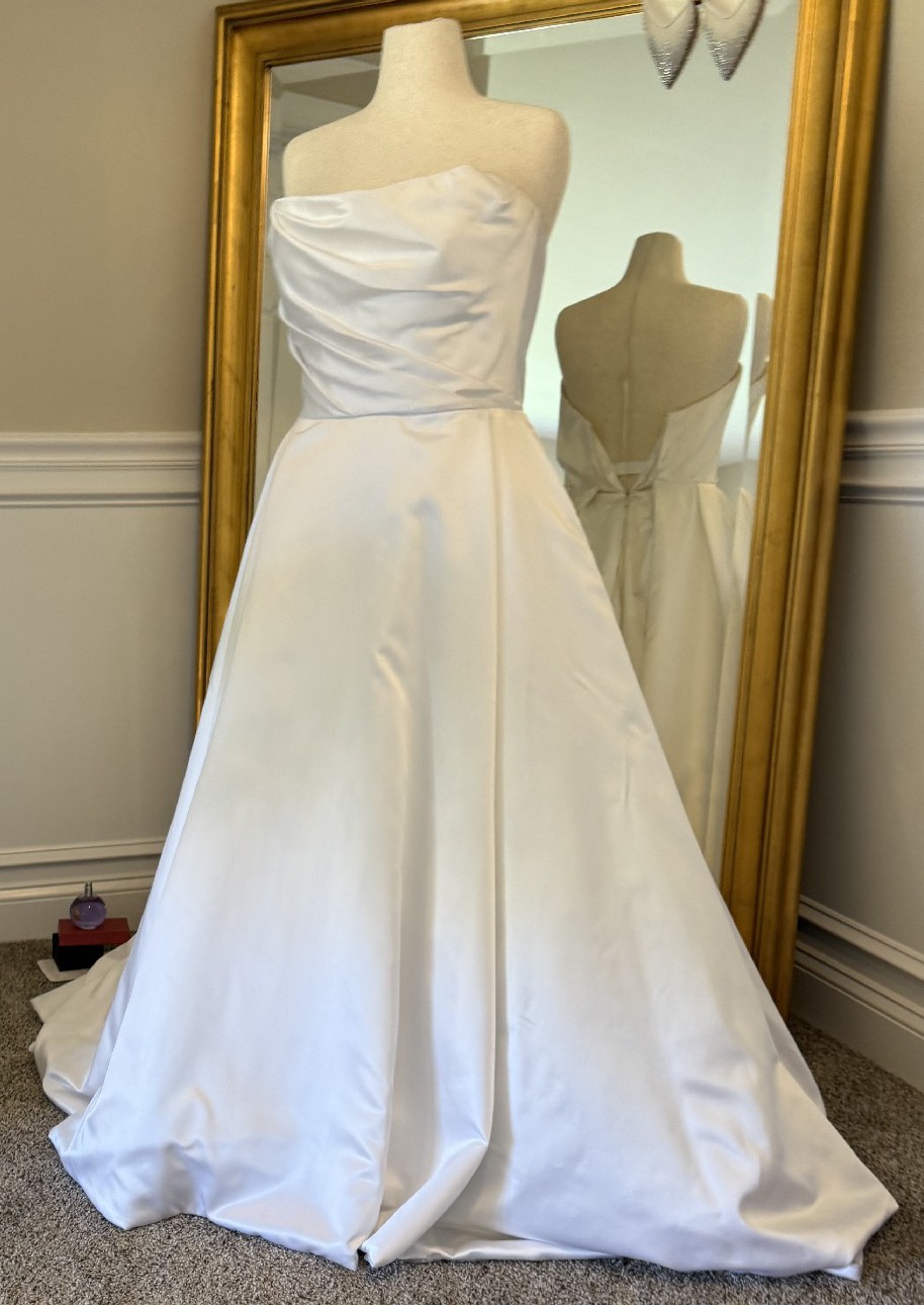 Selling my Allison Burke wedding gown, worn once and professionally cleaned. It has a timeless satin finish, a structured bodice with soft draping, and a full ballgown skirt that photographs beautifully. The back has a clean, classic look with a slight dip and hidden zipper.