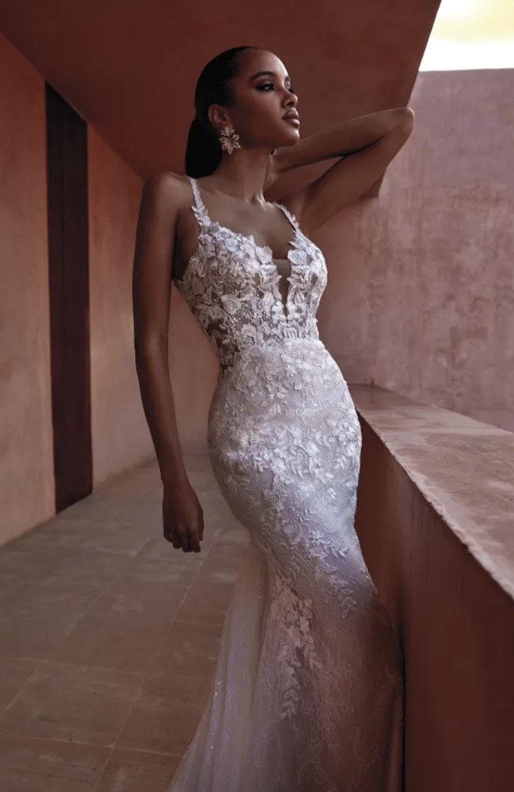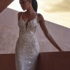 This glamorous siren-style gown steals the limelight and looks stunning with its two-tiered chapel train. Seductive open back and deep V-necks enhance the upper body lines.