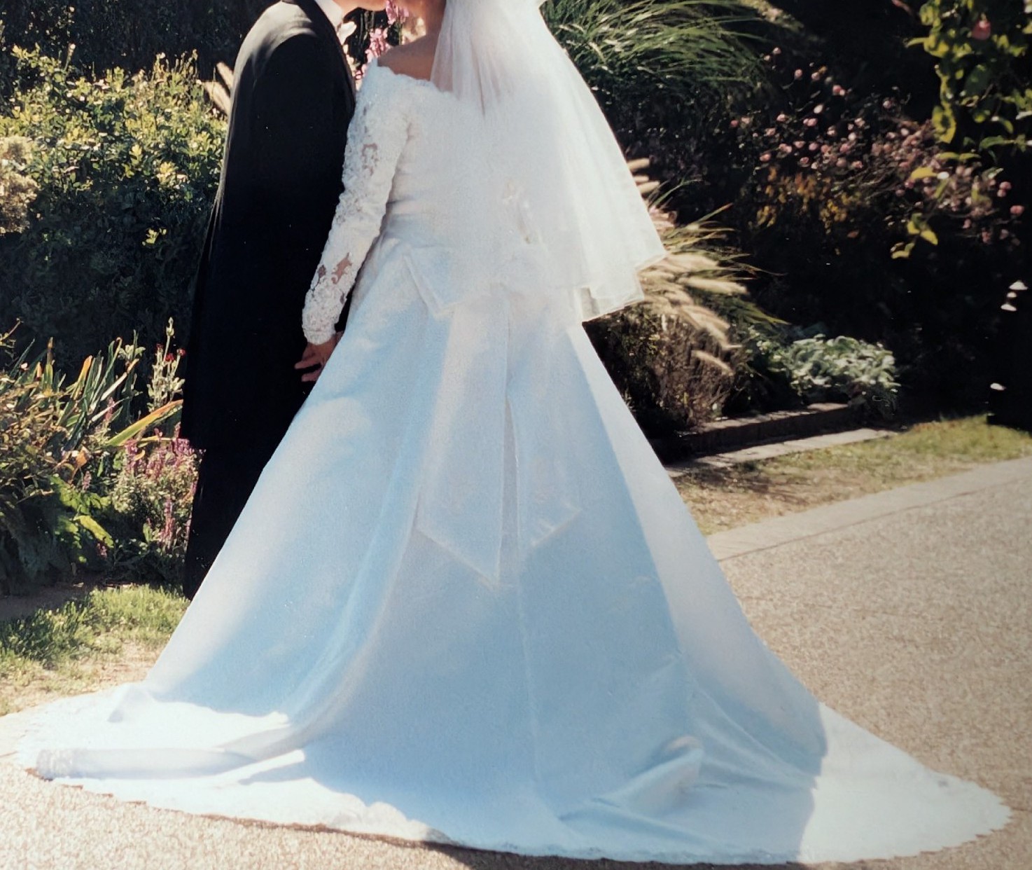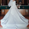 When ready for the reception, the long train can be "buttoned up" into a full skirt, as I have showed in the close up pictures. The bow can add a playful charm if the buyer so chooses, it is currently detached but can be reattached easily.
