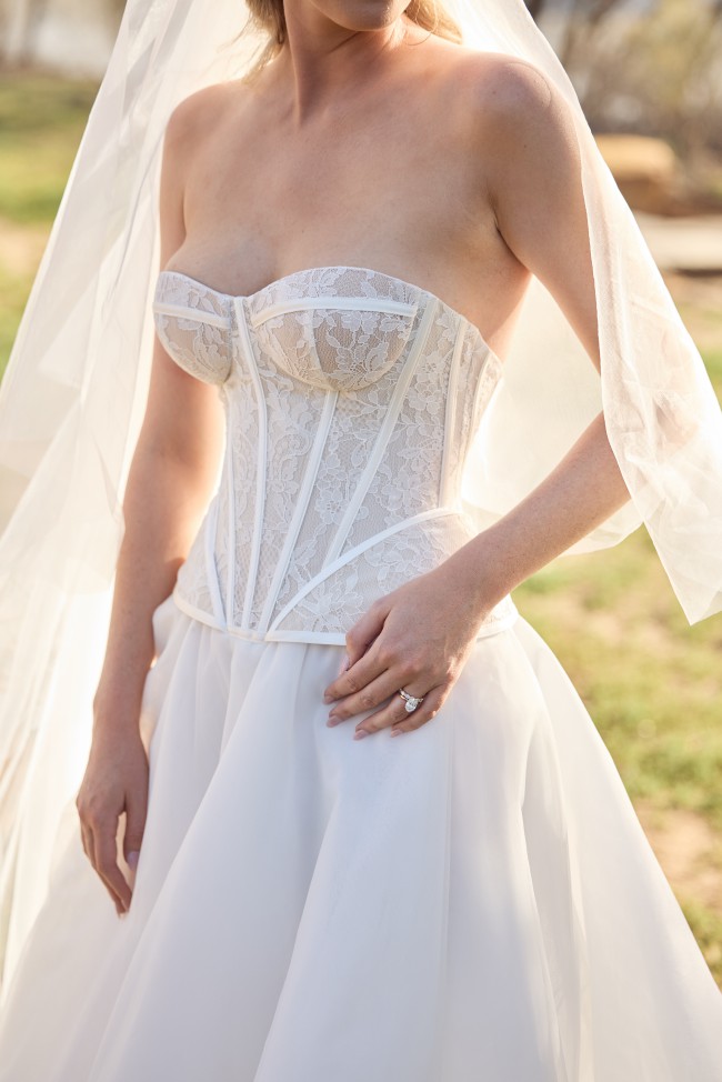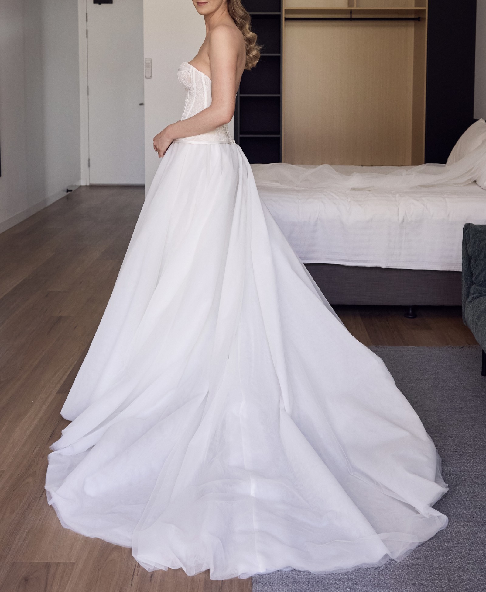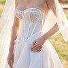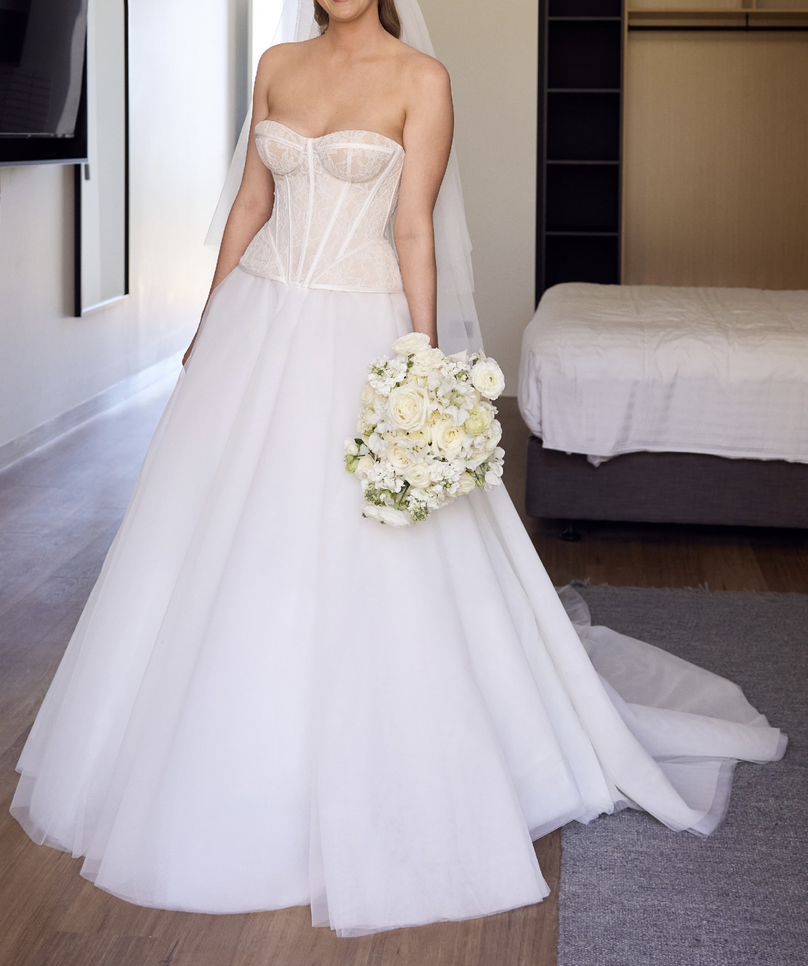Beautifully detailed and embroidered heart-shaped neckline corset with pleated tulle skirt. Worn for a few hours at my wedding ceremony, then changed into a second dress for the reception. Wedding dress has been dry cleaned and is good as new.