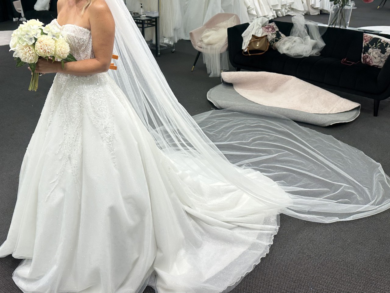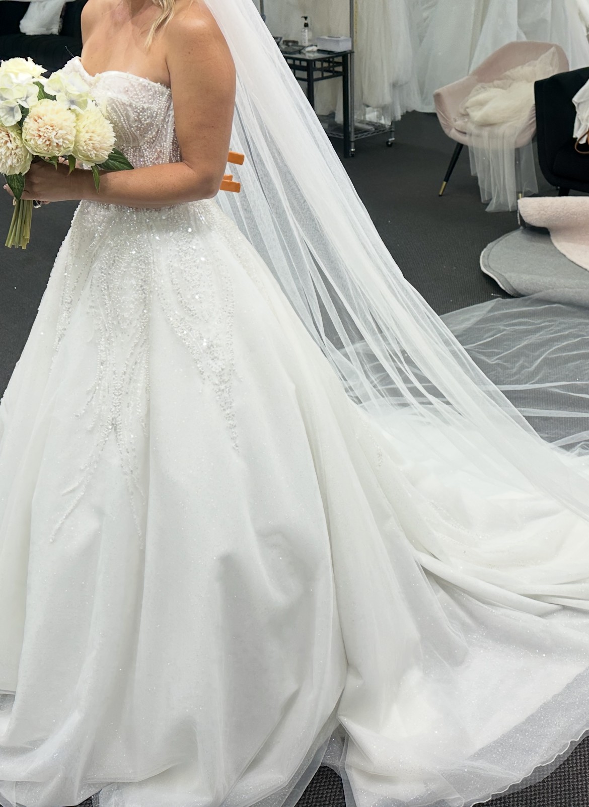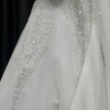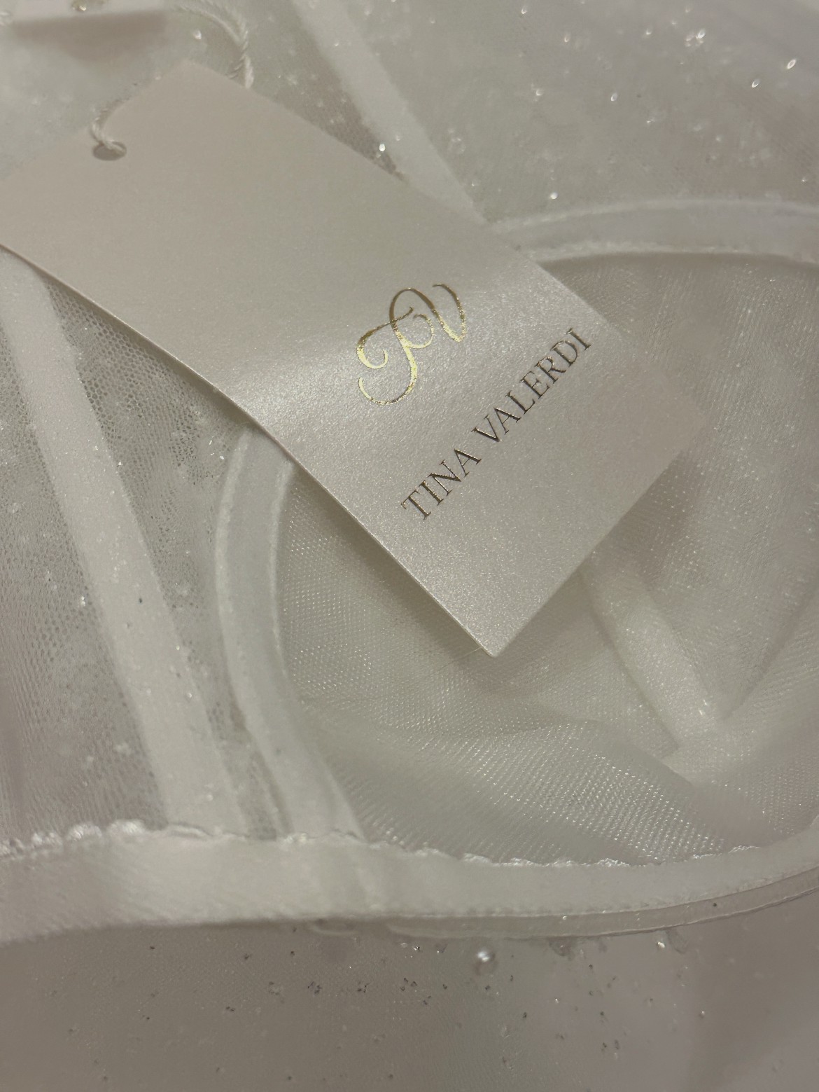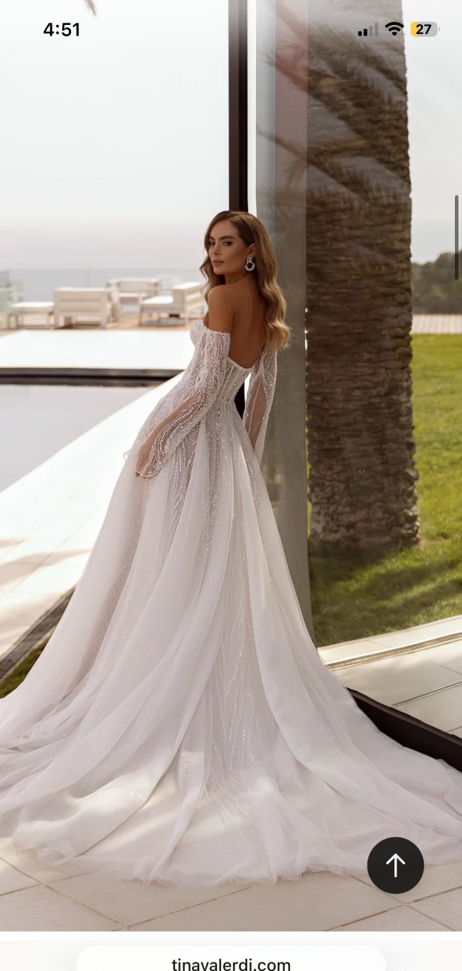 This Maggie Ivory wedding dress by the renowned designer Tina Valerdi is a breathtaking representation of elegance and romance. Crafted from delicate tulle.