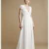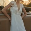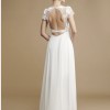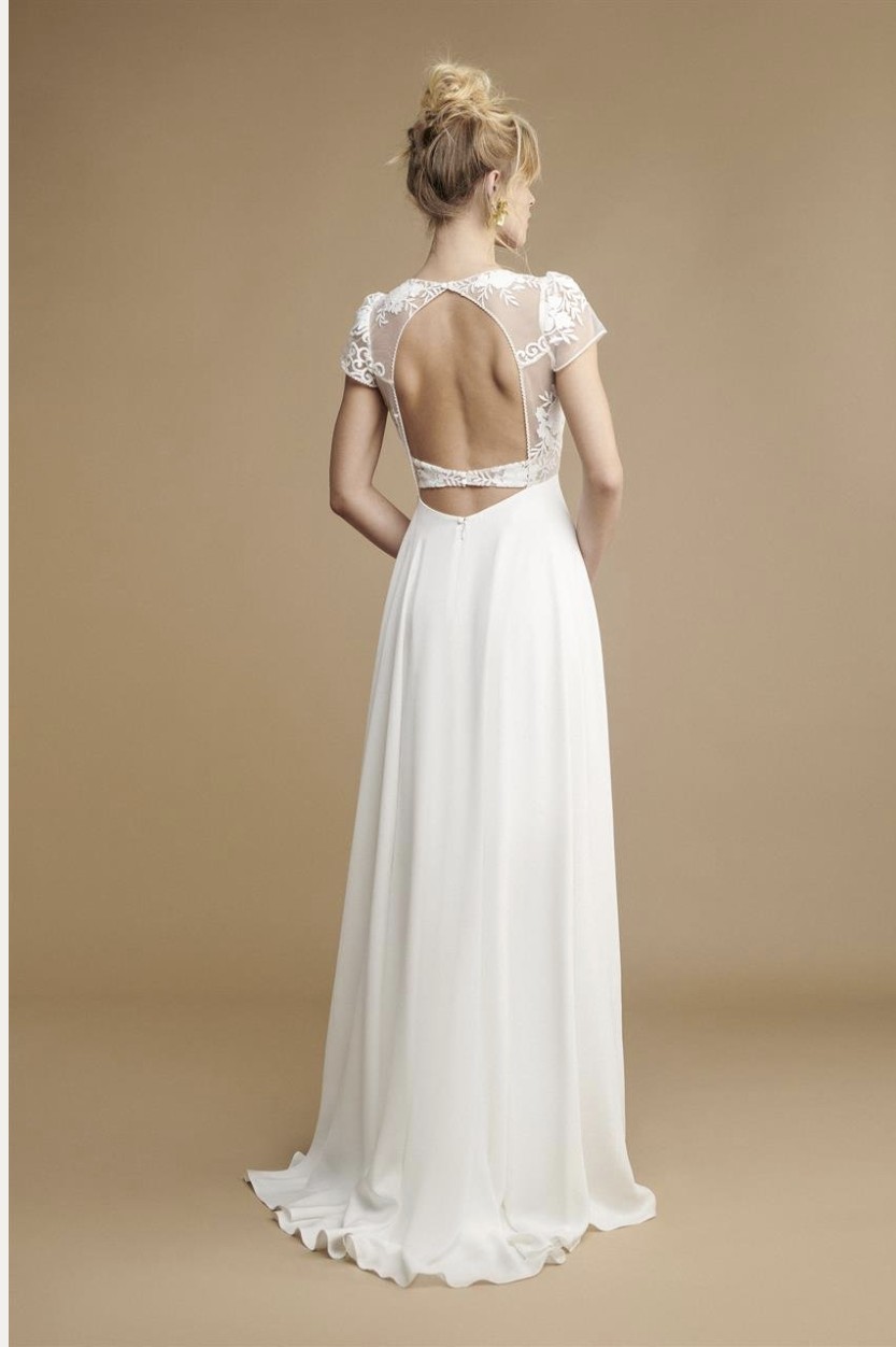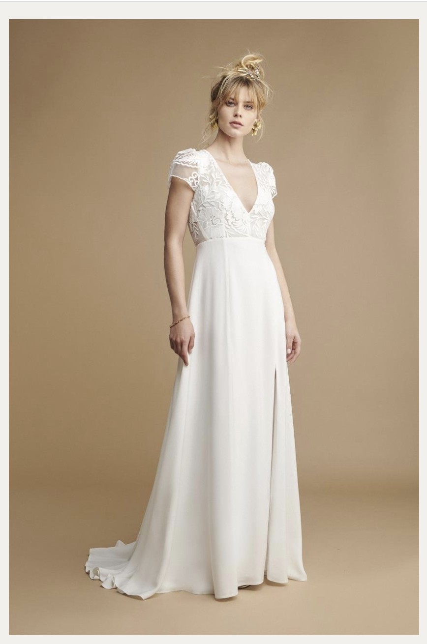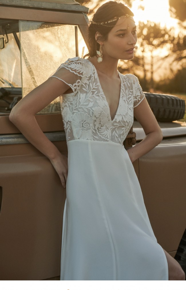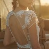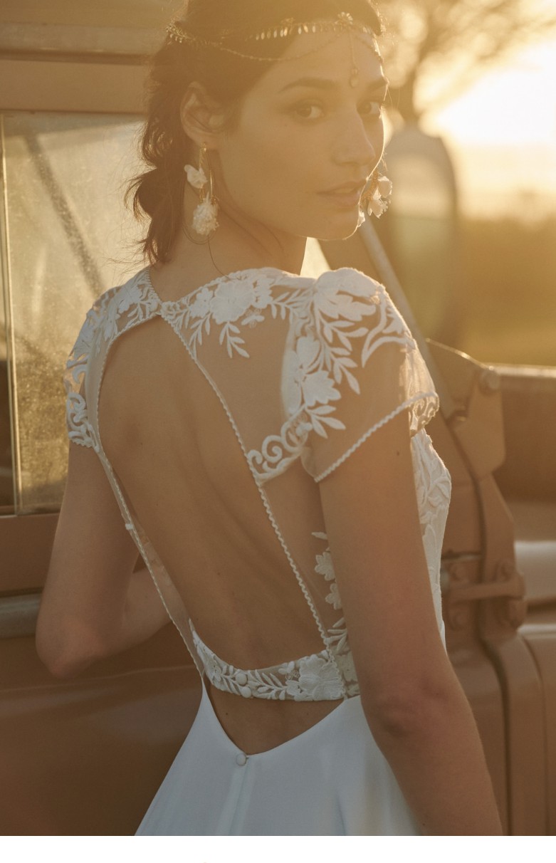 Magistral is a dress full of romantic details. The top is made of lace with transparency, short delicate sleeves and a V neckline. The back is open and has a strip of embroidered lace across the lower back. The skirt is high on the waist and is made in chiffon, with a train and a split on the left. The train is an elegant and manageable length. There is a bustle already fitted to allow for much time on the dancefloor. There is also a little wrist bustle so you don't have to bustle up. Really flattering fit and fabric. This dress is perfect for a spring or summer wedding and feels very light on.