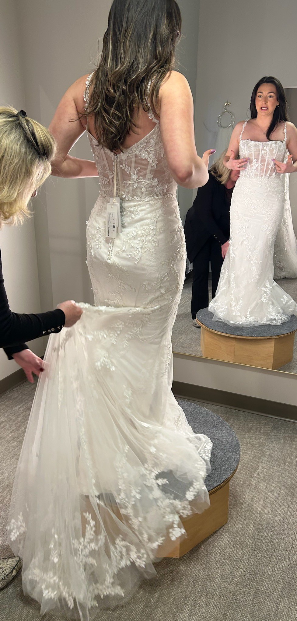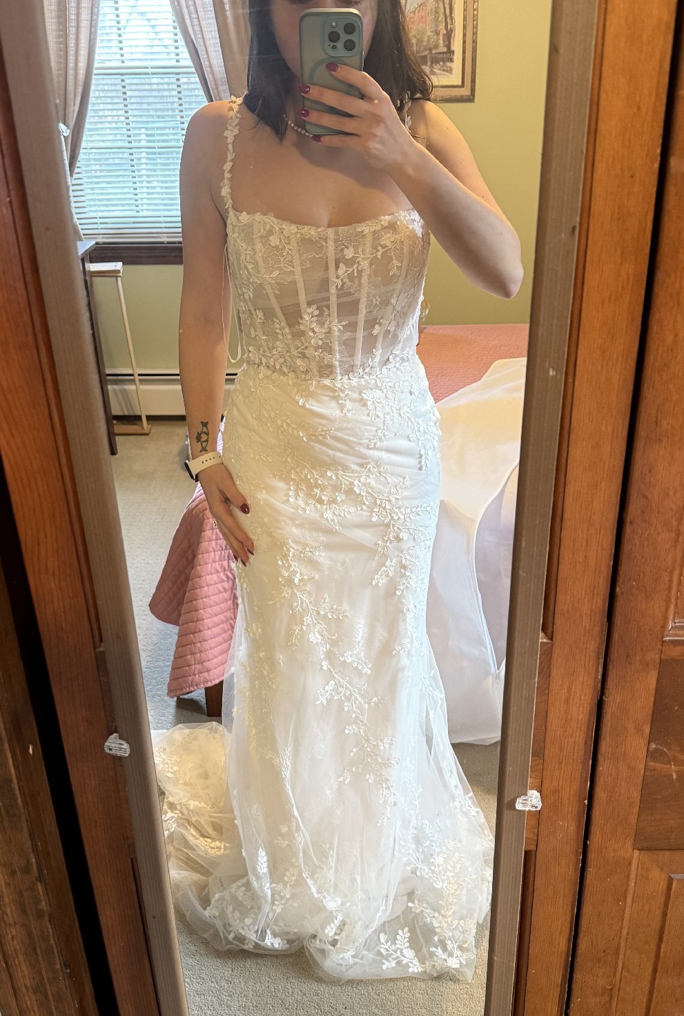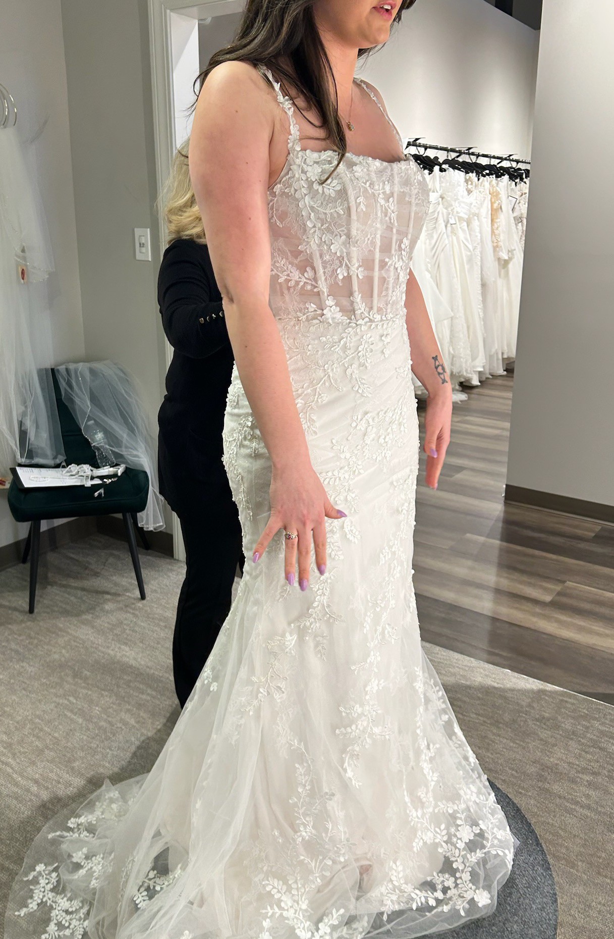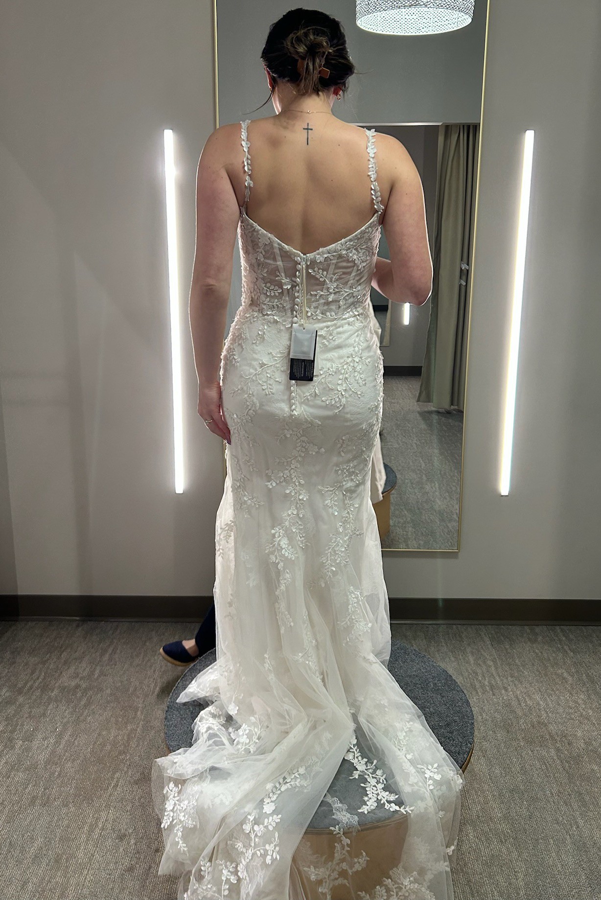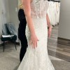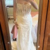 Brand new with tags still attached, this dress is unaltered! Only selling because I ended up going with another gown. I am a street size 4-6 and this bridal 10 fit well with a bit of room. The dress is very lightweight and easy to move in. The underskirt fabric is stretchy and very soft. The floral straps add such a dainty touch! Absolutely gorgeous and will make a bride look ethereal on her day!