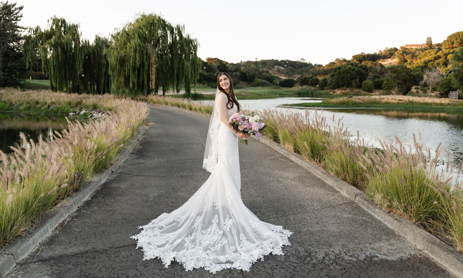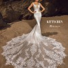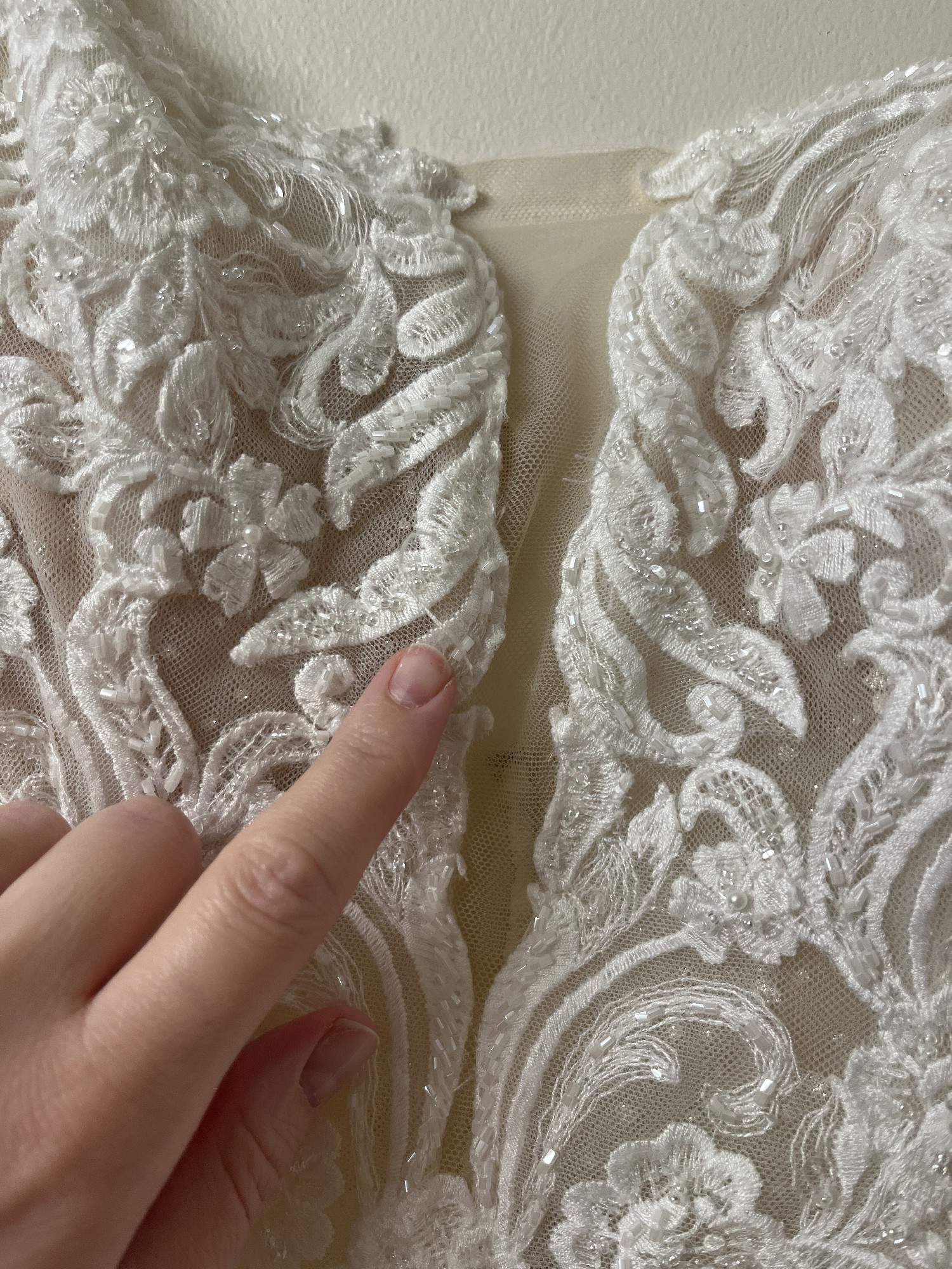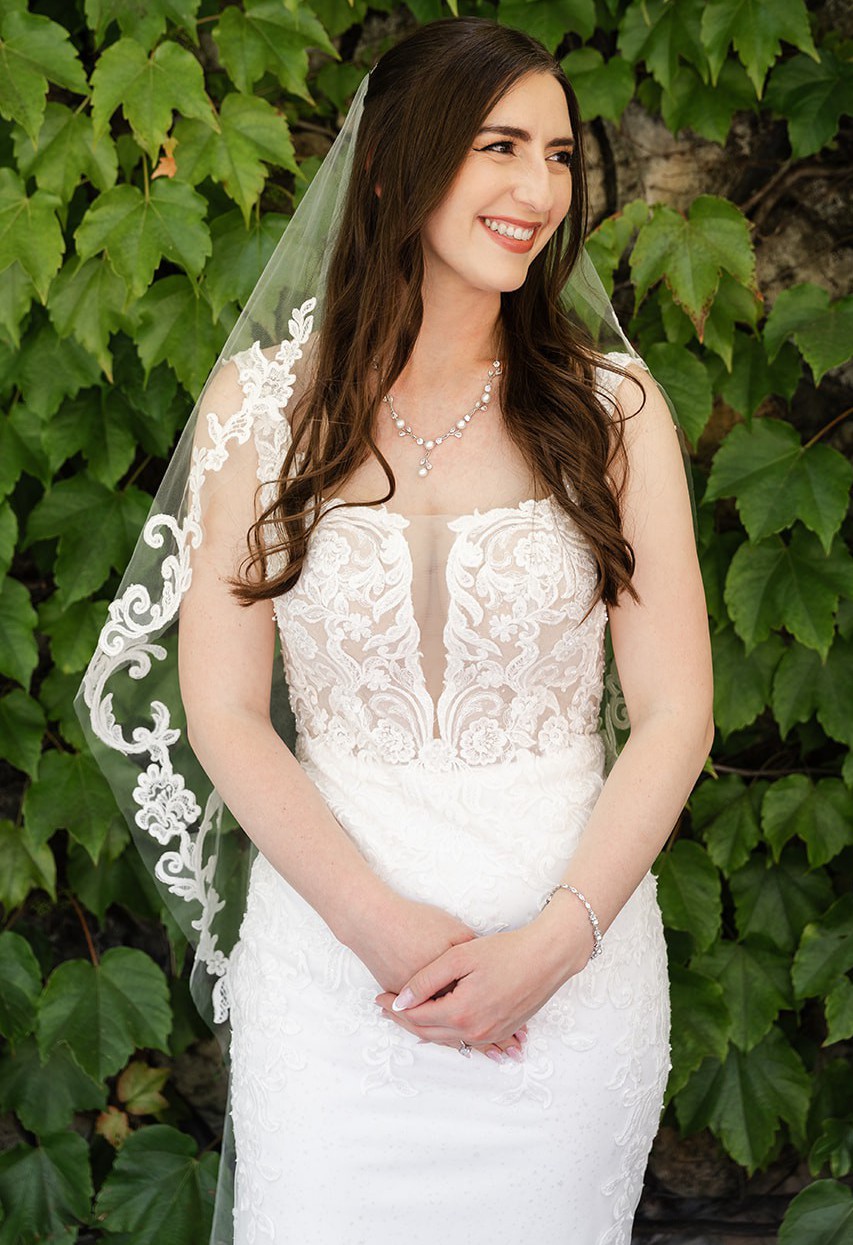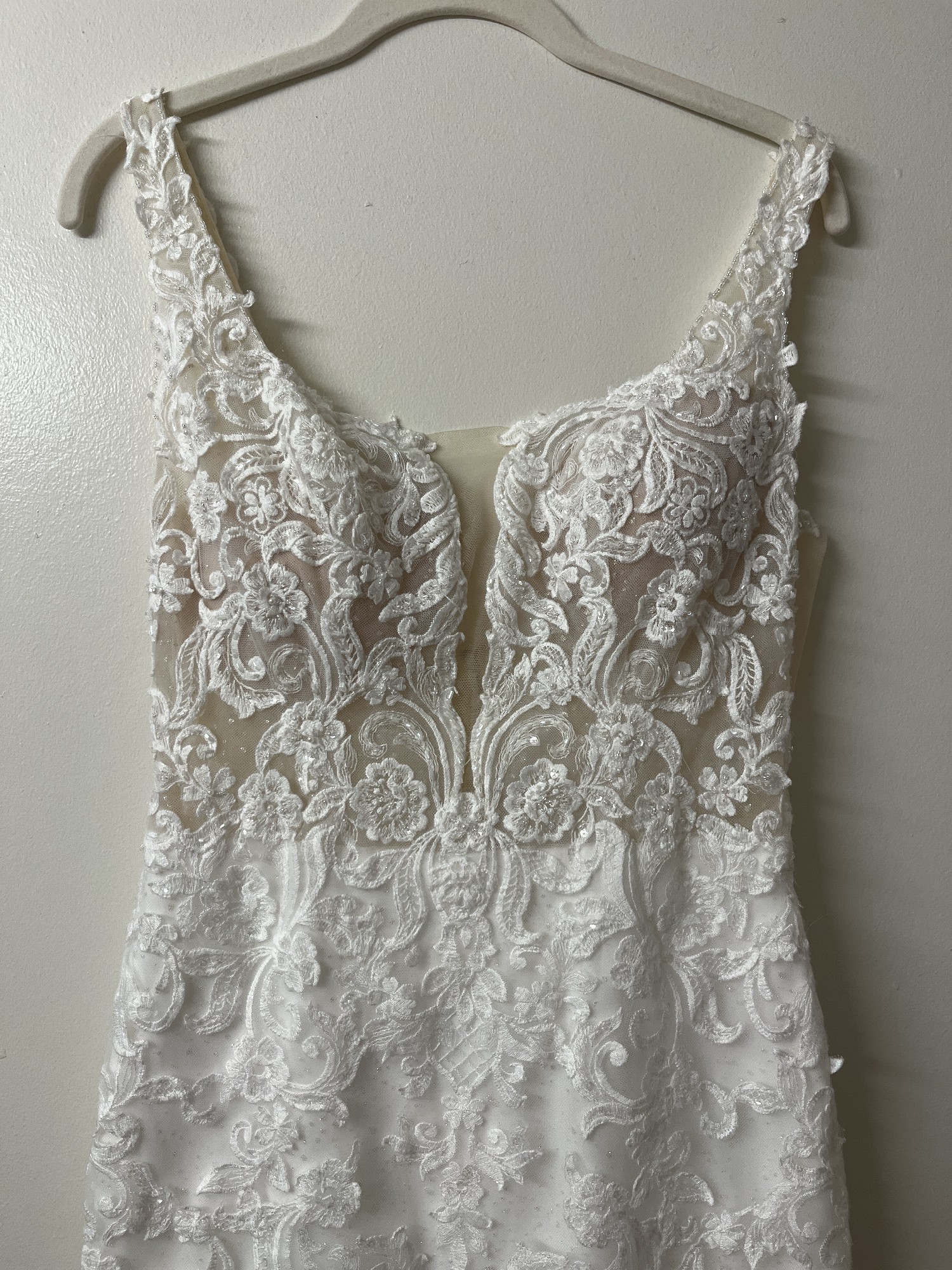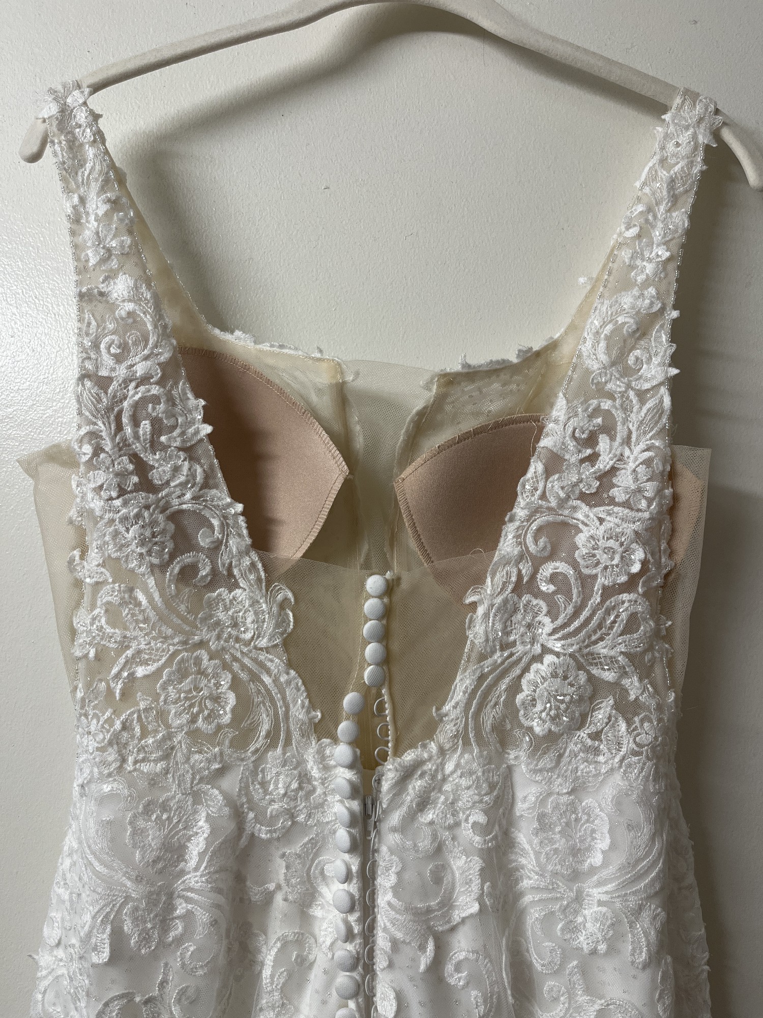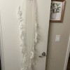Kitty Chen Olivia wedding dress, wore for my wedding in June 2025 and has been professionally cleaned. Matching veil is included with gown. Veil is hip/bottom length(see photo). Dress has not been altered at the bottom at all in terms of length. I am 5’7 and the length was great with 3-4 inch heels. Waist has been taken in slightly for a more hourglass shape as this is a fitted gown. Breast cups inside dress will need to be replaced to match your size or sewn back in during alterations as they are coming undone from dress cleaning. A few loose threads on the dress from wear (see photos). Some small holes in bottom inner layer of dress from bustle, holes are not notice when dress is on as they are very small. I did pay the wedding dress shop to fix the bustle itself after my wedding so that should all be in tack. Please see photos and videos for more or feel free to message me!