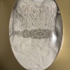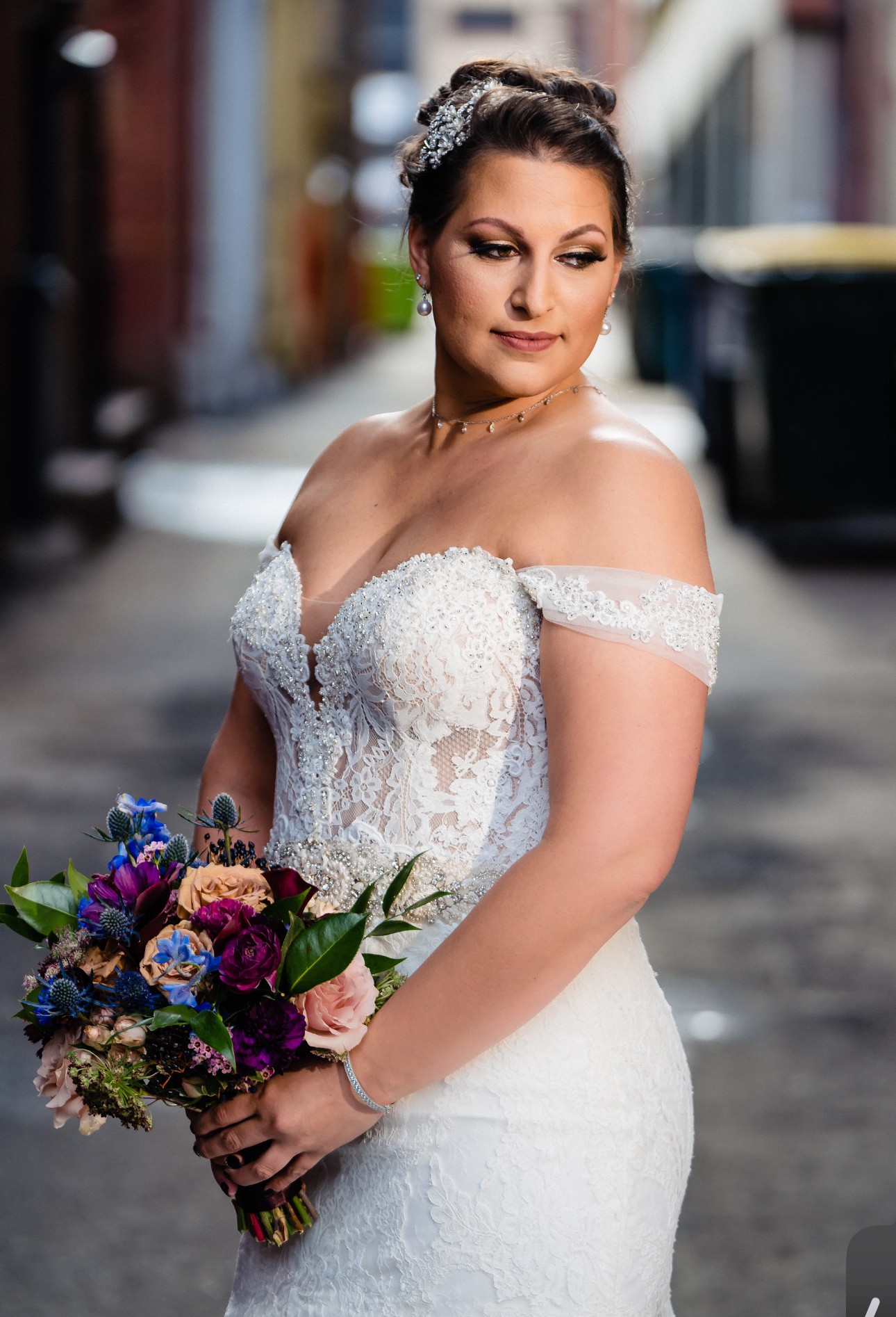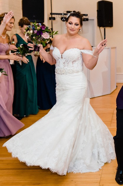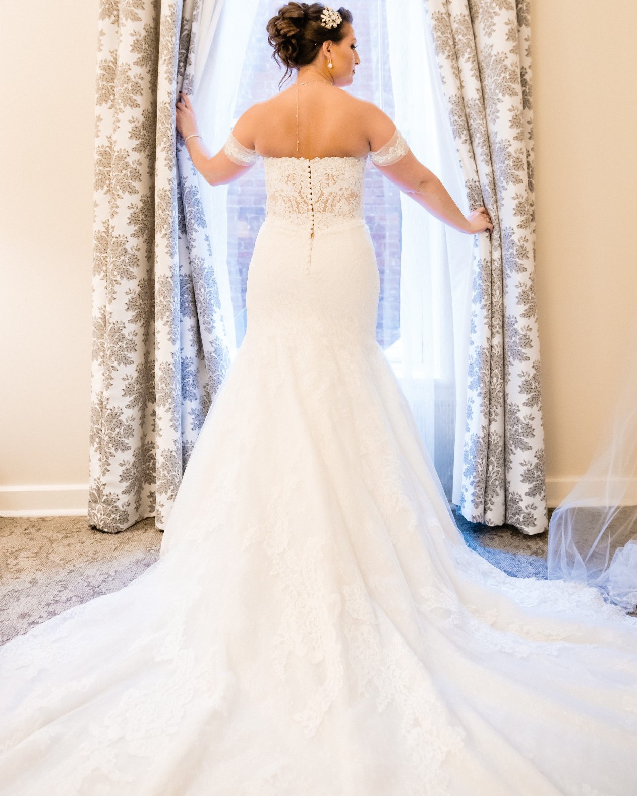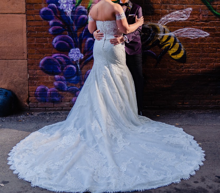 2019 Pronovias designer, off-white gown with beautiful lace appliqué detail throughout. The dress is cut in a fit and flare style, cinching at the waist, with a custom pearl/crystal belt sewn in to complement the bodice crystal details. The dress has a sweetheart neckline with a subtle plunge, and some peekaboo lace detail. Modesty/support cups (in a nude color) were sewn into the dress. There are small, sheen, removable, off-the-shoulder sleeves with beaded detail and buttons up the back. There is a long, lace train which can be bustled and the trumpet part of the bottom has some crinoline for added volume.