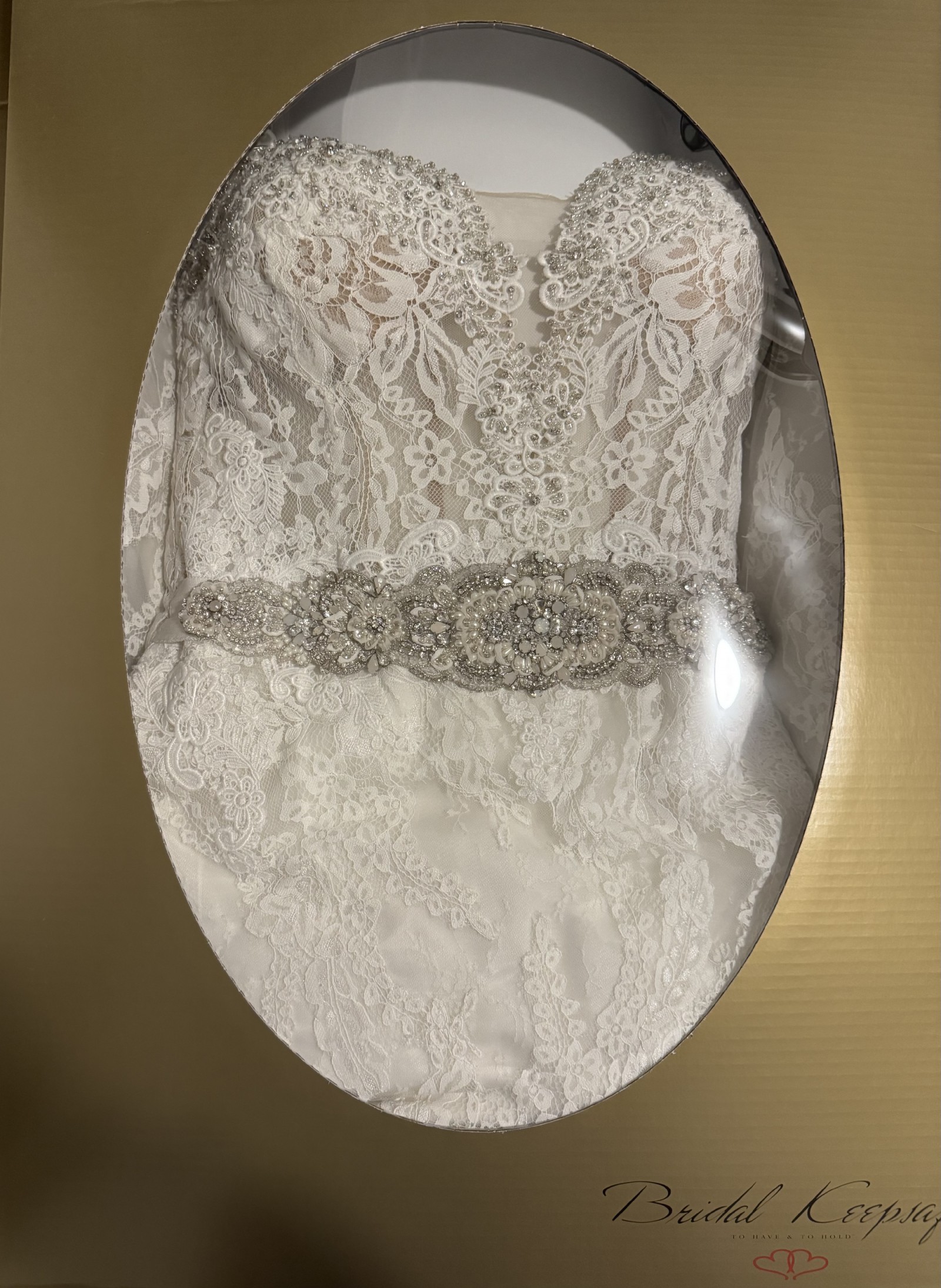 The dress was immediately dry cleaned and preserved by professional bridal cleaners and was stored in a bridal gown storage box, as seen in pictures.