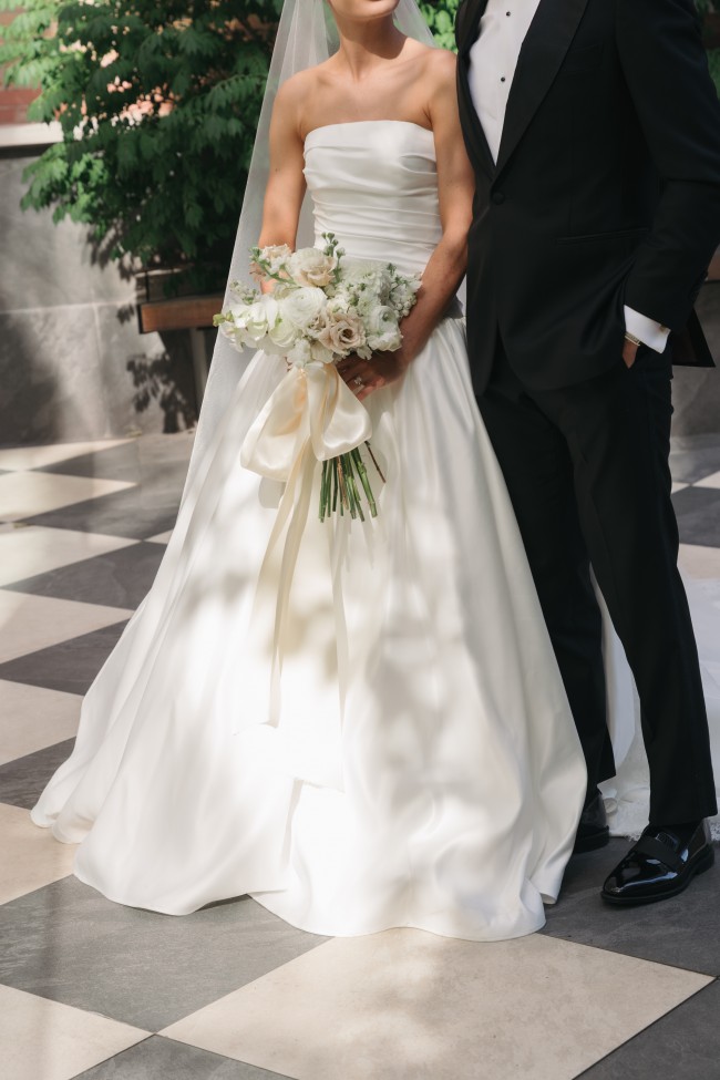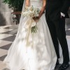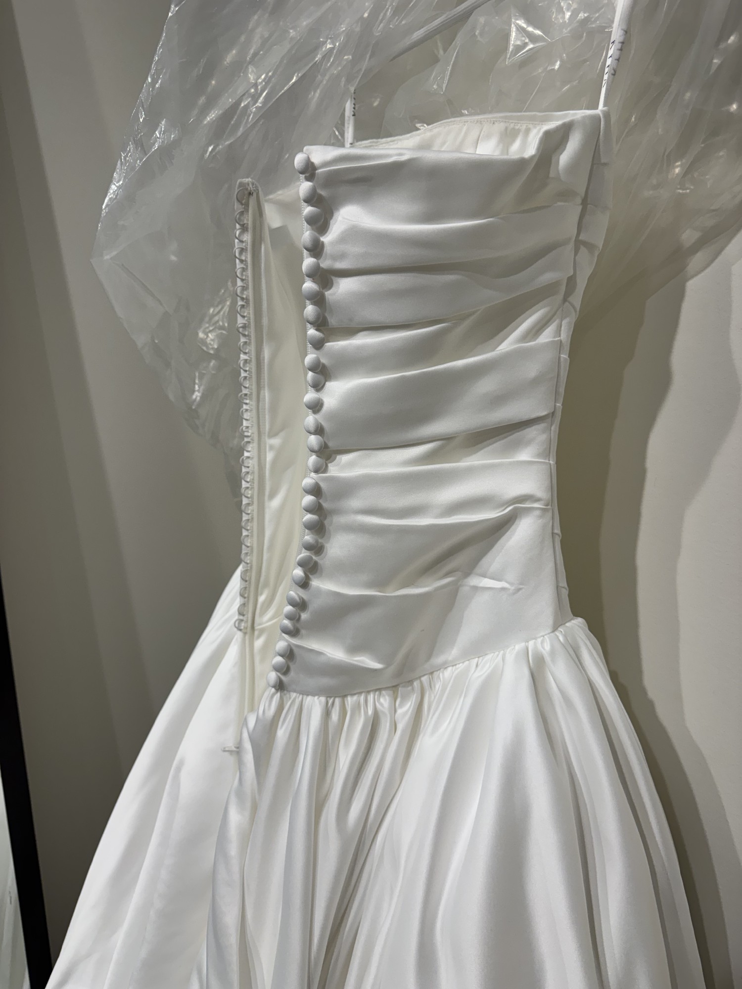 Kyha Lucky dress purchased January 2025 for my September 2025 wedding. Worn for a few hours and got it dry cleaned and looks like new. No alterations done other than I added a belt on the inside to make sure the dress wouldn’t move and added a bustle that you can’t even see when bustled which I absolutely loved (as I don’t like the look of a bustle). I also added Kyha buttons ($800 CAD value) at the back and got the dress hemmed to my height (I’m 5’4 and wore 4.9 inches platform heels).