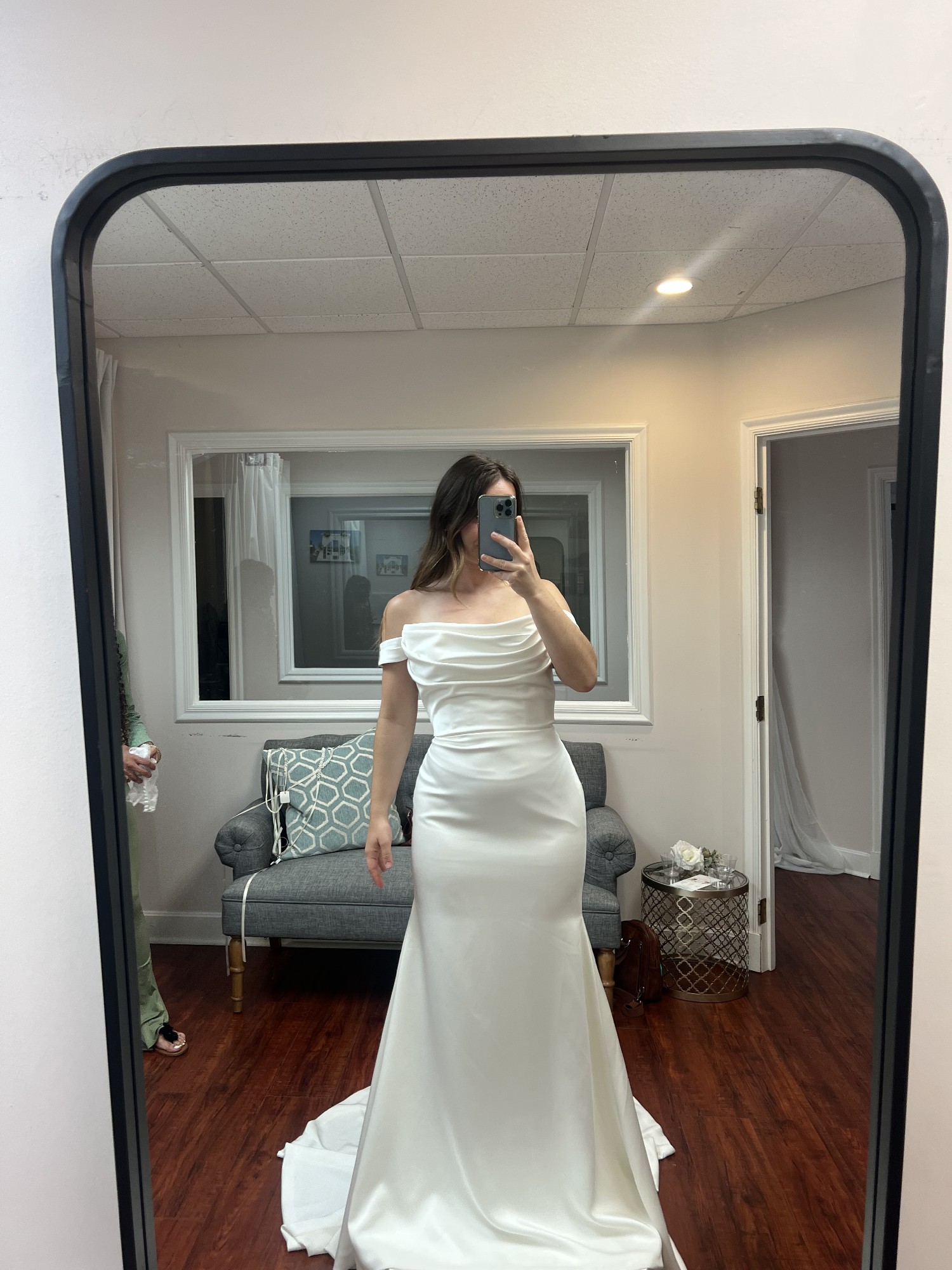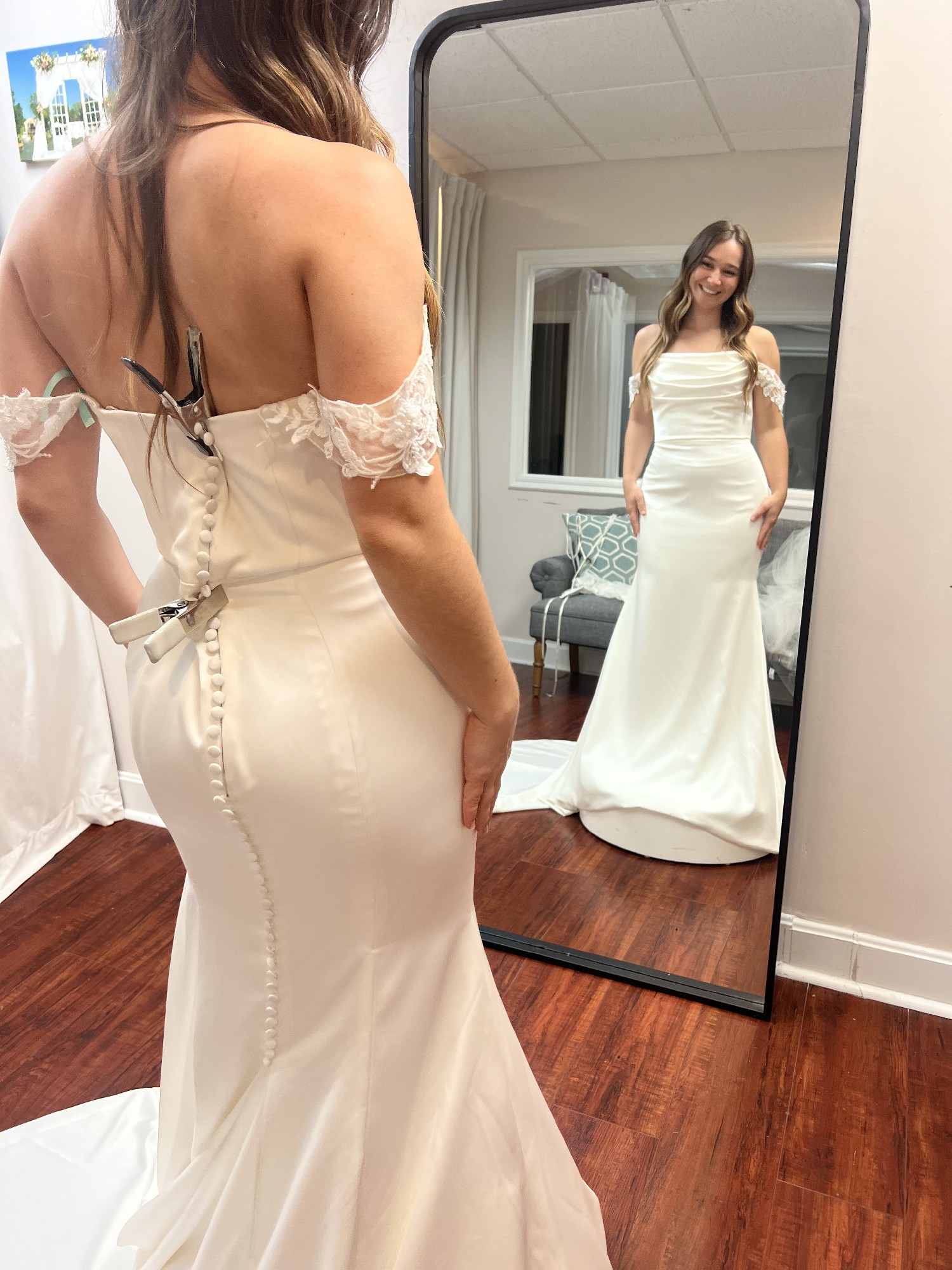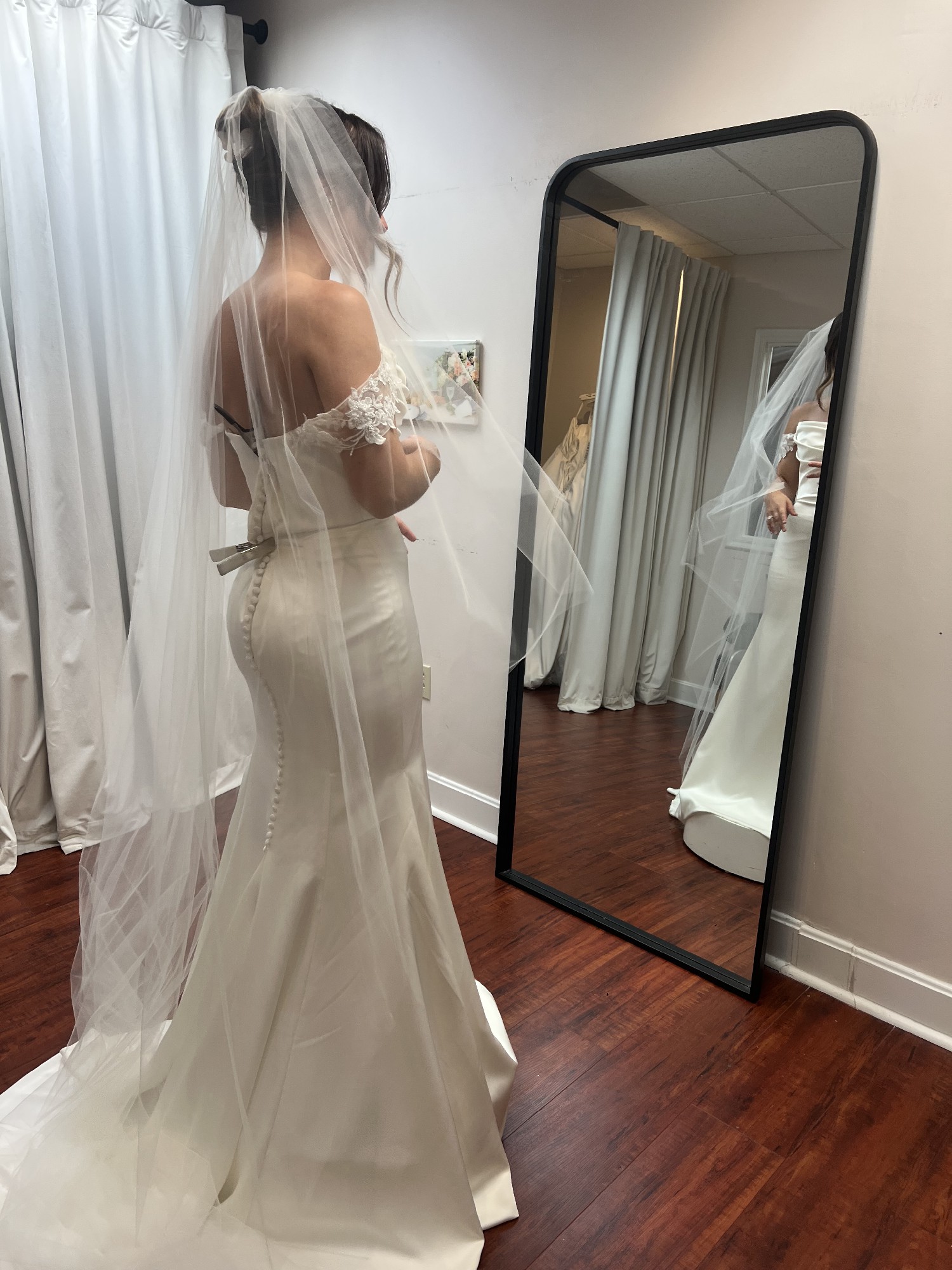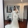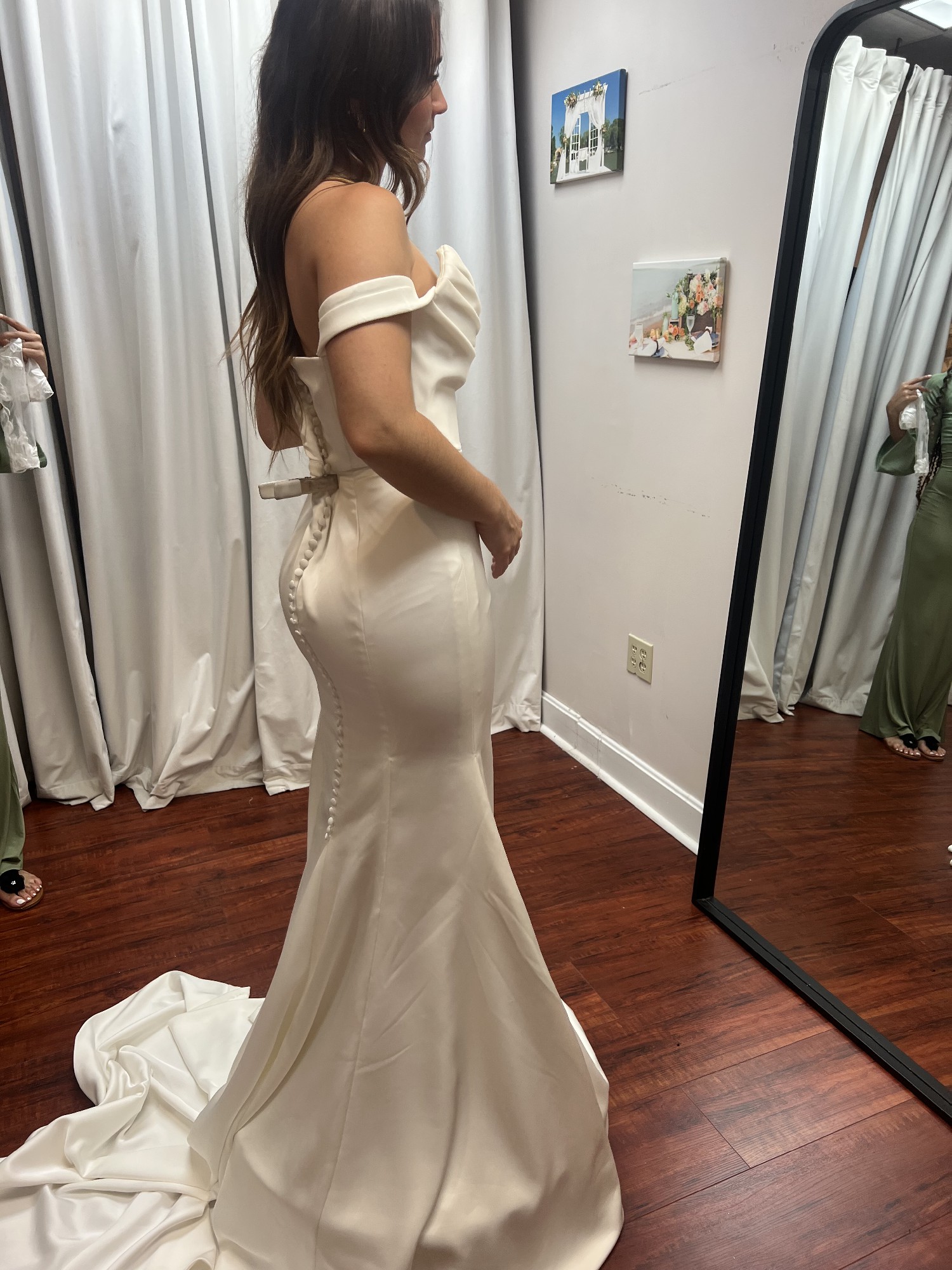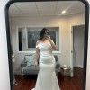 The dress has never been worn outside of trying it on, so it’s in stunning condition. The Gwinn is a strapless gown with a scooped neck that hugs your body so beautifully. There is a corset strap in the middle so it makes you feel and makes you look snatched. The buttons go down the back of the dress which adds gorgeous detail before the flare. The charmeuse fabric feels comfortable and soft, and easy to move in (perfect for dance floor!) I decided to go with a different style after all, so it’s never been worn! It’s been cleaned and steamed and comes in the original bag. Note: the straps are not included or part of the original dress. I’m open to offers!!