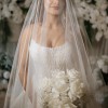 The silhouette is both elegant and romantic, gently hugging the figure before flowing into a soft, dreamlike train that trails behind like a cloud of light. Its soft white hue, combined with the radiant crystal detailing, creates a look that is timeless, majestic, and effortlessly show-stopping.