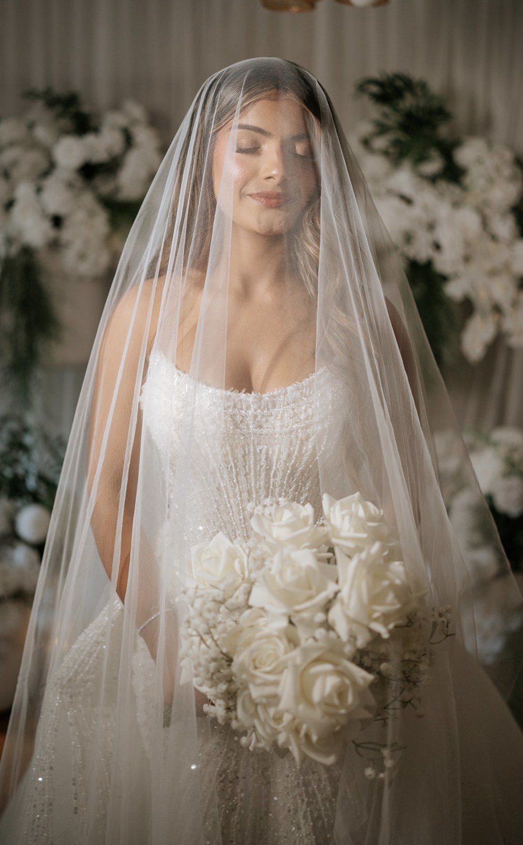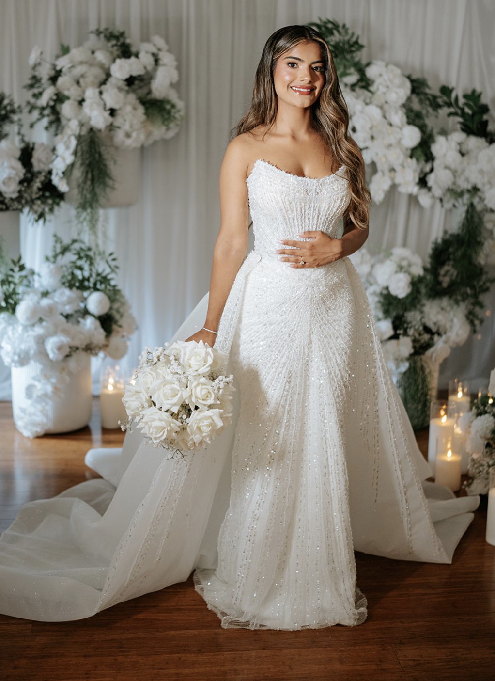This gown sparkles with every movement, catching the light like a thousand tiny diamonds scattered across snow. The intricate beading cascades down the bodice and skirt in delicate, shimmering patterns, giving the dress an ethereal glow that feels straight out of a storybook.