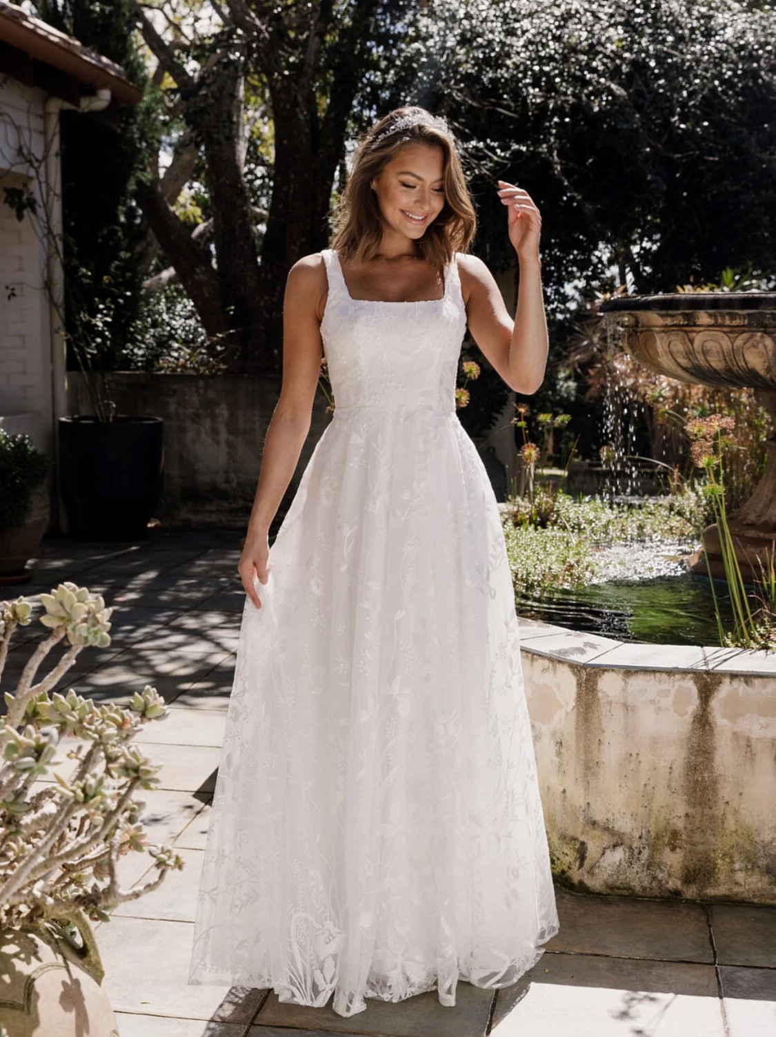 This is a beautiful white tulle dress that was so comfortable to wear and made me feel so special. The A-Line silhouette gently flows while the square neckline adds a touch of elegance. The pockets are a welcomed bonus.