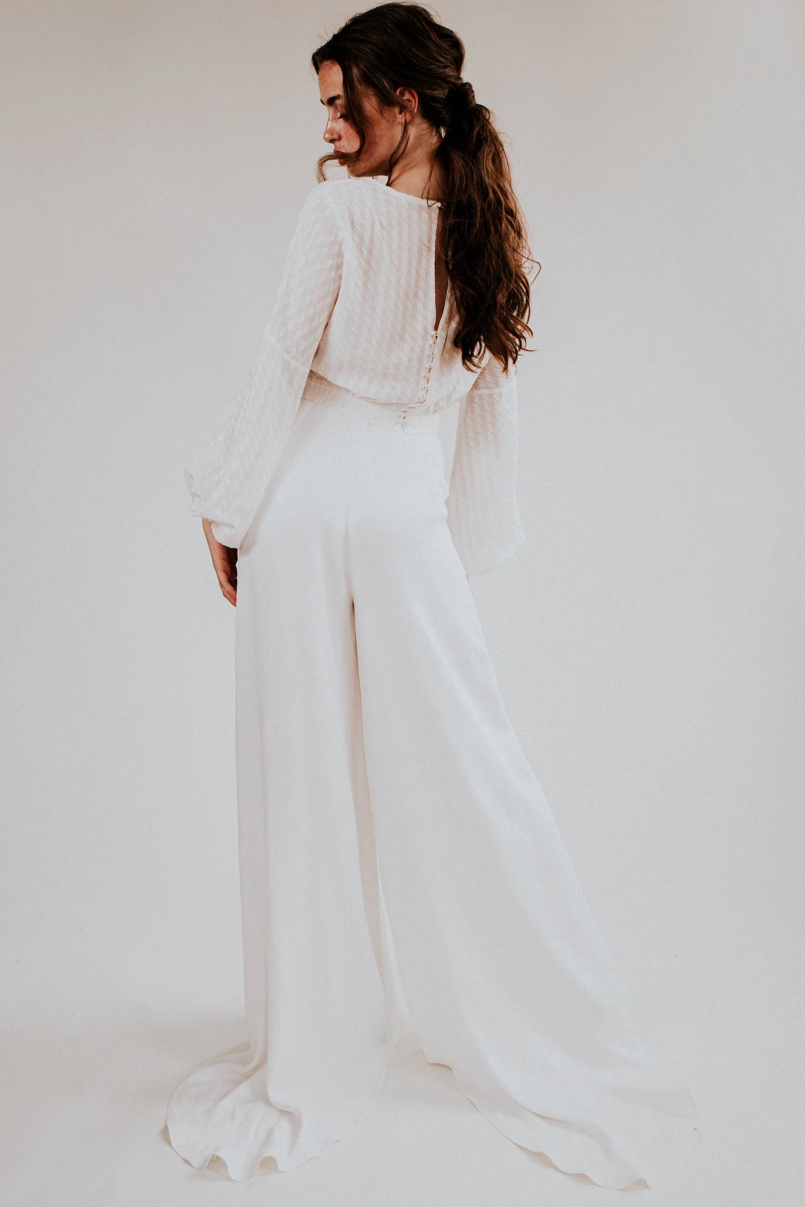 Length at the back of the trousers are longer (111cm from waist to hem) to give that train effect.
