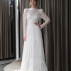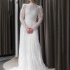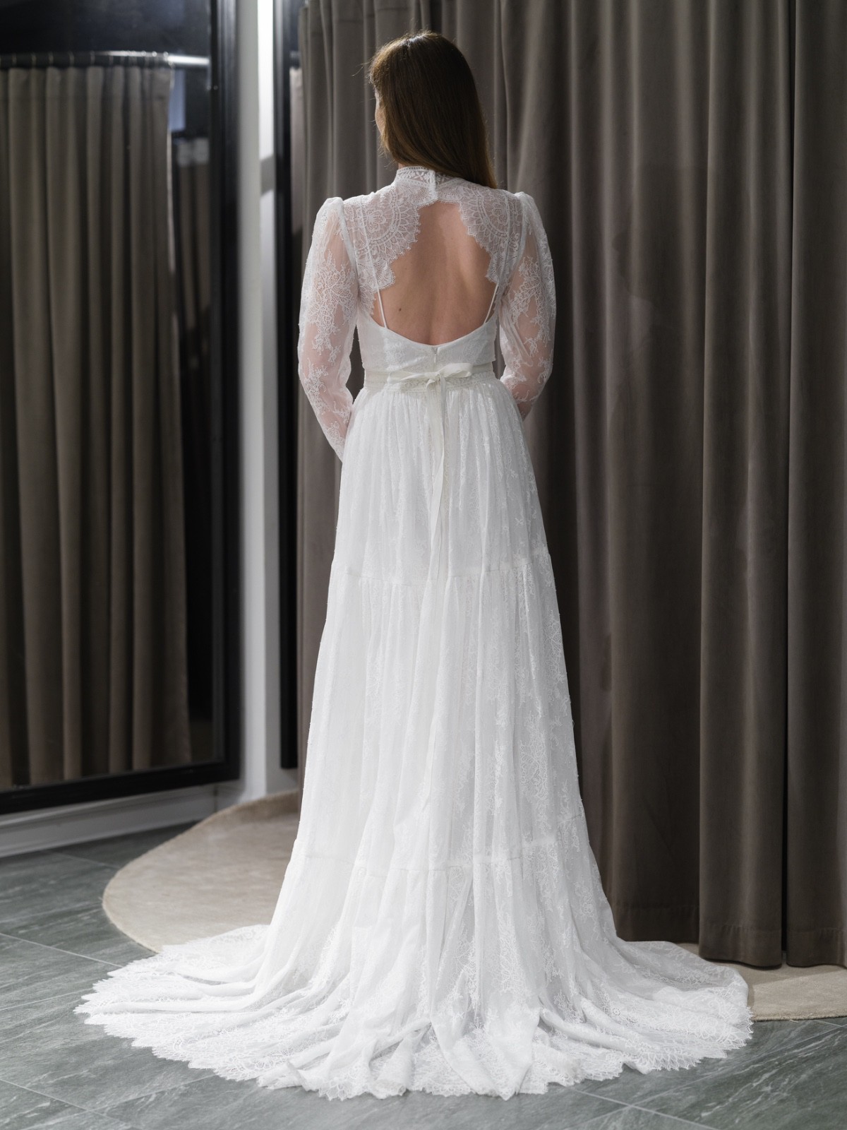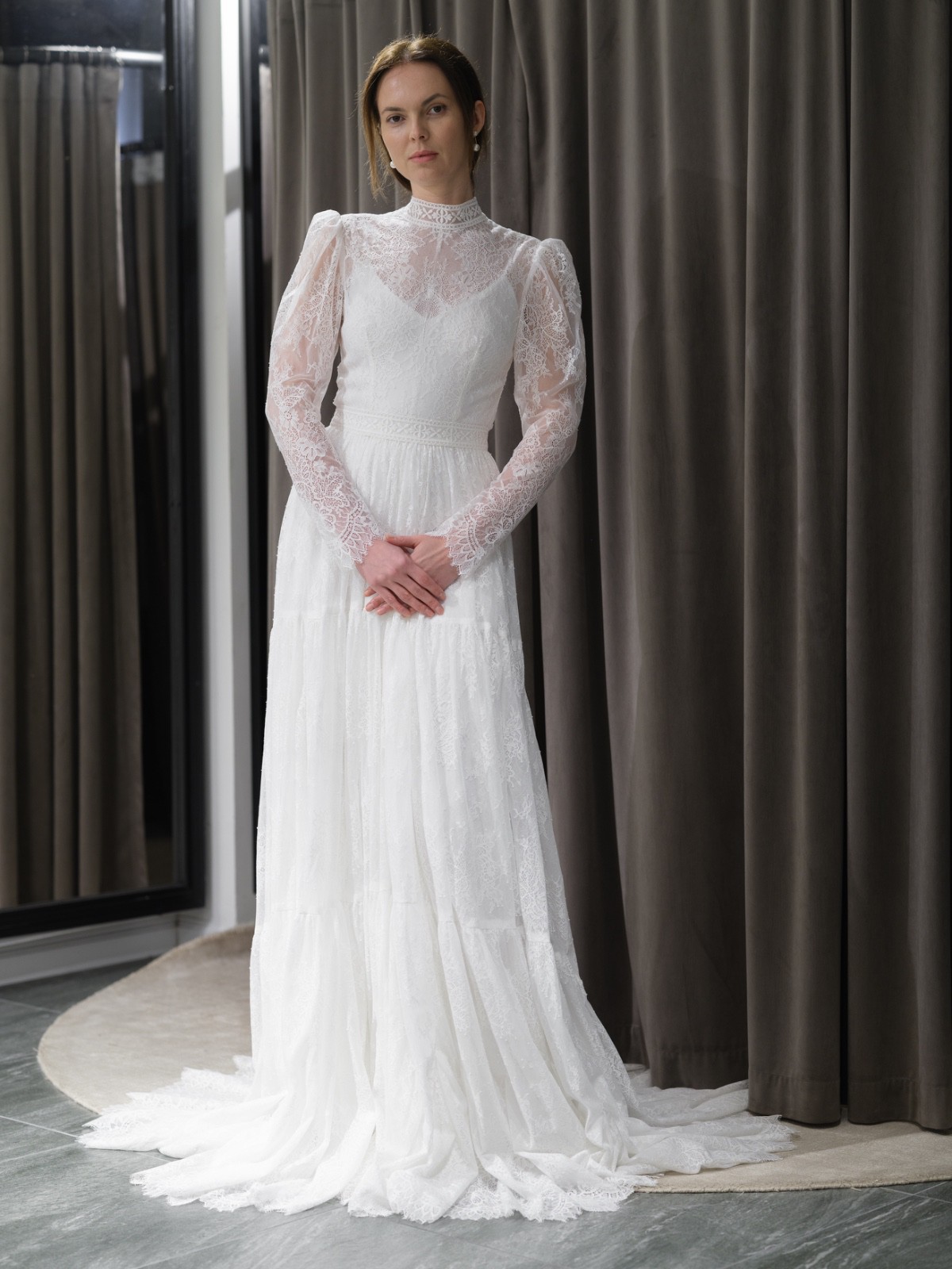Elegant all-lace gown with a high neckline, long sleeves, and a chic keyhole back. Comes with the original slip.